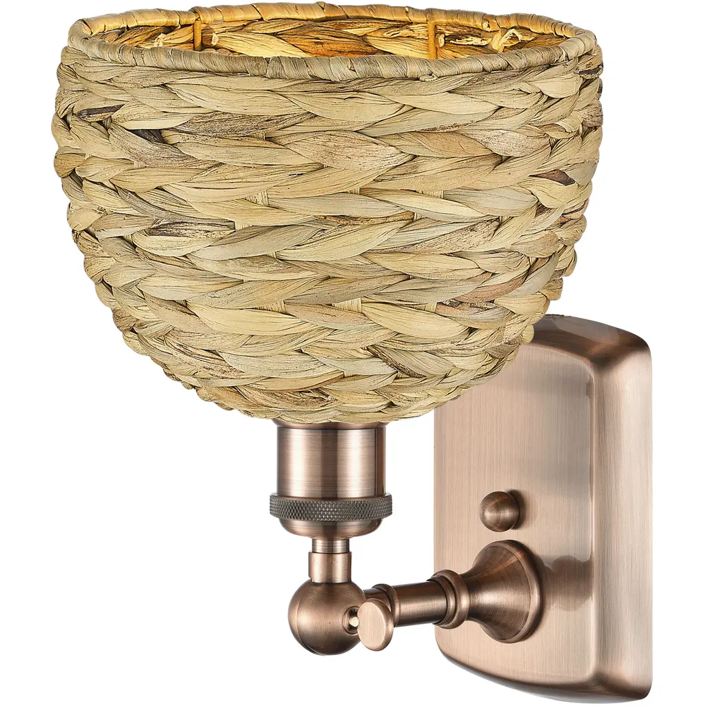 Woven Rattan - 1 Light 8" Wall-Mounted Sconce - Antique Copper Finish - Natural Shade