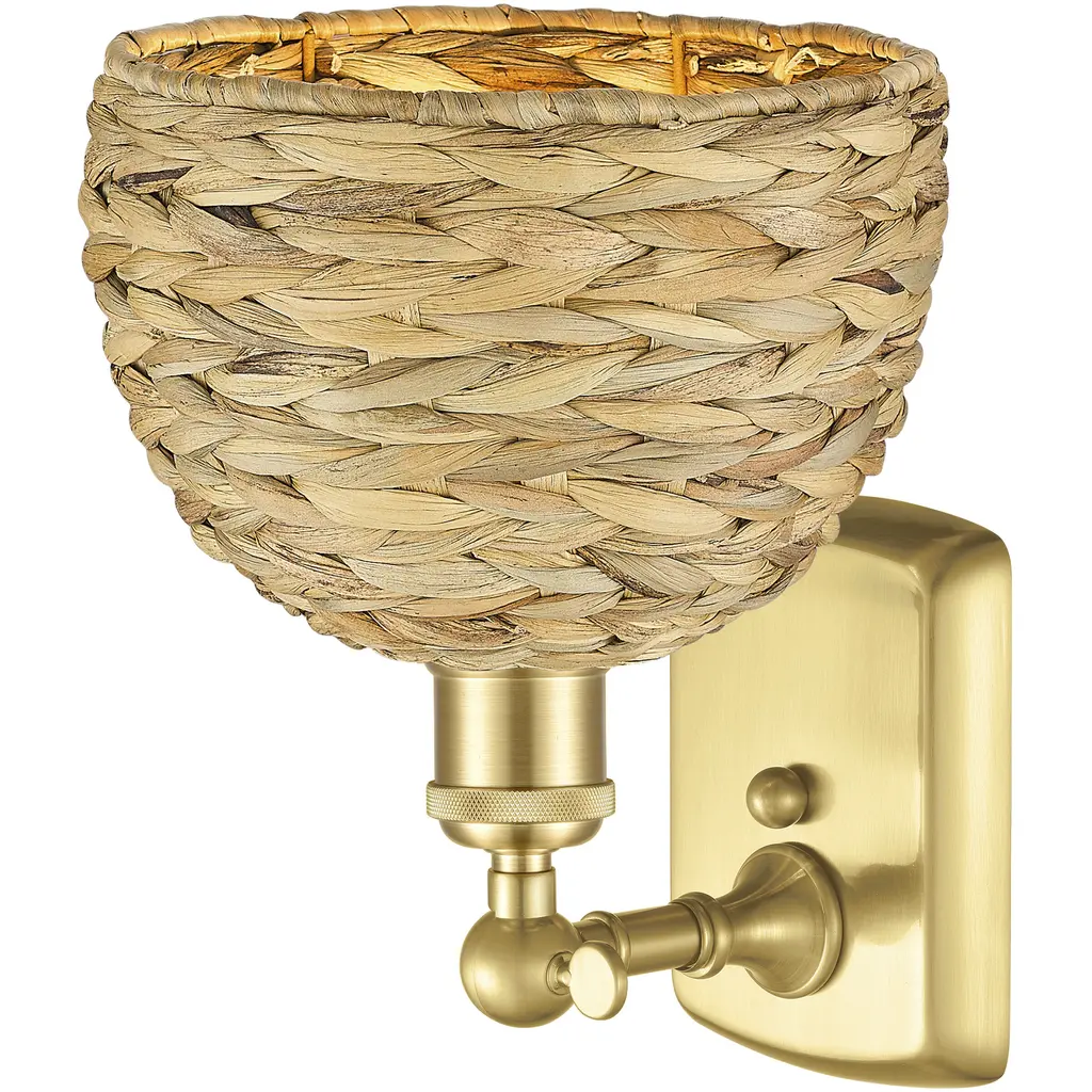 Woven Rattan - 1 Light 8" Wall-Mounted Sconce - Satin Gold Finish - Natural Shade