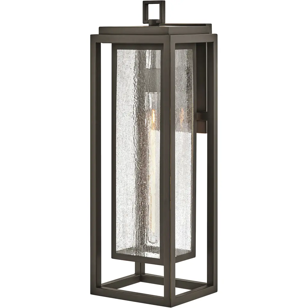 The Wright Medium Outdoor Wall Sconce in our Twelfth Street collection of outdoor lighting is similar to our Tanzy sconces but with an added armature surrounding the fixture to bring it an arts and crafts feel. It features a high-performance, weather-resistant Trilux finish that is fade resistant, crack resistant and rust resistant. We guarantee the finishes applied to our Twelfth Street pieces for five years. The metal on this black wall sconce in a midnight finish surrounds seeded-glass panes. It is certified for outdoor and damp locations, and we offer it in several sizes.