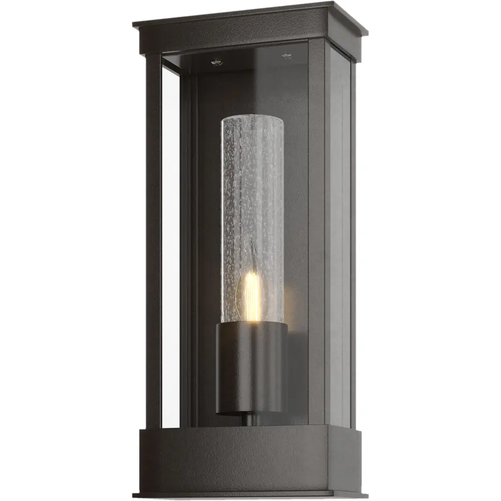 The Wright Small Outdoor Wall Sconce in our Twelfth Street collection of outdoor lighting is similar to our Tanzy sconces but with an added armature surrounding the fixture to bring it an arts and crafts feel. It features a high-performance, weather-resistant Trilux finish that is fade resistant, crack resistant and rust resistant. We guarantee the finishes applied to our Twelfth Street pieces for five years. The metal on this black wall sconce in a midnight finish surrounds seeded-glass panes. It is certified for outdoor and damp locations, and we offer it in several sizes.
