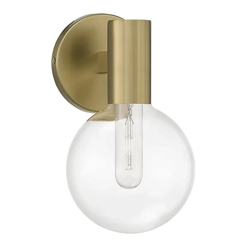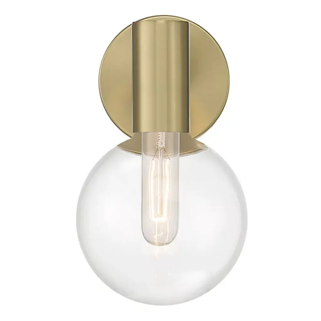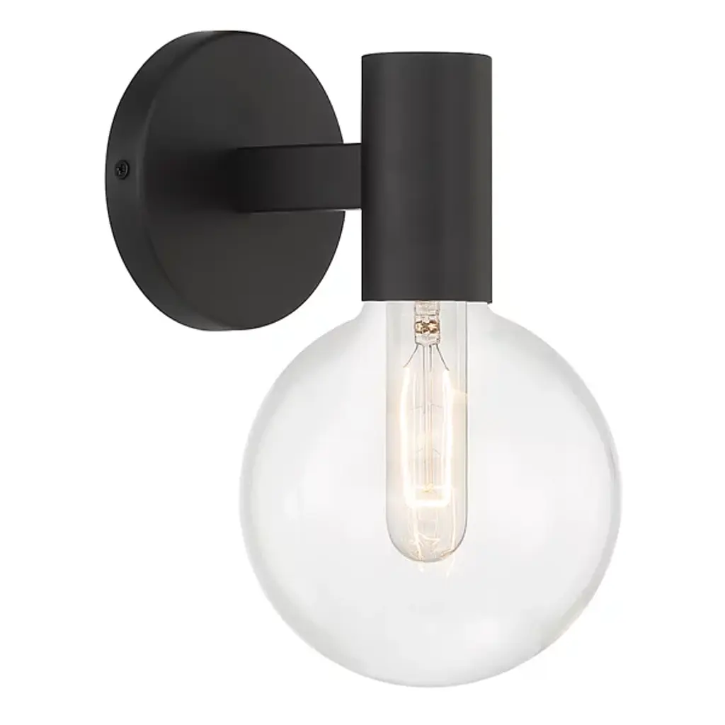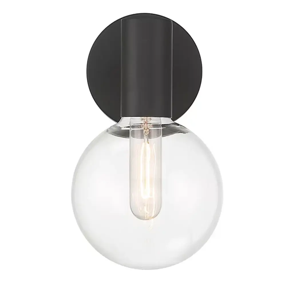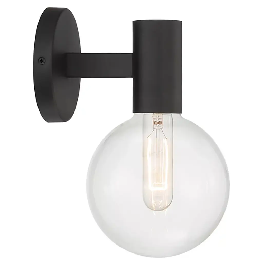 The Wright Wall Sconce brings expressive retro style to any space. Featuring a sturdy metal frame with a smooth surface, this wall light is accented by a clear globe glass shade that adds dimension while softly diffusing the light. The damp-listed design and clear glass allow this sconce to illuminate covered outdoor areas or bathrooms with its sleek look. From its round glass to its streamlined rectangular backplate, a combination of simple geometric shapes coheres into a single modern piece that casts a soft glow.