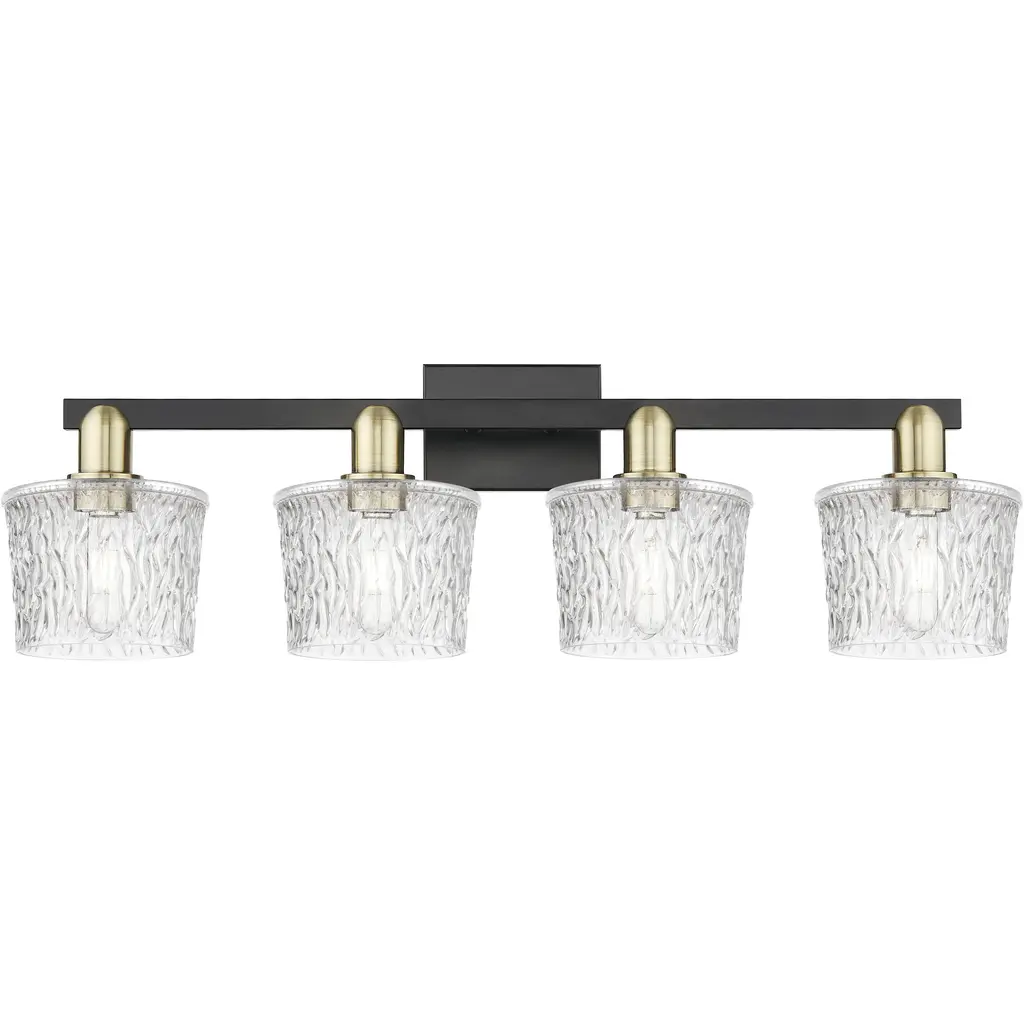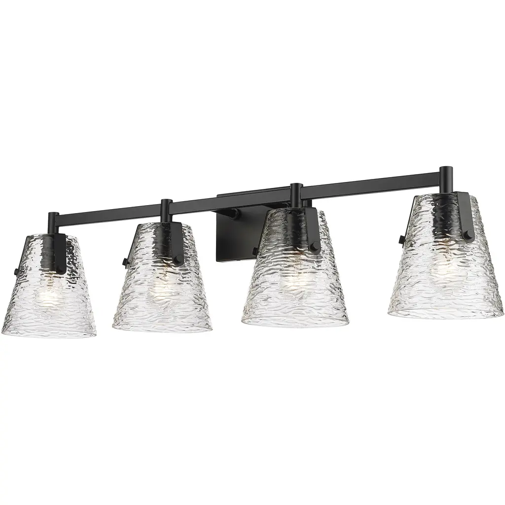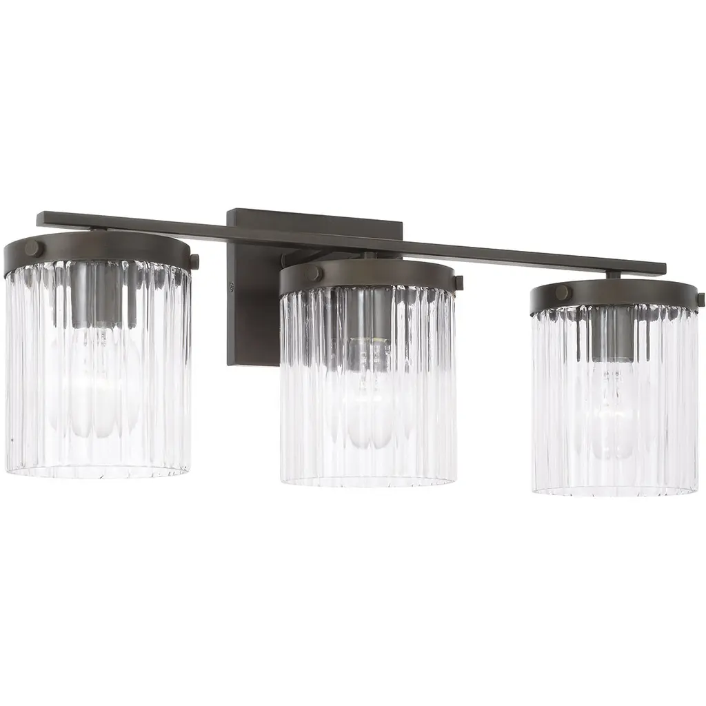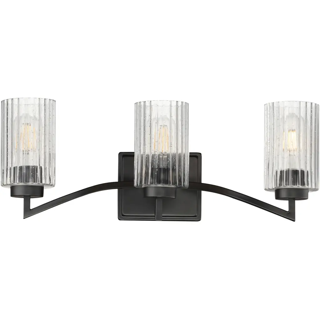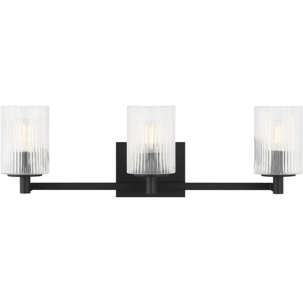 Deco-inspired shapes have industrial simplicity in this triple sconce. A robust carbide black finish is counterbalanced by the finesse of reflective nickel, and ribbed coupe-shaped shades add a texture that relaxes the look.