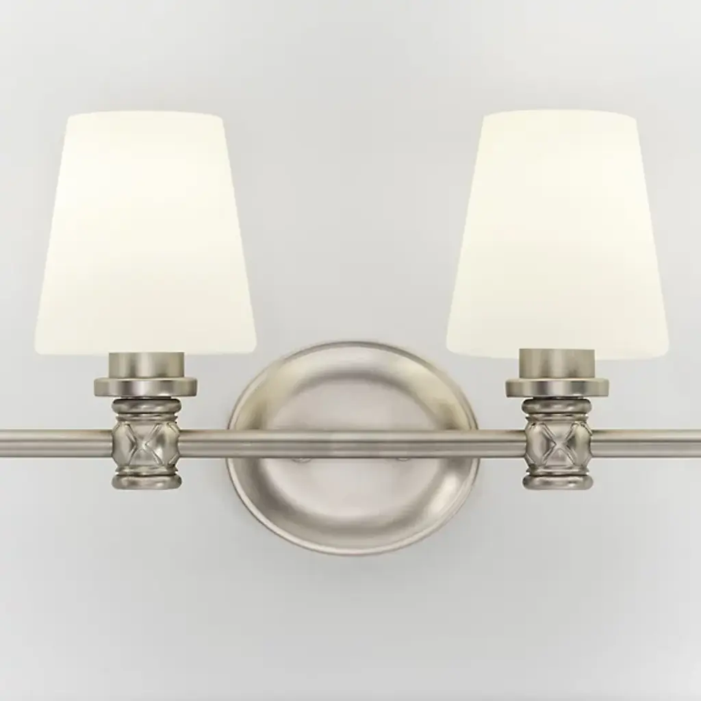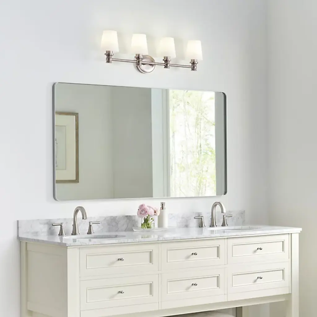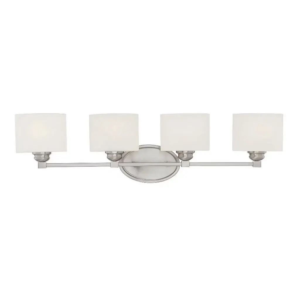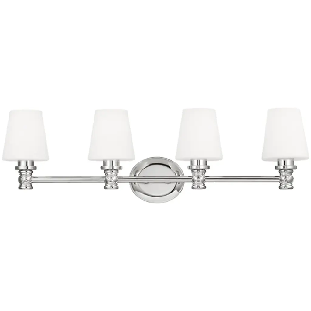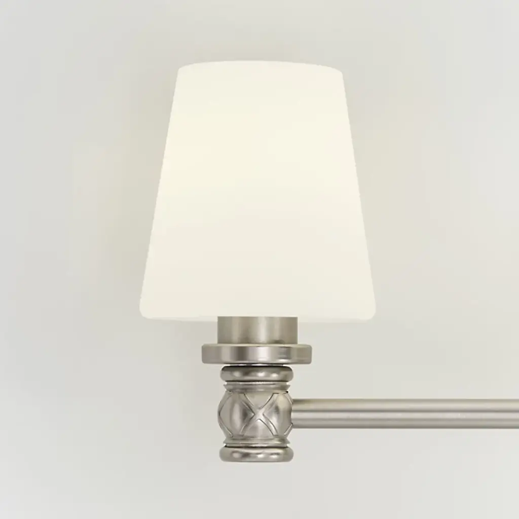 Perfect blend of form and function. Bring a sense of refinement to the bath decor by adding the Xavierre 4-Light Vanity Light by Visual Comfort Studio, formerly known as Sean Lavin. Boasting a smooth tubular rod, it carries four opal etched glass shades with closed bottoms to conceal the bulbs and wiring for a clean look. Subtle X-markings at the base add texture to an otherwise sleek exterior. Crafted from robust steel for durable, long-lasting usage in damp locations.