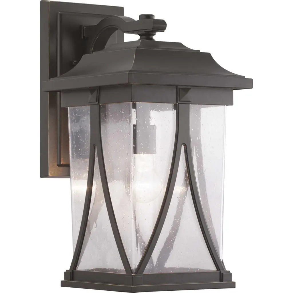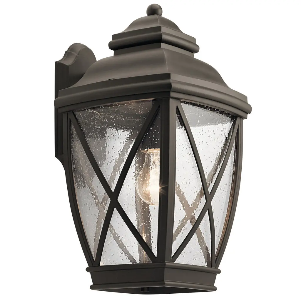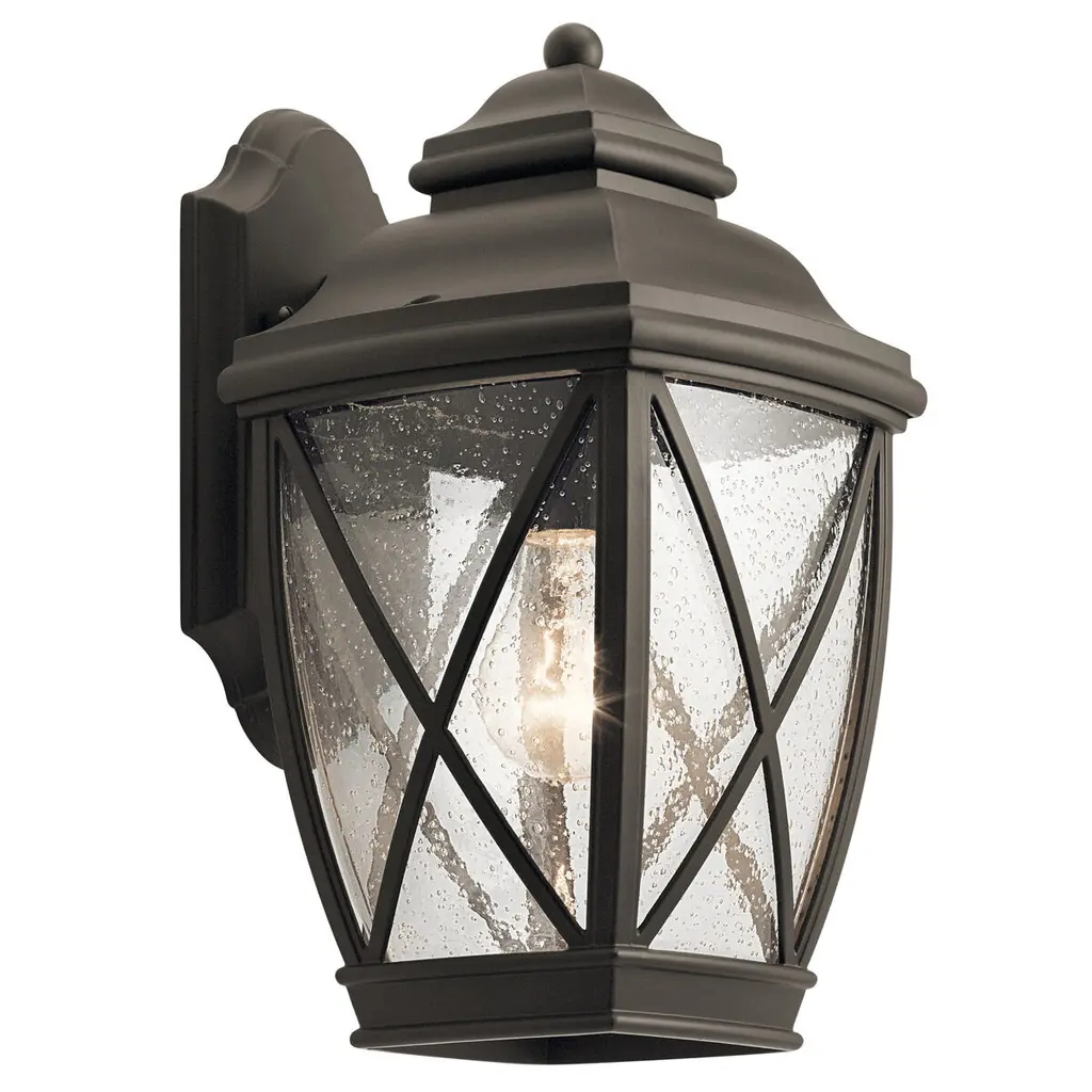 Bring in a combination of traditional and whimsical decor to the exterior walls of your home with this XL Matte Black Birdhouse Shape Outdoor Wall Light. The wall bracket has a rectangular shape and has one round cast aluminum rod attached to it. This rod holds the birdhouse shaped light up. The birdhouse has a sloping roof with a tapered body ending in a solid base. The roof and body have glass panels lining the frame. The clear waterfall effect glass with the matte black frame will bring in a lot of character to any space you use this light in. 12.63" H x 9" W x 10" D