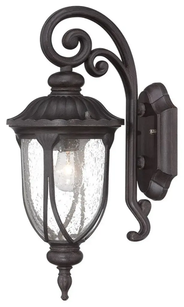 Elevate the look of your home with this XL Matte Black Cast Aluminum Glass Lantern Wall Sconce The wall bracket has a curved shield shape and has screw holes that allow you to hang it up securely no matter what material your exterior wall is made of. A curved rod is attached to the bracket on which the glass lantern hangs. The lantern has a two-tier design which extends down into a thin frame. The frame then extends into a small ornament shape at the bottom. Inside the frame is clear glass panels which allow the bulb to show through. This traditionally designed large matte black light will look great near your front door, in your backyard, or as shed lighting. 22.5" H x 9" W x 11.5" D