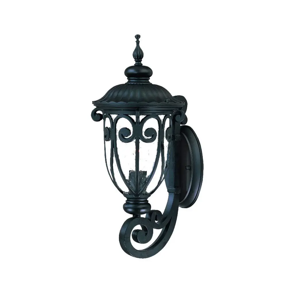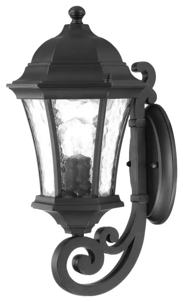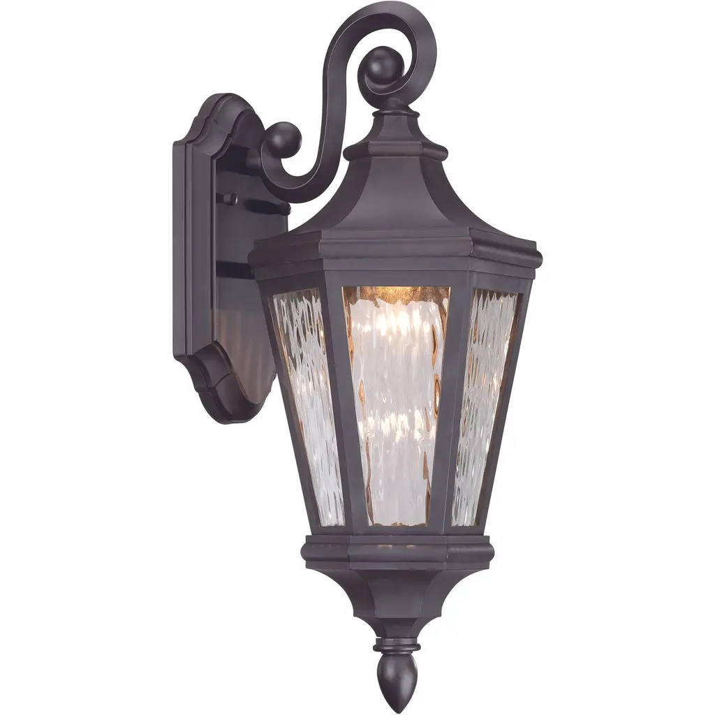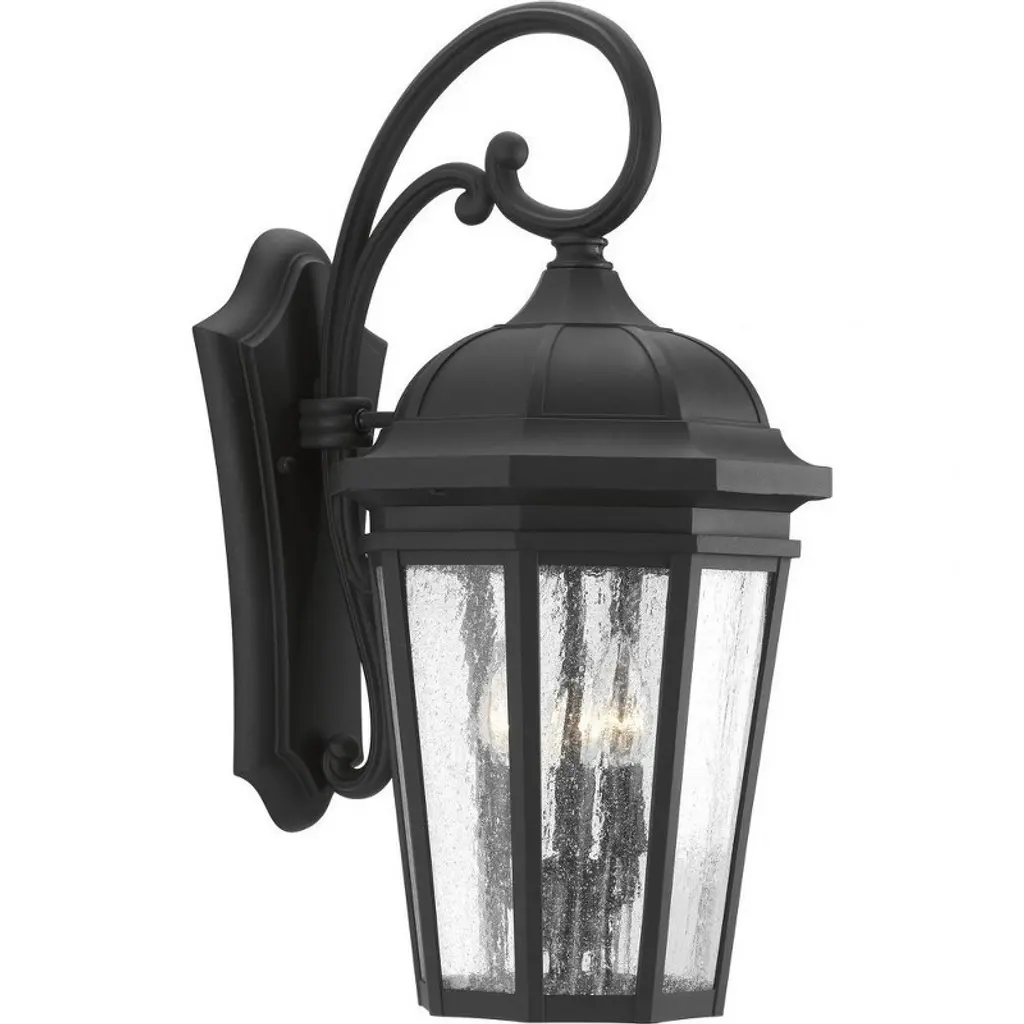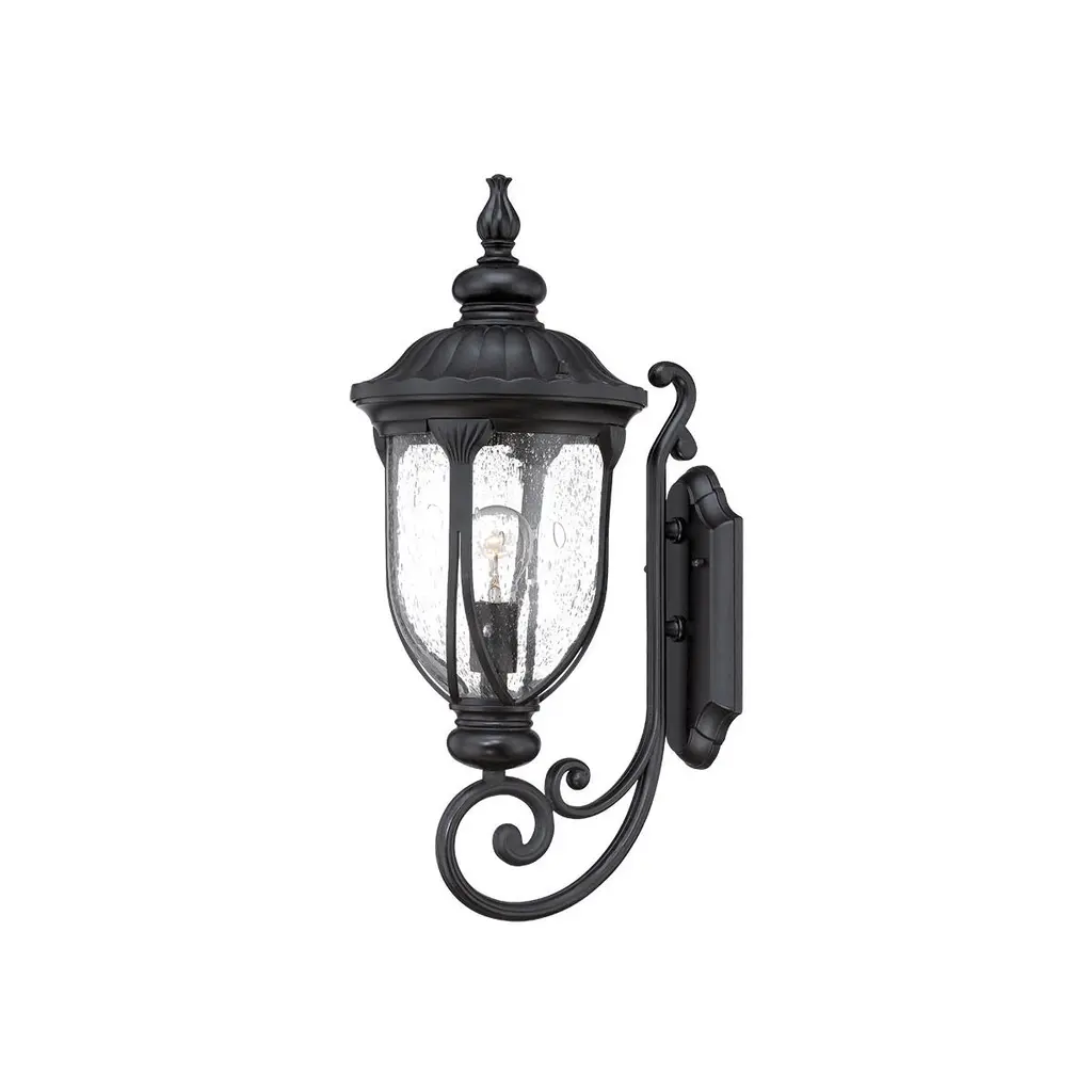 With this XL Matte Black Tapered Lantern Wall Light you can add a touch of traditional design to the exterior walls of your home. The wall bracket is oval shaped and has a curved spiral cast aluminum rod attached to it. The rod attaches to the top of the lantern shape. The main body of the light has a wide carrousel shaped top which tapers down to a narrow three-tier bottom piece. In the middle there is a thin cage which is lined with glass panels that has a hammered pattern on it. Use this monotone matte black light on its own in your backyard, or in pairs encasing your front door. 19.5" H x 9.25" W x 11" D