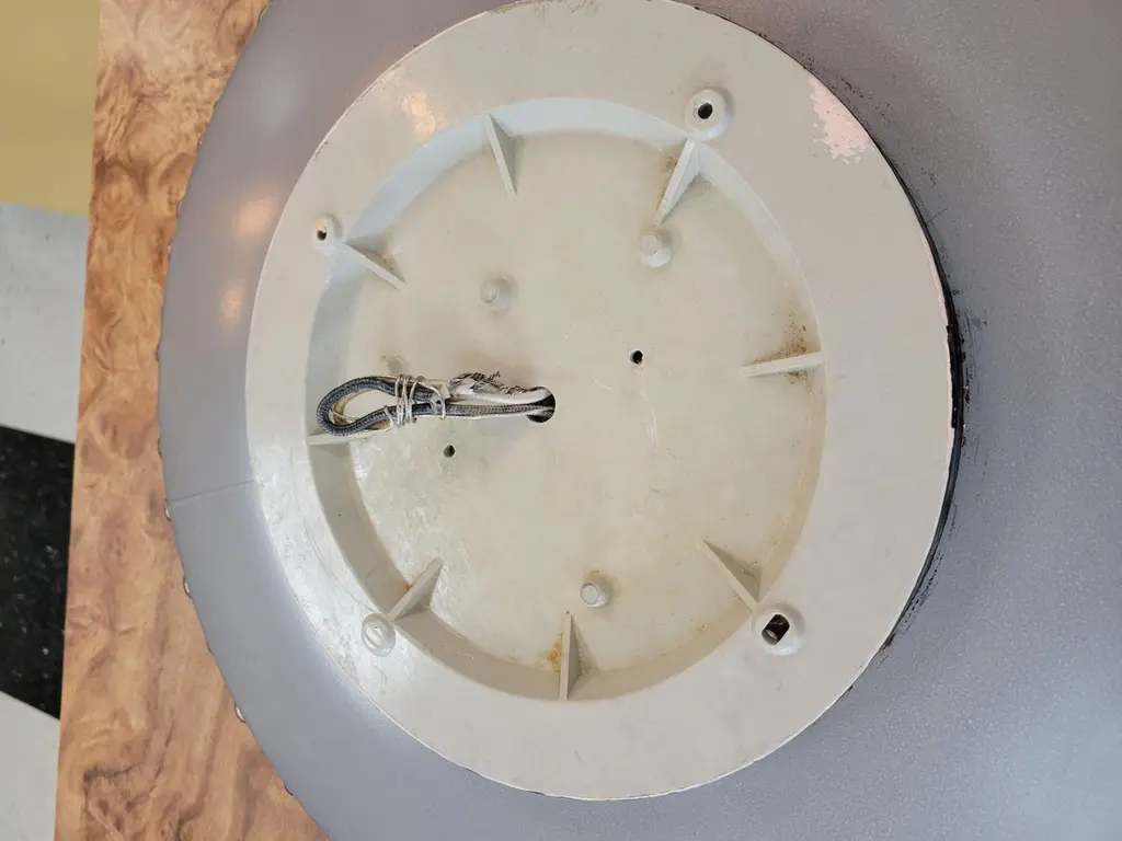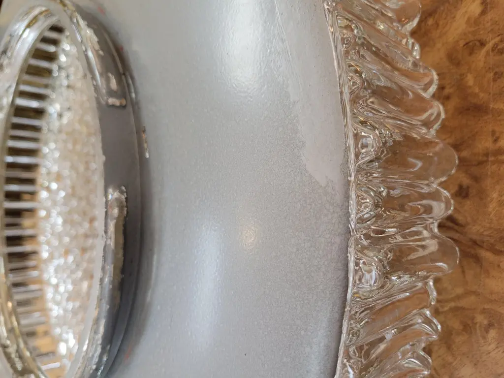 A great fixture from the German company, Staff Leuchten. The bubble glass was featured in many of their styles and was produced from the 1960s until the 80s. This is the largest version available at 19.5" in diameter. Based on the stamped mark it is an earlier version. It can be mounted as a ceiling mount or as a wall sconce. It has 3 medium base, E26, sockets. The wiring is in good condition and has been checked by a professional. The mounting plate is 11" in diameter and the glass threads on. The glass is in great shape with some minor paint loss on the back. The mounting plate has been painted black and could be stripped to the original if desired.