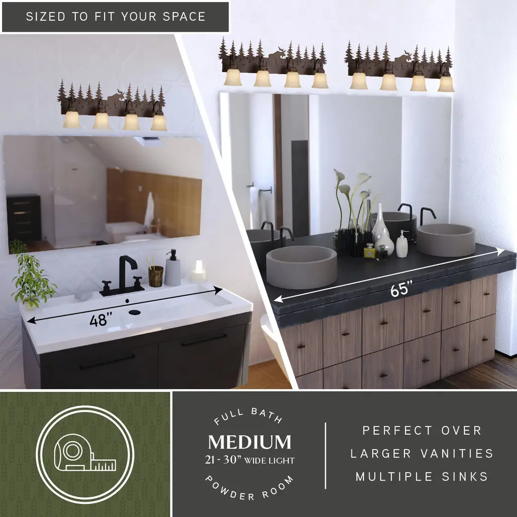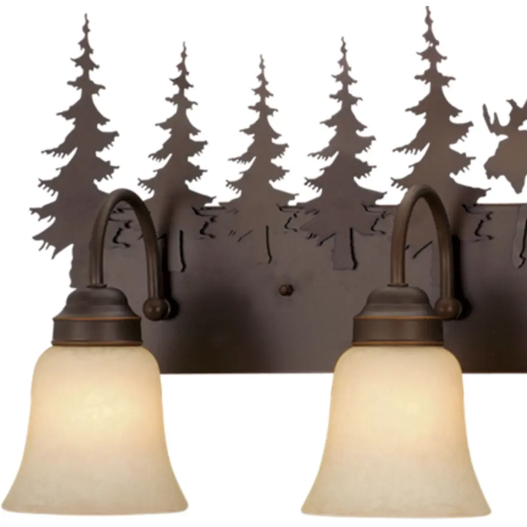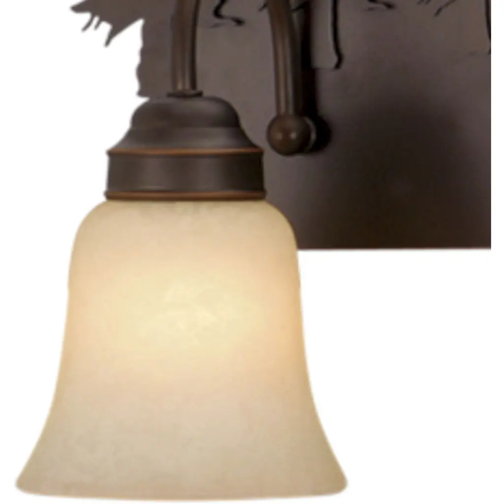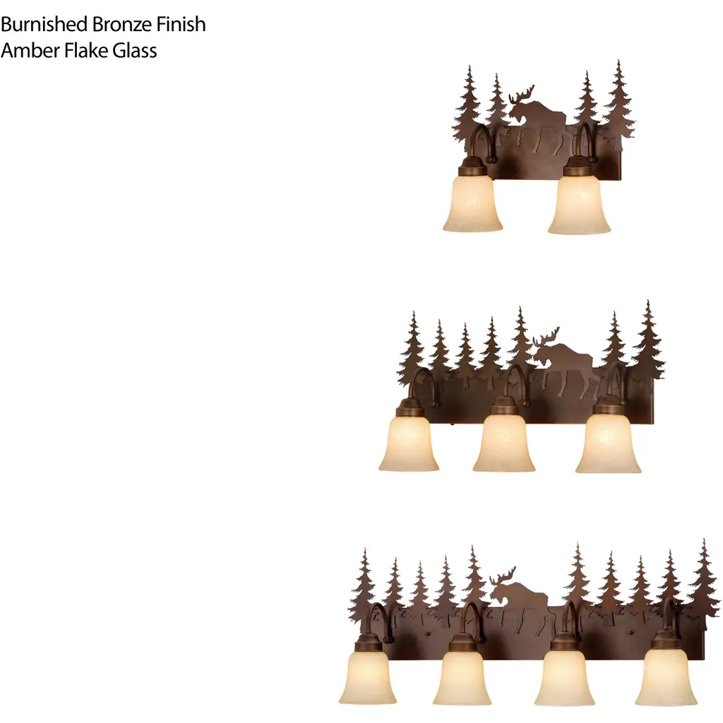 Evoking the spirit of the wilderness, this rustic themed light is clad in a burnished bronze finish and features silhouetted moose imagery atop glowing amber flake glass. It is a great choice for a vacation lodge, cabin or suburban home and will complement a variety of home styles: anywhere you want to bring an element of nature. This bathroom light is perfect over large or double vanities where there is only one outlet box. The full back plate creates the perfect solution to any space where a larger back plate is needed.