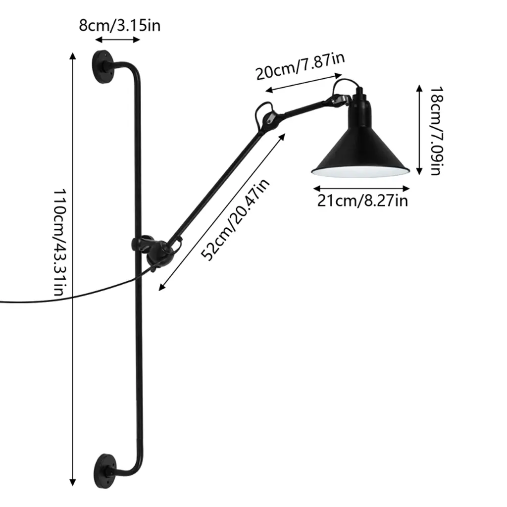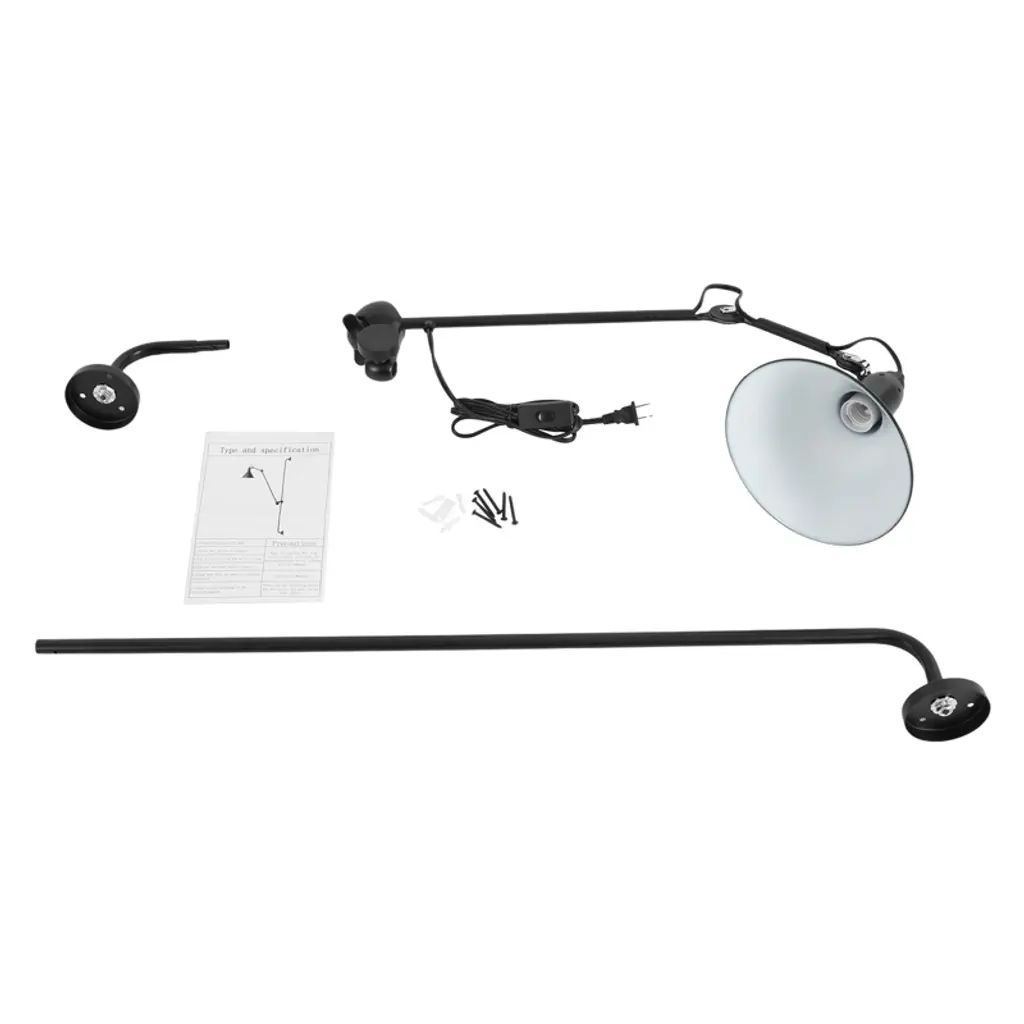 Elevate your bedroom ambiance with this modern black wall lamp, designed to be both a functional light source and a poetic piece of decor. Crafted from durable iron with a high-temperature baking paint finish, it is rust-proof and built to last. Its defining feature is the exceptional flexibility, with 180° rotating brackets and a 360° rotating lampshade, allowing you to direct soft, diffused light exactly where you need it. The lamp accommodates a standard E26/E27 bulb (up to 60W, not included) and is designed for easy indoor installation, making it the perfect intimate companion for reading or relaxing by your bedside. Specification Color: Black Style: Modern Material: Iron Process: High-temperature Baking Paint Type: Wall Lamp Indoor/Outdoor Use: Indoor Installation Required: Yes Plug Type: US Standard Mounting Type: Wall Mount Voltage: 85-265V Efficiency: E Brackets Rotation Angle: 180° Lampshade Rotation Angle: 360° Maximum Bulb Power: 60 W Lighting Area: 3-8 m²/32.3-86.1ft² Light Source: 1* E26/E27 Bulb ( Not Included ) Support Arm Length: 52cm/20.47in, 20cm/7.87in, 110cm/43.31in Support Arm Width: 8cm/3.15in Lampshade Size: 21*18cm/ 8.27*7.09in