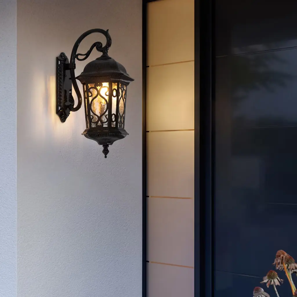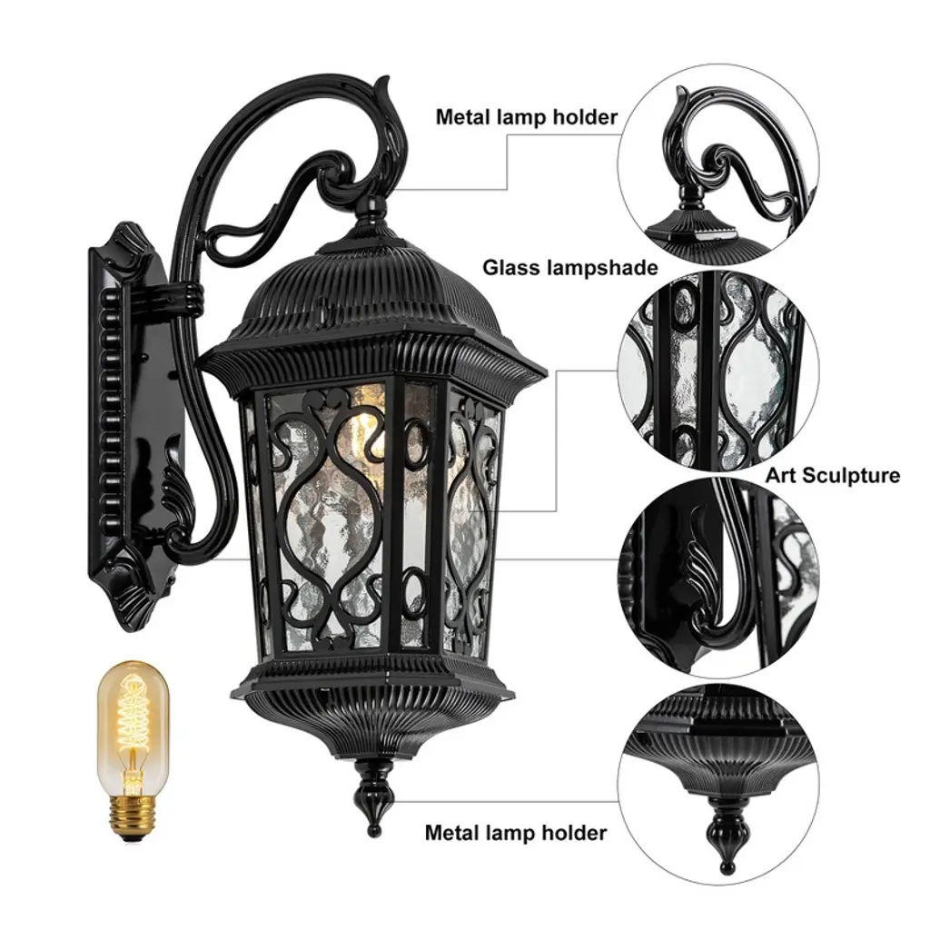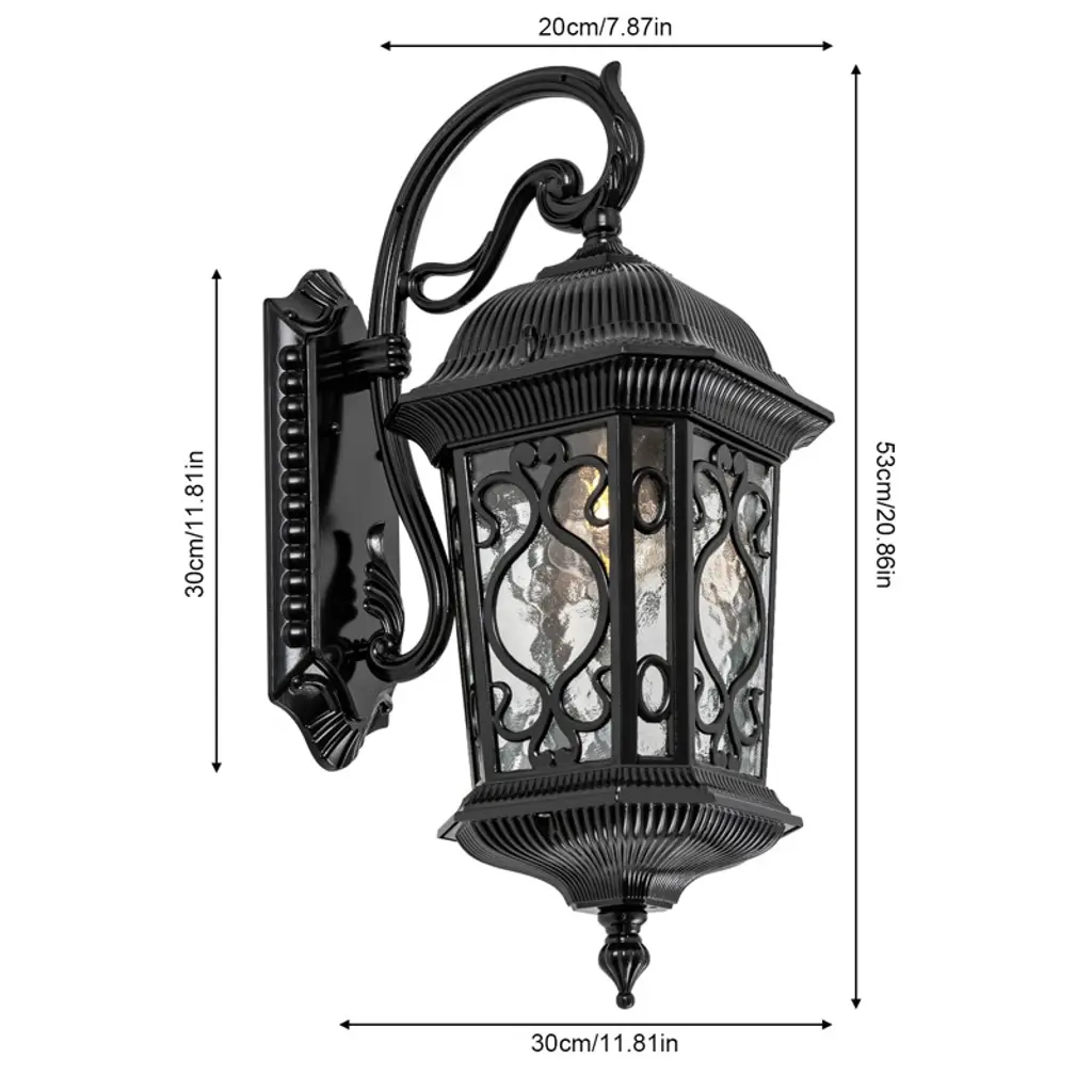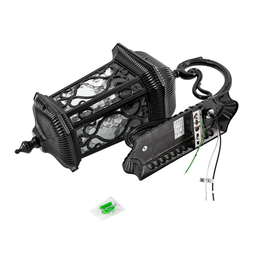 Elevate your outdoor or indoor space with this European-style wall lamp, a perfect blend of vintage charm and modern durability. Featuring a striking black die-cast aluminum frame, a retro floral backboard, and a unique water-textured glass shade, this fixture adds elegance and prevents wall monotony. Designed for longevity, it is rust-proof, corrosion-resistant, and has an IP54 waterproof rating, making it ideal for gardens, courtyards, and porches. The lamp uses a standard E26 bulb (not included, up to 100W) and is assembly-free for quick and easy installation. Specifications Color: Black Style: European Mount Type: Wall Mount Light Fixture Form: Sconce Room Type: Garden, Yard Material: Die-cast Aluminum, Glass Process: Die-casting, Spraying, Polishing Waterproof Level: IP54 Voltage: 24-240V Control Method: Wall Switch (Not Included) Light Source Type: 1*E26(Not Included) Max. Rated Power: 100W Rated Current: 0.45A Efficiency: E Load-bearing Capacity: 5kg/11.02lbs Backboard Height: 30cm/11.81in Distance from Wall: 30cm/11.81in Product Size(L*H): 20*53cm/7.87*20.86in