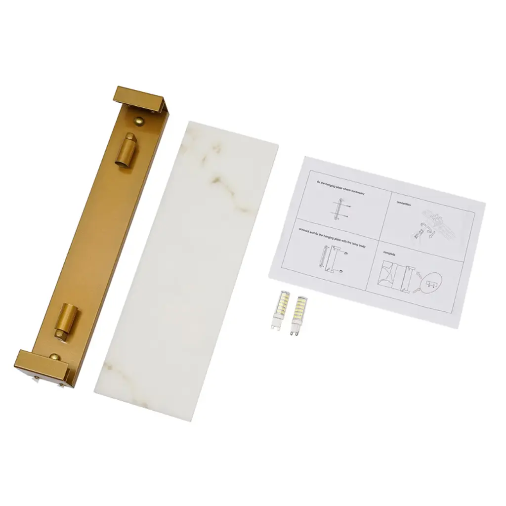 Elevate your home’s aesthetic with this exquisitely simple and beautiful wall lamp. Crafted from a premium blend of high-quality iron and imitation marble with a durable spray coating, it showcases a sophisticated gold and white finish. Its translucent shade diffuses a bright, soft glow, making it a stunning decorative piece for any indoor space, from porches to living rooms. Specifications Color: Gold, White Material: Iron, Imitation Marble Process: Spray Coating Style: Modern Assembly Required: Yes Mount Type: Wall Mount Control Method: Wall Switch ( Not Included ) Efficiency: E Indoor/Outdoor Usage: Indoor Voltage: 85-265V Light Source: 2* G9 Bulbs (Included) Max. Bulb Power: 7W Waterproof Grade: IP20 Applicable Area: 3-5㎡/32.29-53.82ft² Gross Weight: 3.8kg/8.38lbs Net Weight: 2.09kg/4.61lbs Product Size: 46*15*6.5cm/18.11*5.91*2.56in
