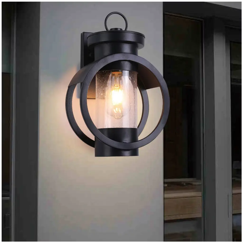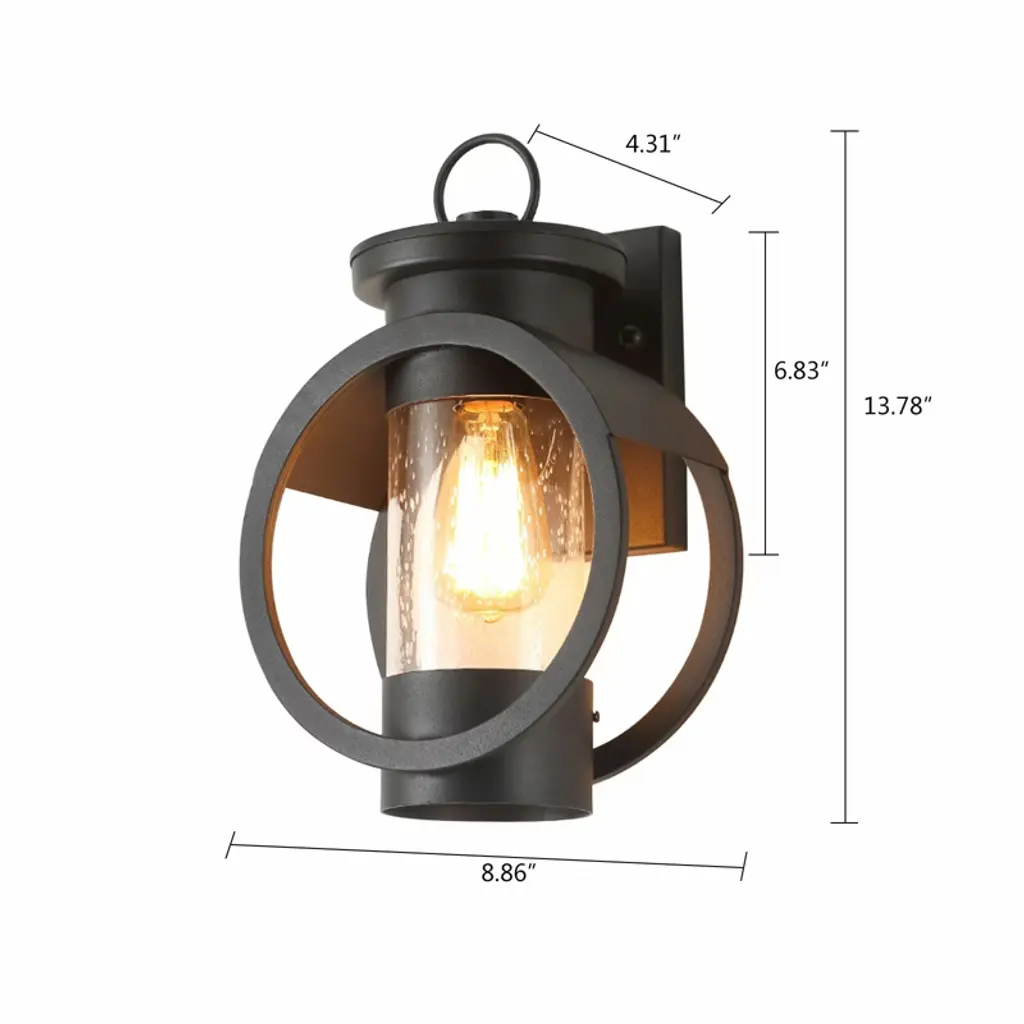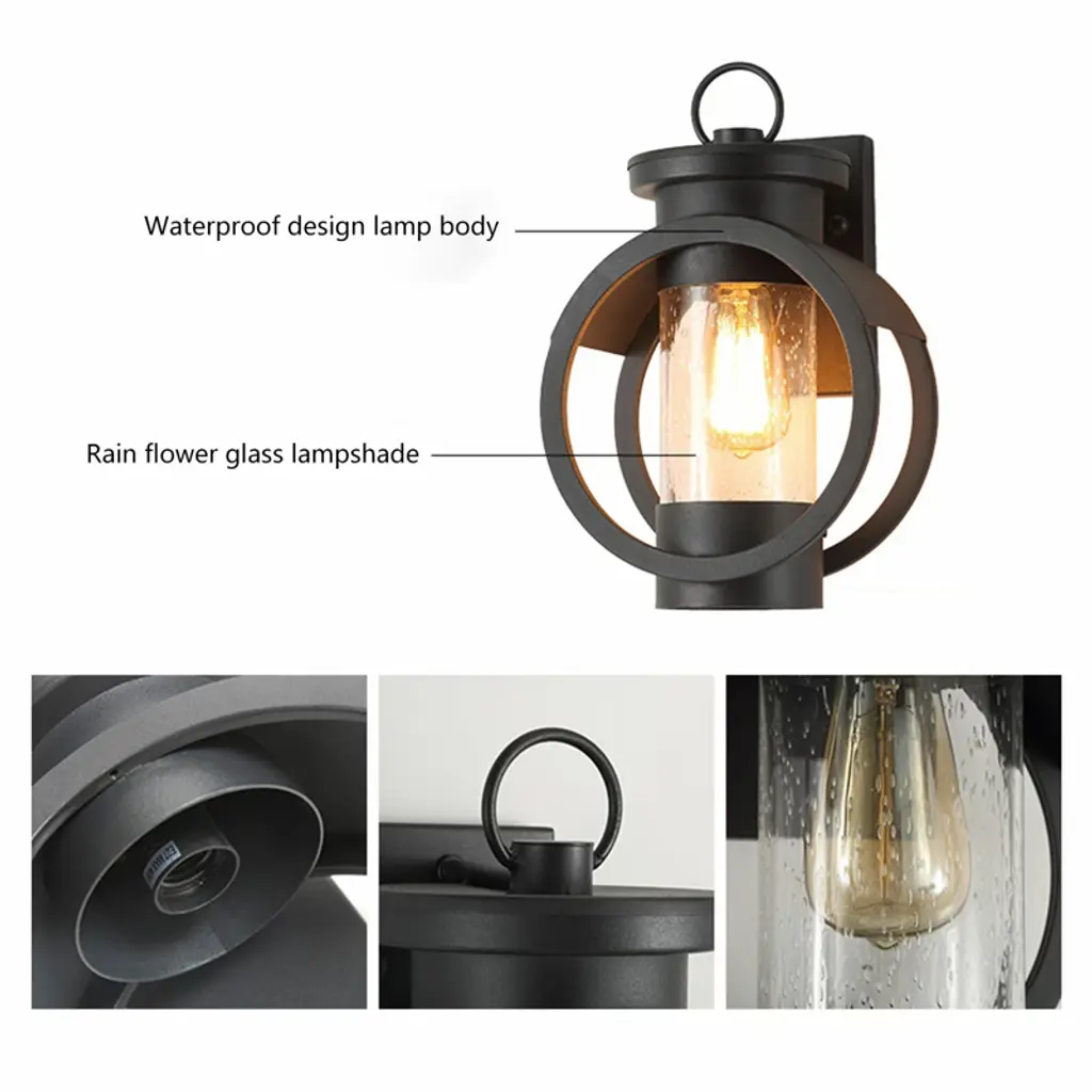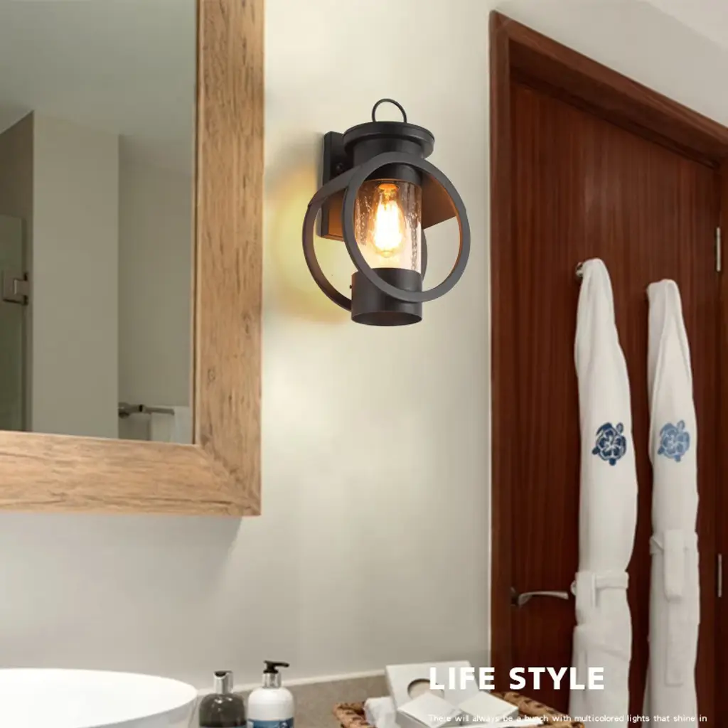 Elevate your indoor and outdoor spaces with this elegant and durable wall light. Designed to create a tranquil and cozy atmosphere, it serves as both a stylish decor highlight and a reliable companion for daily life. Its robust construction ensures long-lasting performance, while the wide illumination and IP65 waterproof rating make it perfect for any setting, from bedrooms and living rooms to patios and gardens. Simple to install and compatible with various bulbs, this versatile fixture is an ideal choice for enhancing your home’s aesthetic and warmth. Specifications Material: Iron, Glass Color: Black Style: Modern Process: High-temperature Baking Paint Efficiency: E Mount Type: Wall Mount Installation Required: Yes Indoor/Outdoor Usage: Outdoor, Indoor Light Source: 1* E26 Bulb (Not Included) Control Method: Wall Switch(Not Included) Applicable Max. Bulb Power: 60W Voltage: 110-240V Waterproof Level: IP65 Applicable Area: 6-12m²/64.58-129.17ft² Base Size: 10.95*17.35cm/4.31*6.83in Product Size(L*H): 22.5*35cm/8.86*13.78in