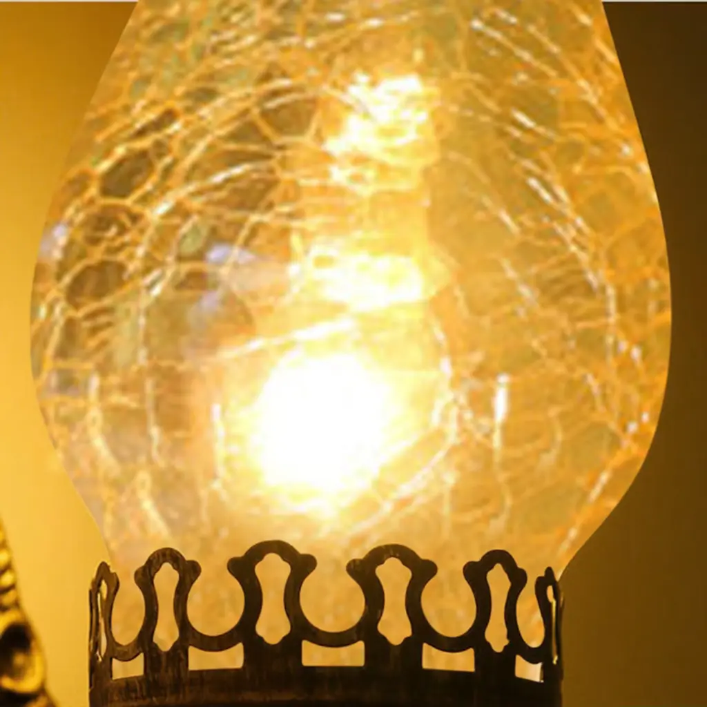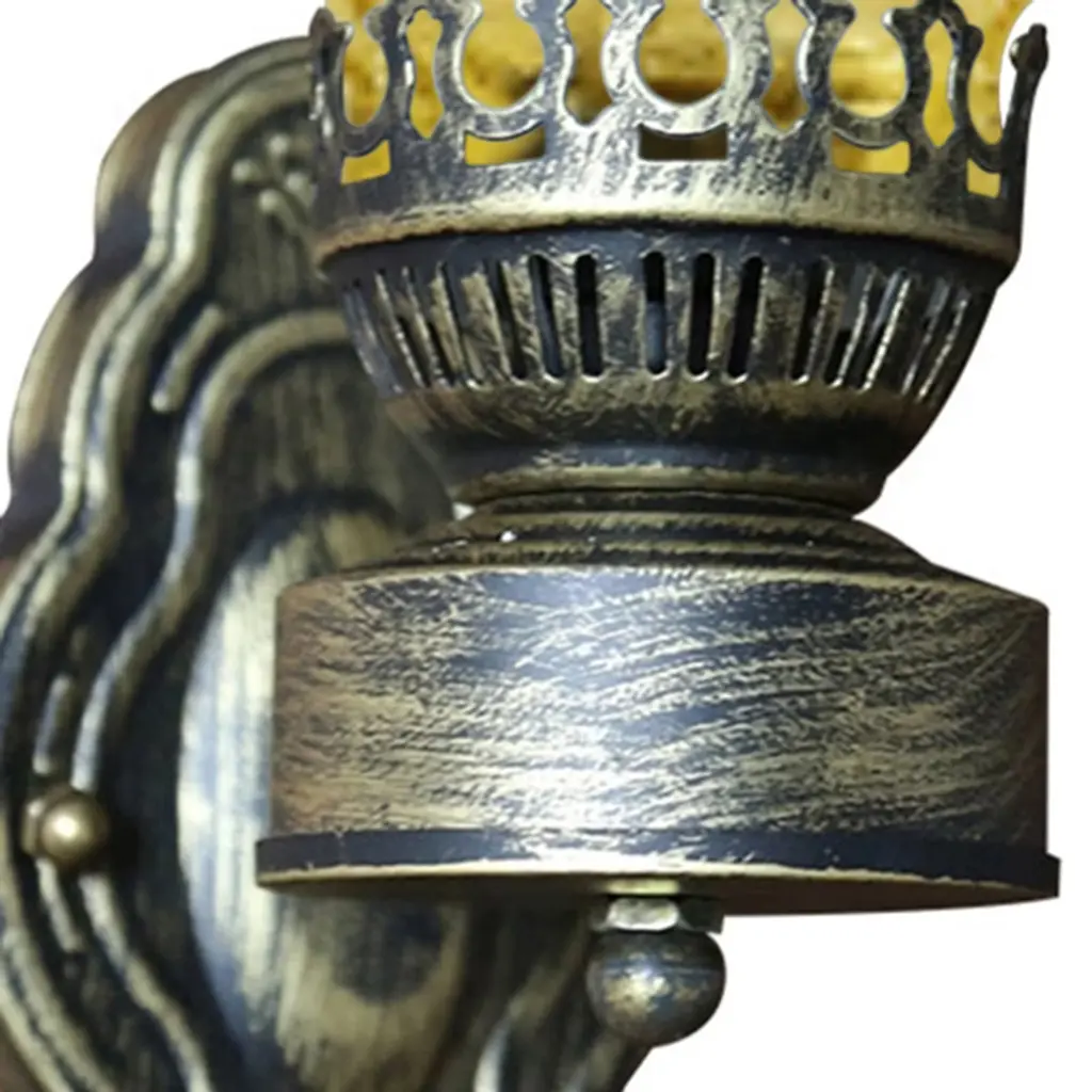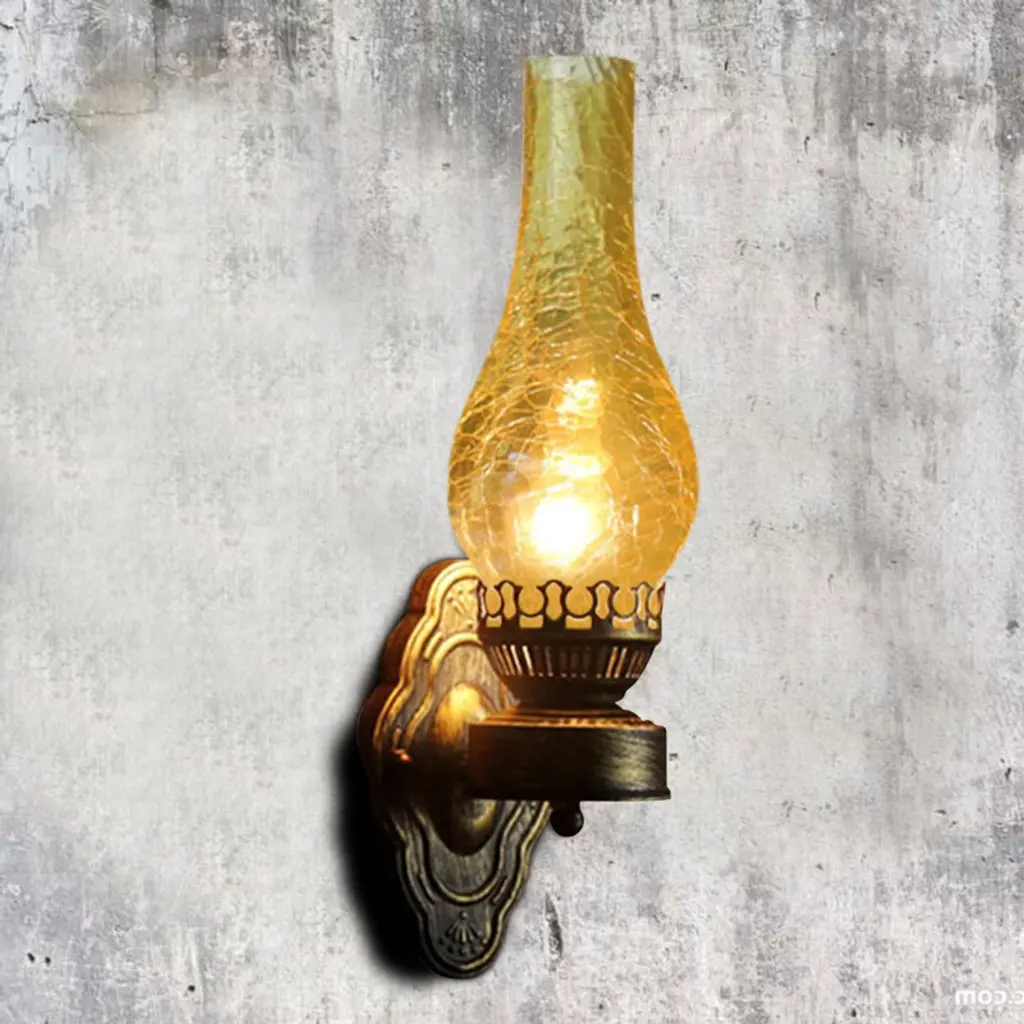 Transform your space with the enchanting glow of this vintage wall light, designed to bring warmth and character to any setting. It features a stunning retro bronze base paired with a unique crackle-style glass lampshade that casts beautiful, sparkling ripples of light. Constructed from durable, rust-proof iron and glass, this fixture is built for both indoor and outdoor use. It comes fully pre-assembled for ultimate convenience and uses a standard E27 bulb (not included), offering versatile lighting options to perfectly illuminate porches, gardens, hallways, and more, creating a cozy and inviting atmosphere. Details Firm Base: The crown-shaped base wraps around the bottom of the lampshade to prevent it from slipping off easily. Semi-translucent Lampshade: It can emit light more directly, improving the brightness of the room. Specification Material: Glass and Iron Color: Bronze and Tawny Surface Treatment: Painting Style: Retro Shape: Petal Shape Efficiency: E Mount Type: Wall-mounted Assembly Required: No Number of Items: 1 Light Source Type: 1* E27 Bulbs(Excluded) Illumination Area: About 10m²/107.64ft² Voltage: 220V Gross Weight: 1.2kg/2.65lb Product Size(L*H): 12*42cm/4.72*16.54in