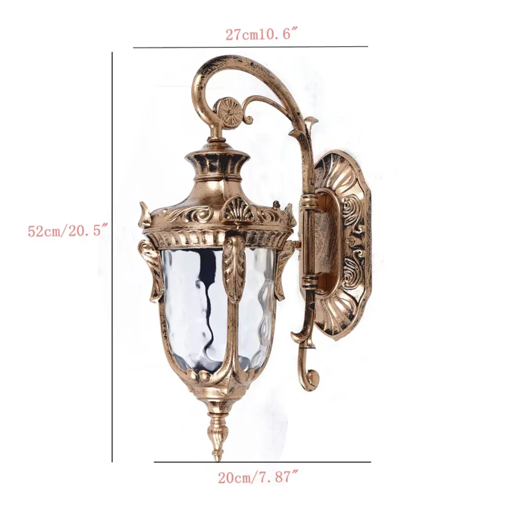 When night falls, there is always a light that will illuminate our way home. Adorn the wall of your patio with our European vintage-inspired wall lamp and let the moody light brighten up a nice quiet night's life! The wide voltage and standard E26 lamp holder allow for high adaptability. The premium materials and fine workmanship ensure great durability. Why wait? Invite this enchanting luminaire home now! Application This product can be used for indoor and outdoor lighting in entrances, gates, front doors, sheds, porches, foyers, corridors, balconies, gardens, yards, patios, exterior walls, garages, streets, and commercial venues. Specification Style: Retro Color: Bronze Assembly Required: Yes Mounting Type: Wall Mount Material: Die Casting Aluminum, Glass Process: Die Casting, Painting, Grinding Indoor/Outdoor Usage: Indoor & Outdoor Control Method: Wall Switch(Not Included) Light Source: 1* E26 Bulb(Not Included) Efficiency: E Voltage: 110-240V Max. Bulb Power: 60W Waterproof Rating: IP23 Overall Size: 20*27*52cm/7.87*10.63*20.47in
