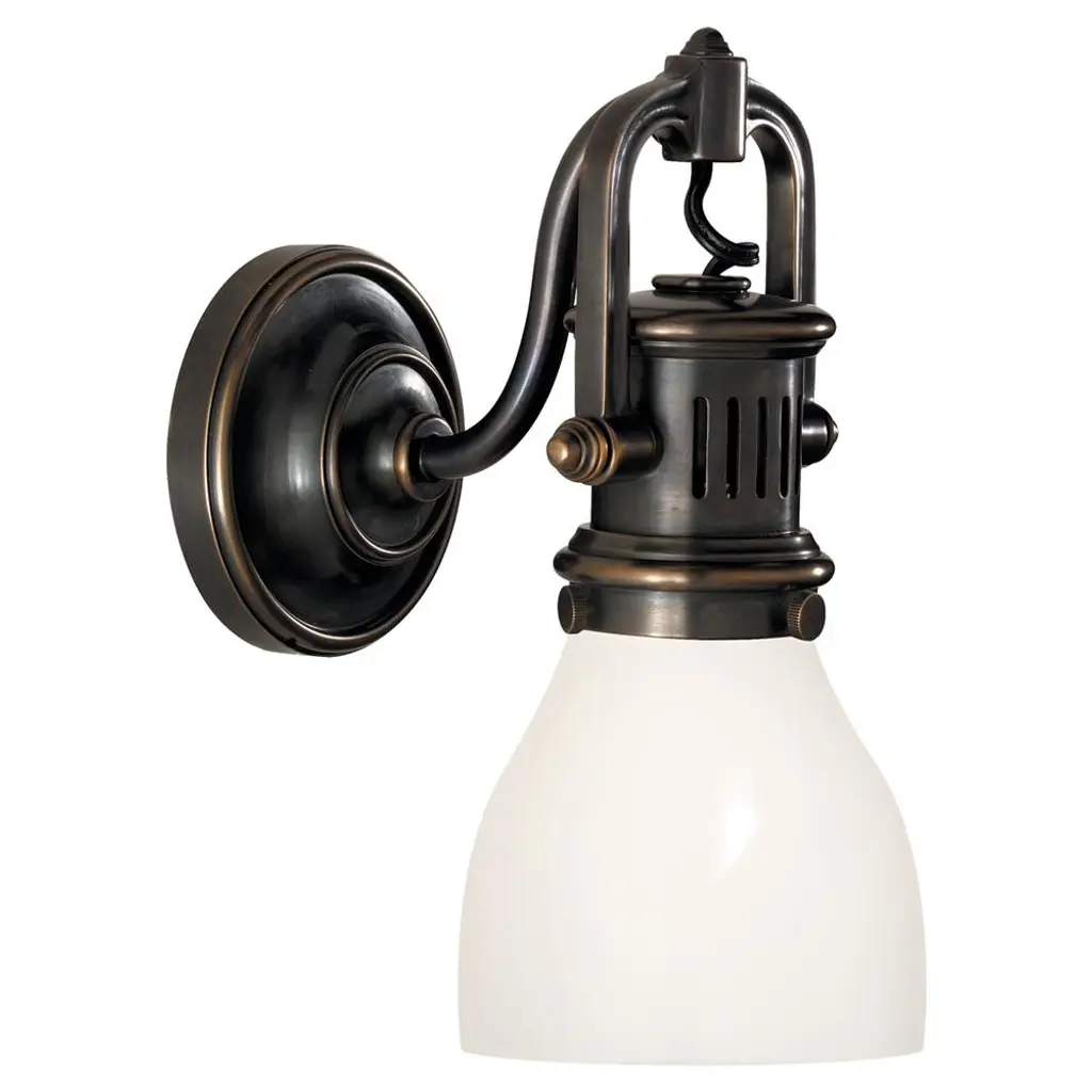 The Yoke Suspended Wall Sconce with Glass Shade by Visual Comfort Signature, formerly known as Visual Comfort, has delicate metalwork details that are reminiscent of restoration pieces. The White glass shade evenly diffuses light while the metallic finish lends a bit of sparkle to the body. The Yoke Suspended Wall Sconce with Glass is an enchanting and illuminating piece sure to add a touch of class to the room.