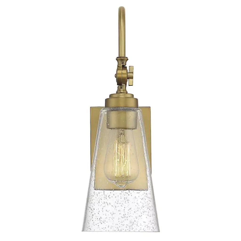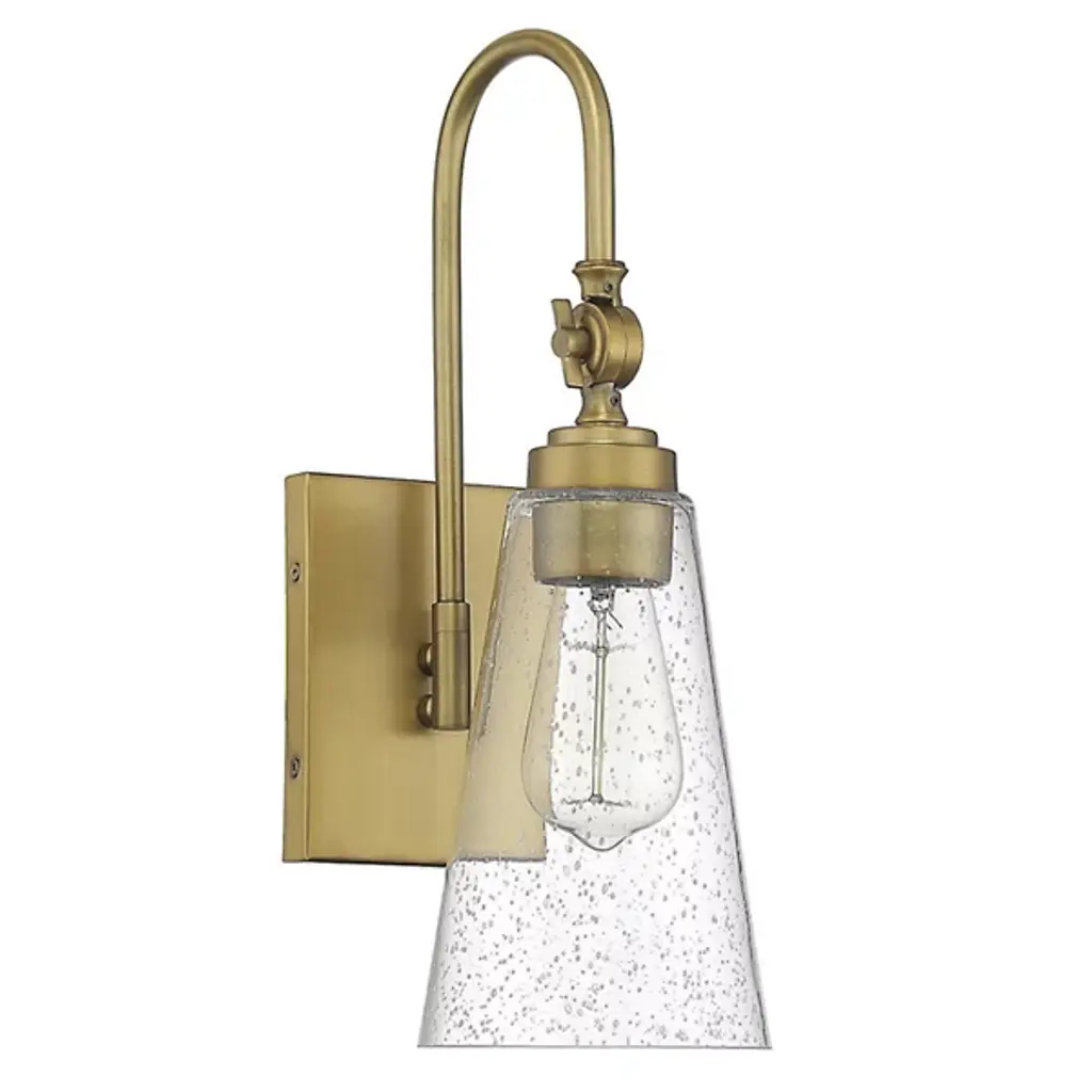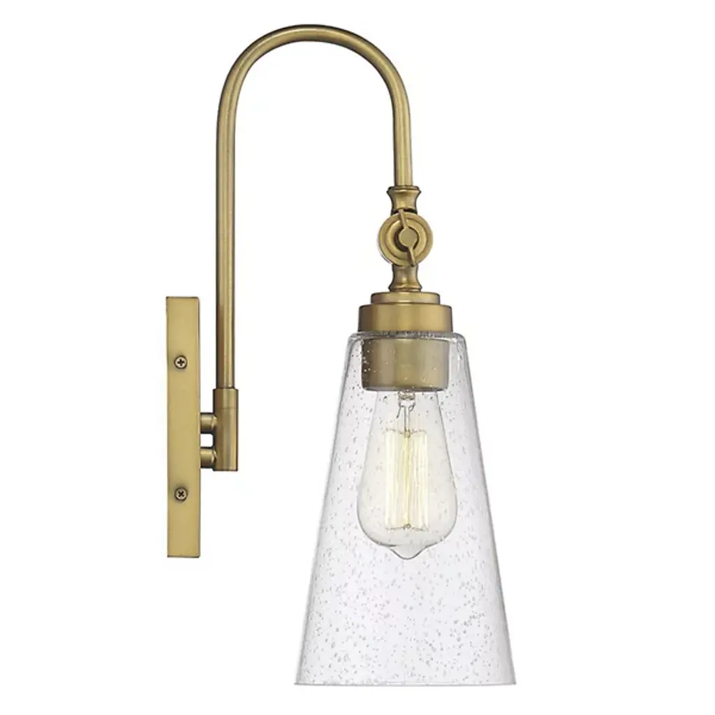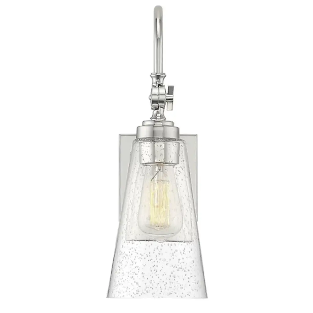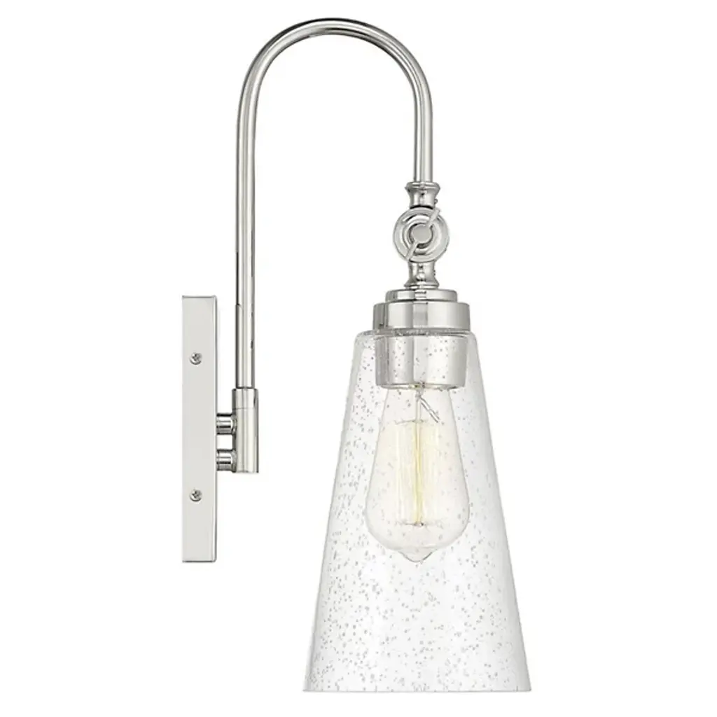 Classic, regal, refined. Set an unforgettable ambiance across your home with the York Wall Sconce from Savoy House. With a sleek, low-profile backplate, the piece slots right into tight architectural nooks. It charms in a side profile view as it bends forward in a tall curve. Get your hands on the vintage-style joint at the end to aim the rich light source. A clear seeded glass shade covers the bulb with a classic texture. When turned on, the seeded details pop with highlights as a crisp ambient glow filters out.
