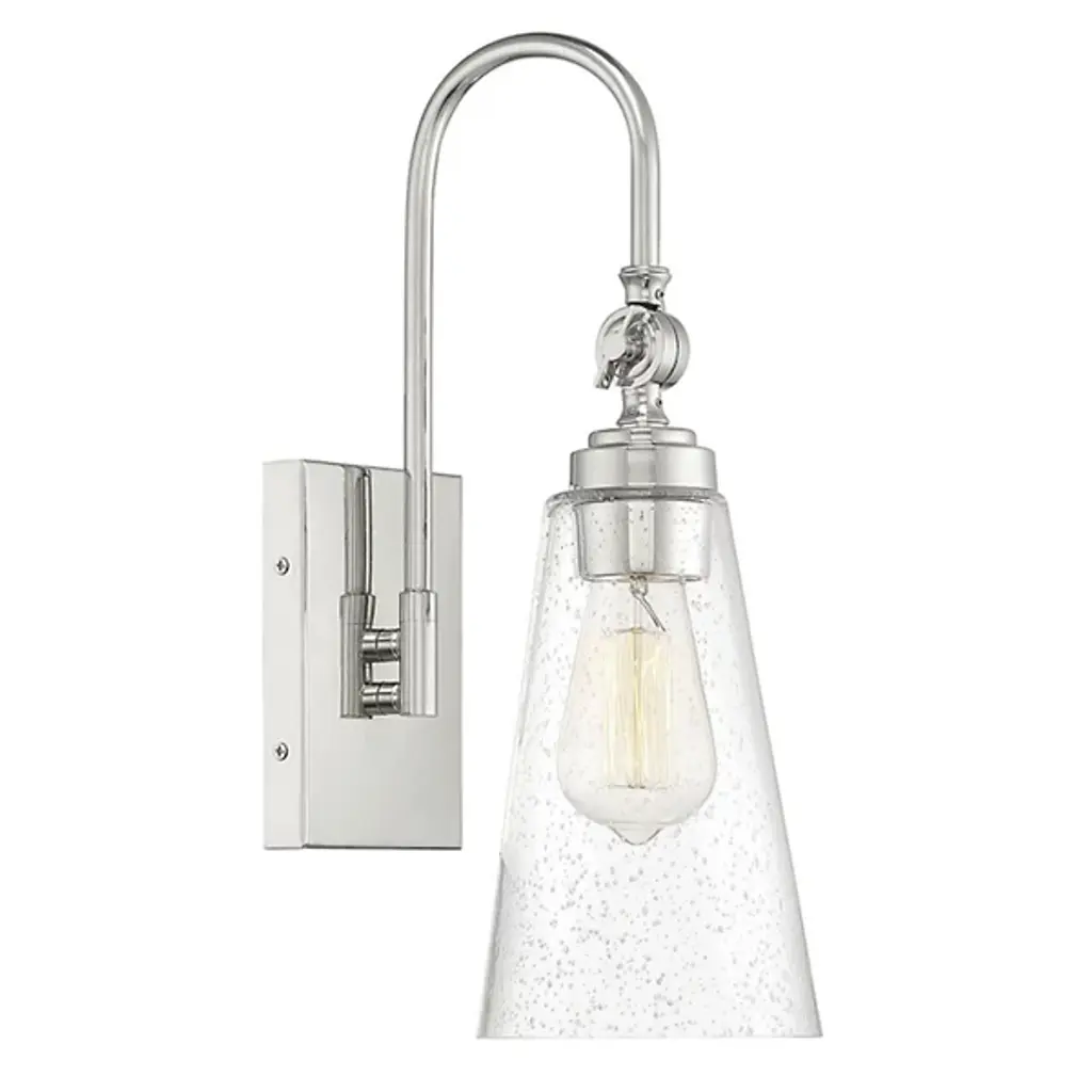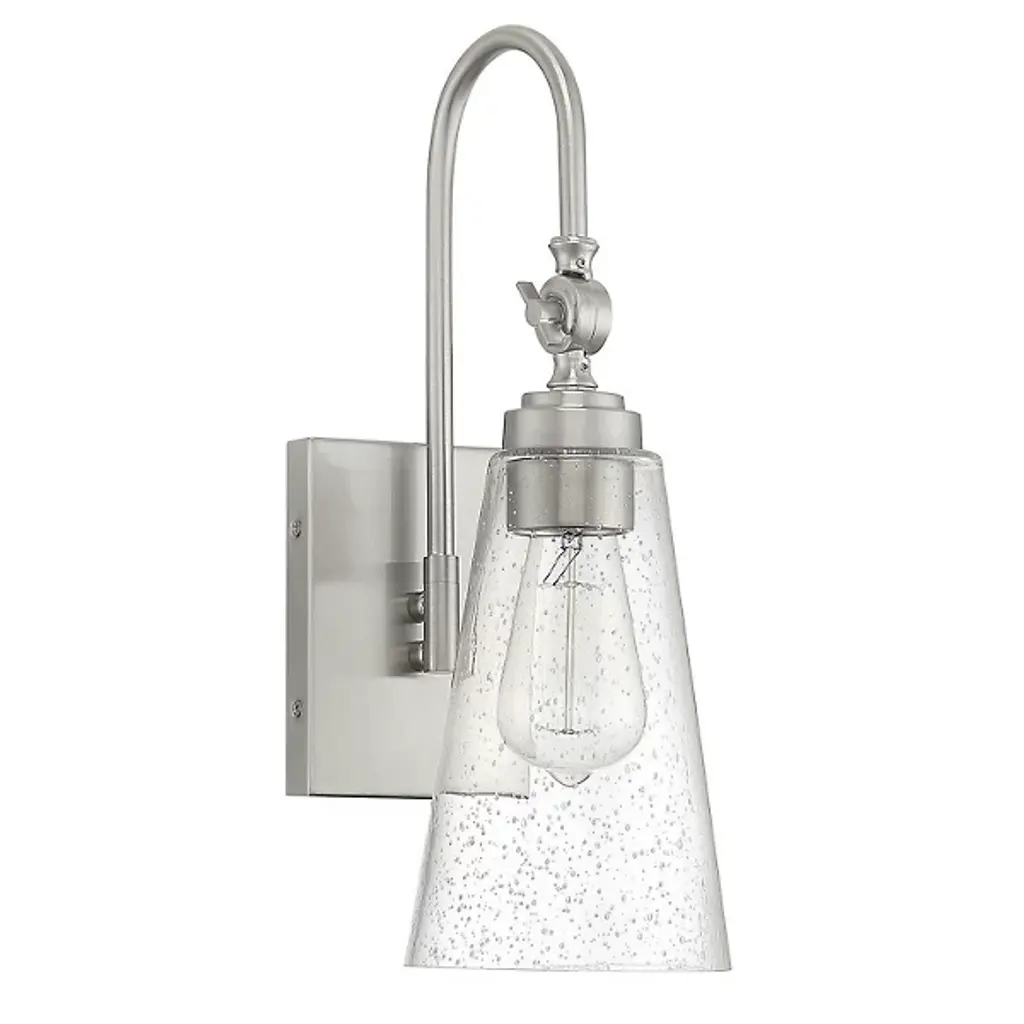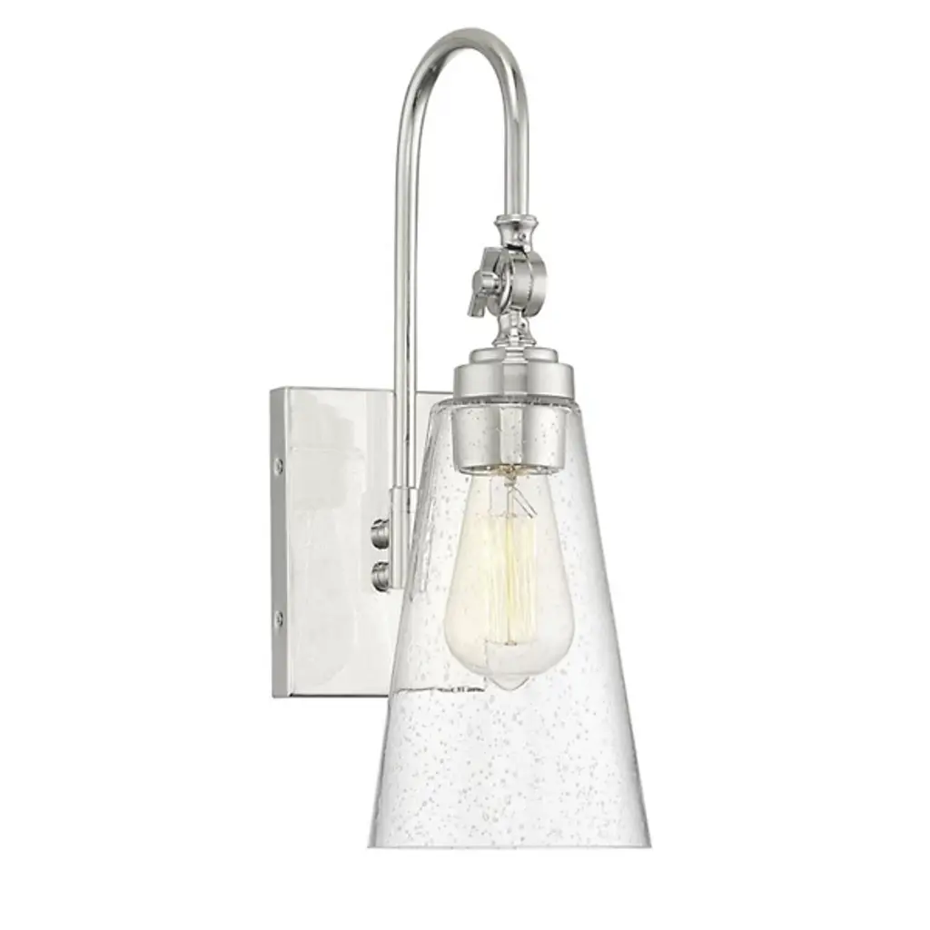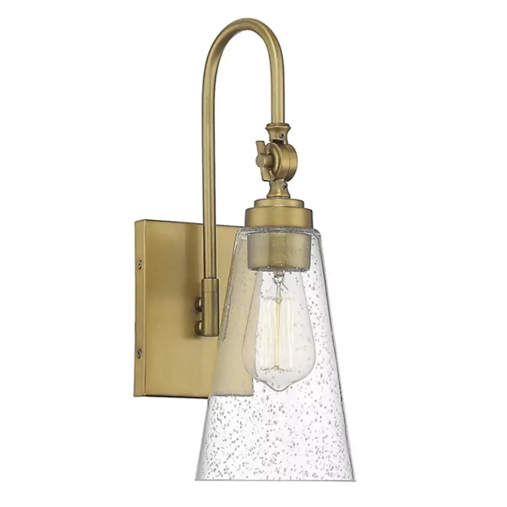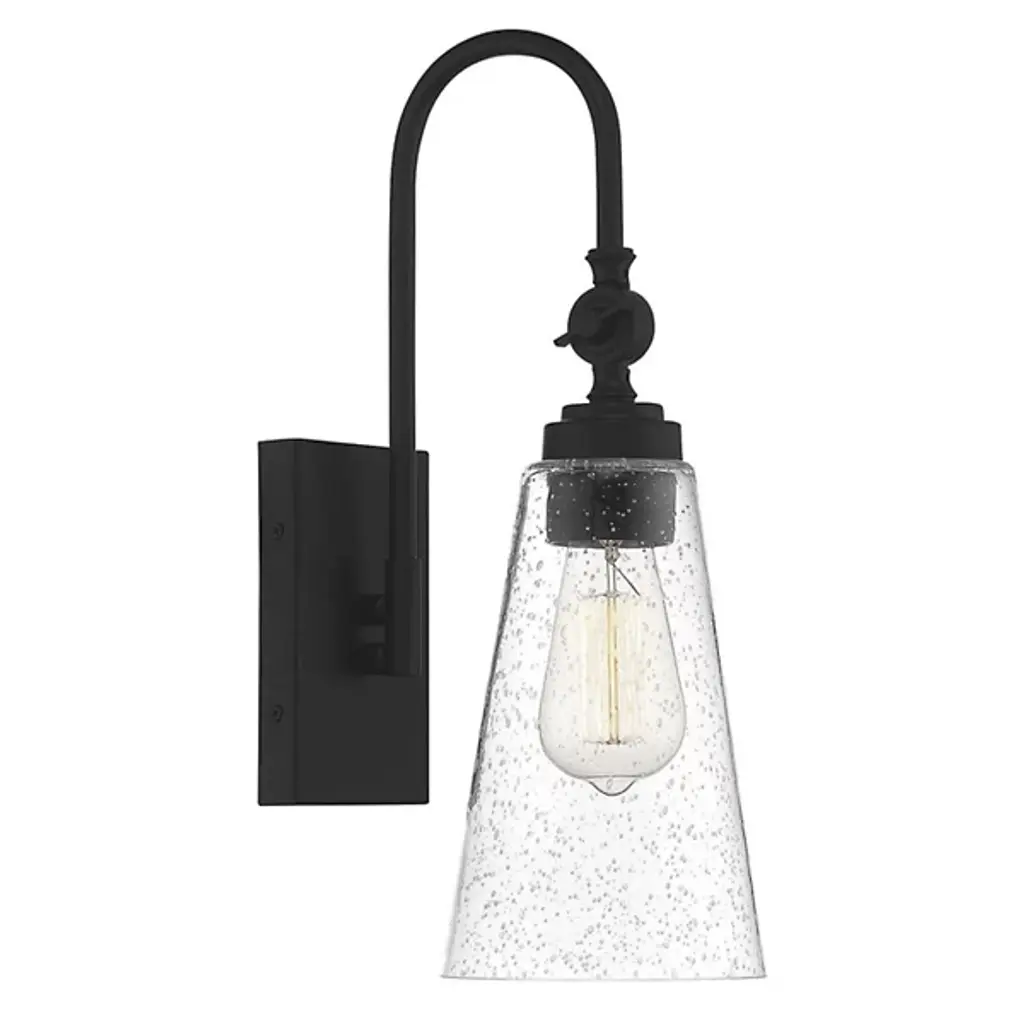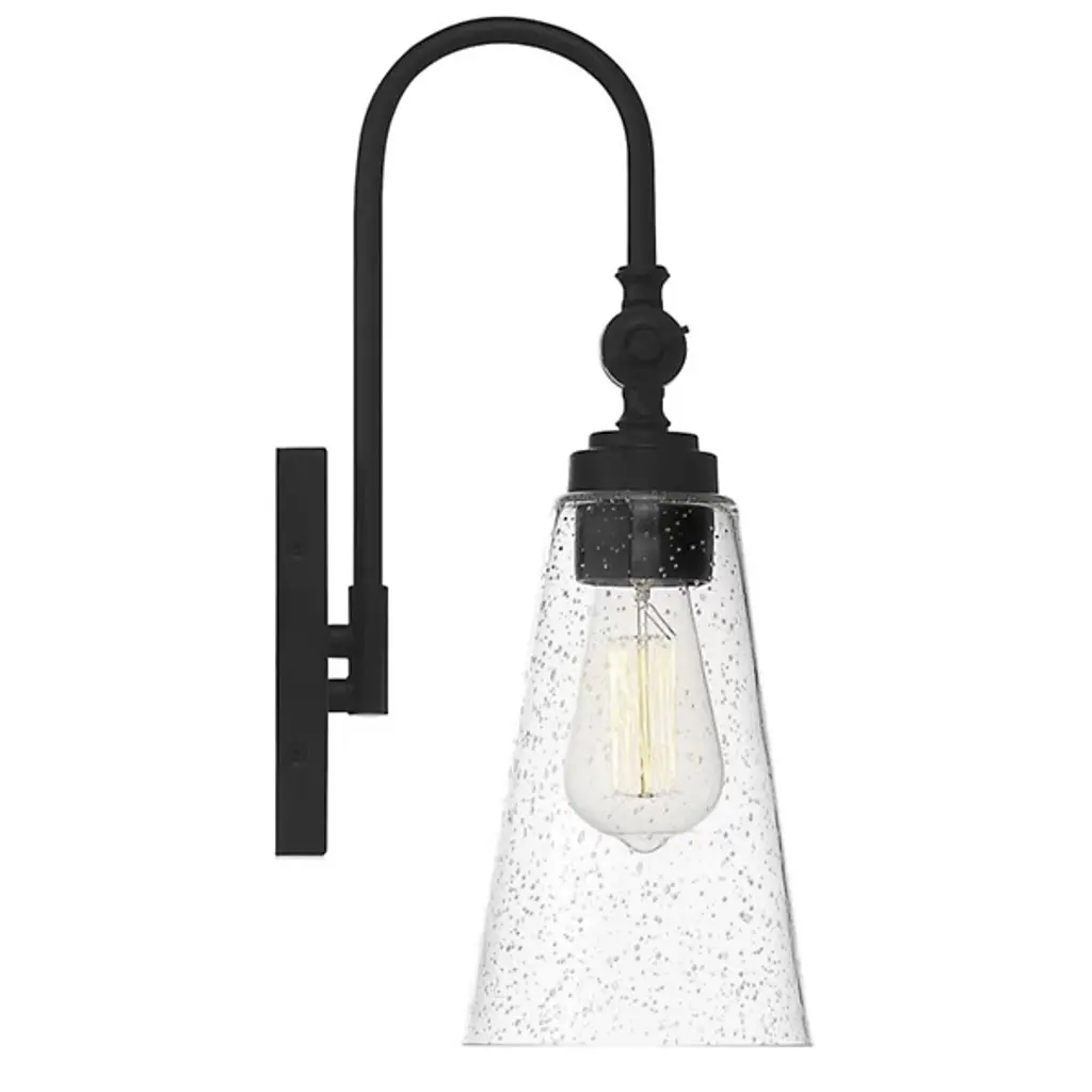 Classic, regal, refined. Set an unforgettable ambiance across your home with the York Wall Sconce from Savoy House. With a sleek, low-profile backplate, the piece slots right into tight architectural nooks. It charms in a side profile view as it bends forward in a tall curve. Get your hands on the vintage-style joint at the end to aim the rich light source. A clear seeded glass shade covers the bulb with a classic texture. When turned on, the seeded details pop with highlights as a crisp ambient glow filters out.