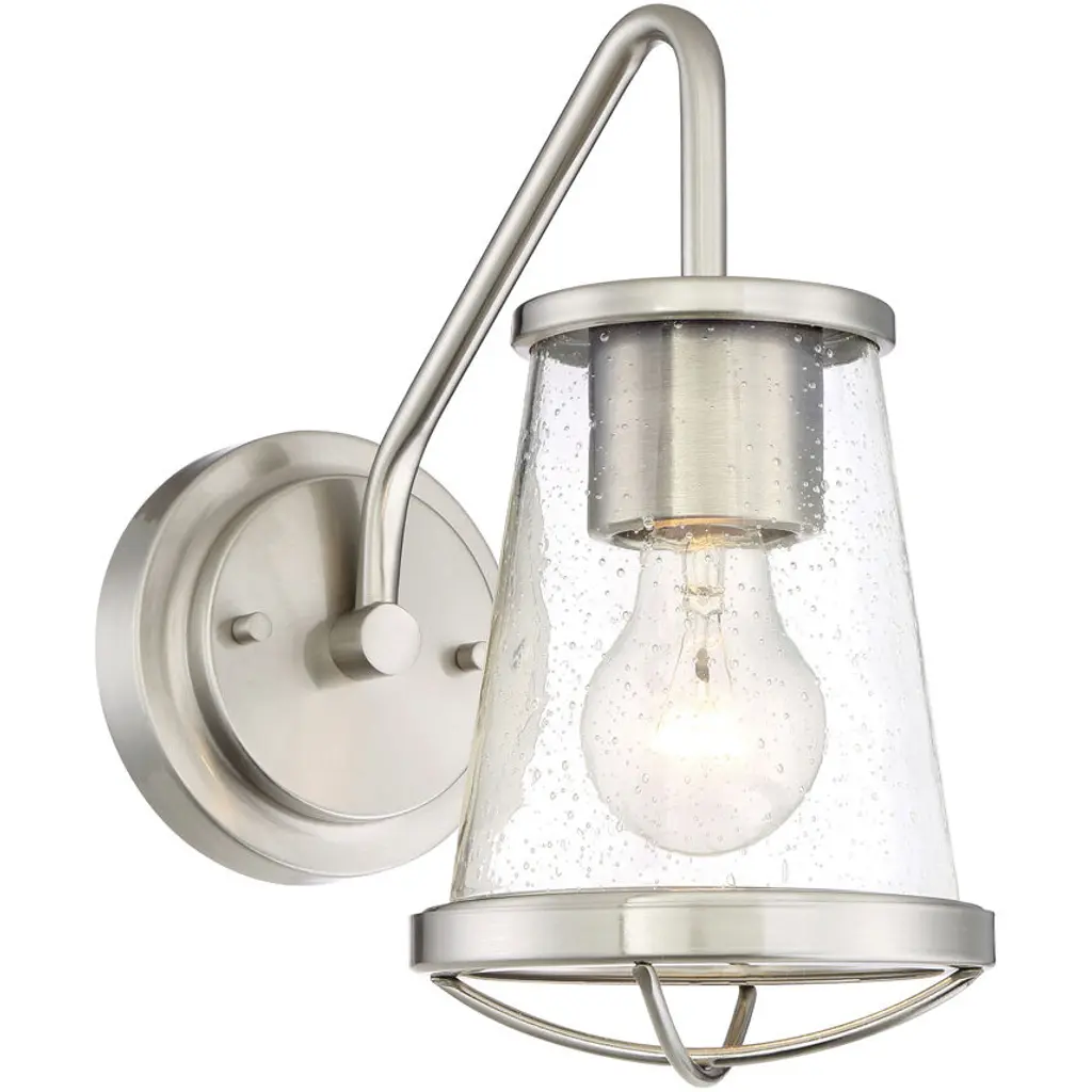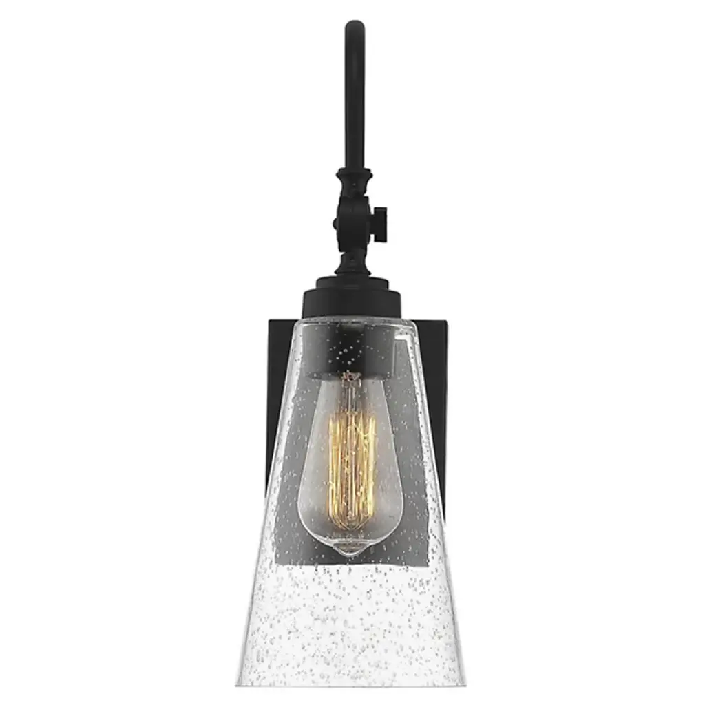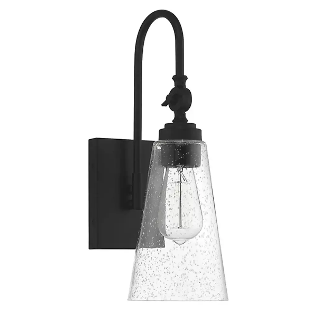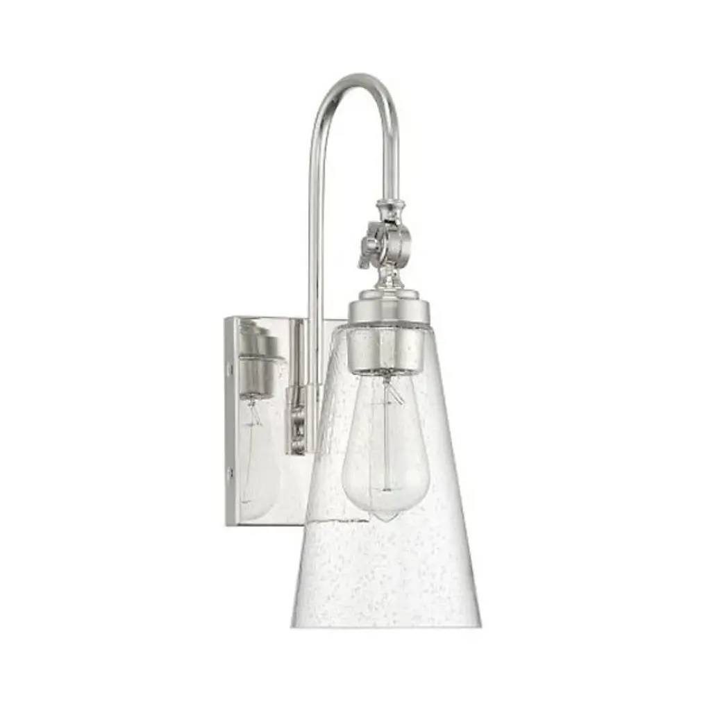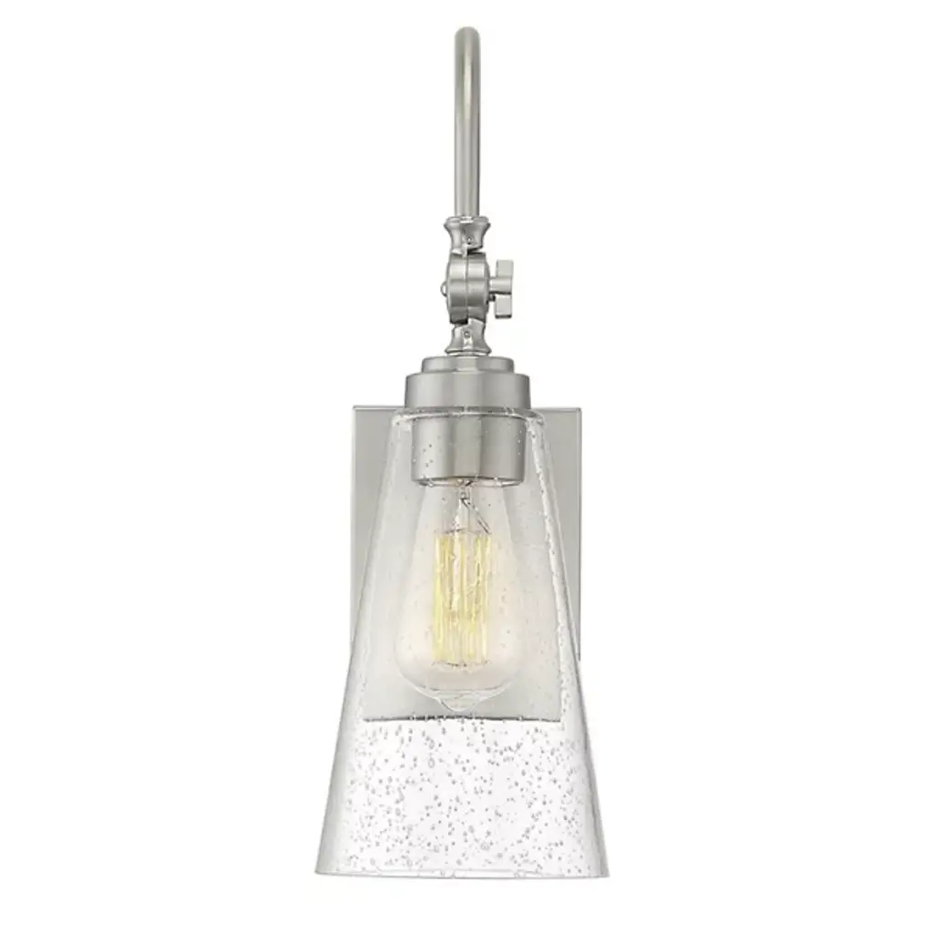 Classic, regal, refined. Set an unforgettable ambiance across your home with the York Wall Sconce from Savoy House. With a sleek, low-profile backplate, the piece slots right into tight architectural nooks. It charms in a side profile view as it bends forward in a tall curve. Get your hands on the vintage-style joint at the end to aim the rich light source. A clear seeded glass shade covers the bulb with a classic texture. When turned on, the seeded details pop with highlights as a crisp ambient glow filters out.