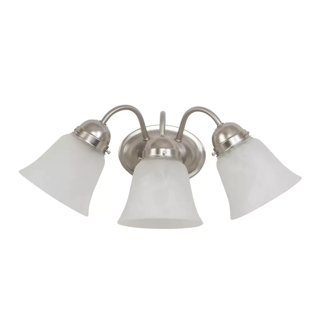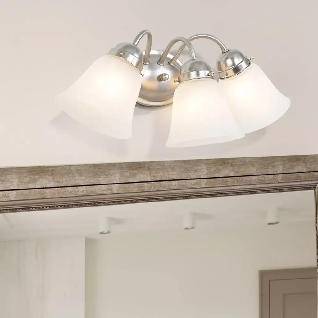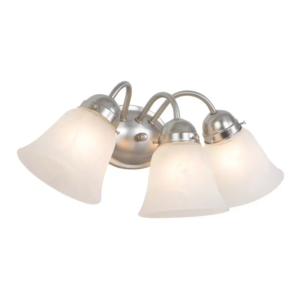 Update your bathroom decor with the stylish Yosemite 3-Light Bathroom Vanity in satin nickel. This simple but attractive vanity light fixture boasts an oval metal base and three curved arms in silver satin nickel. Three white frosted glass shades in a subtle bell shaped offer ample light. Requires 3 100 watt incandescent bulbs, sold separately.