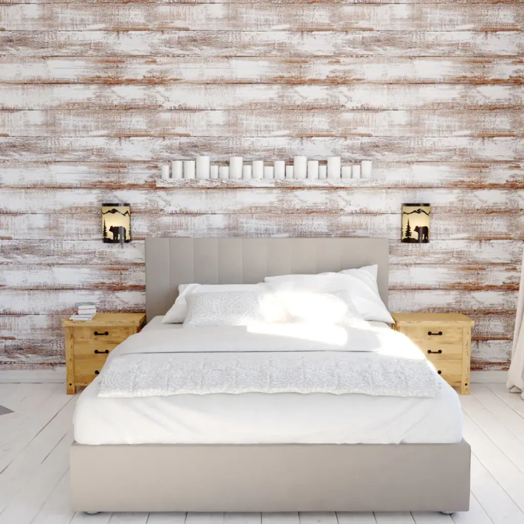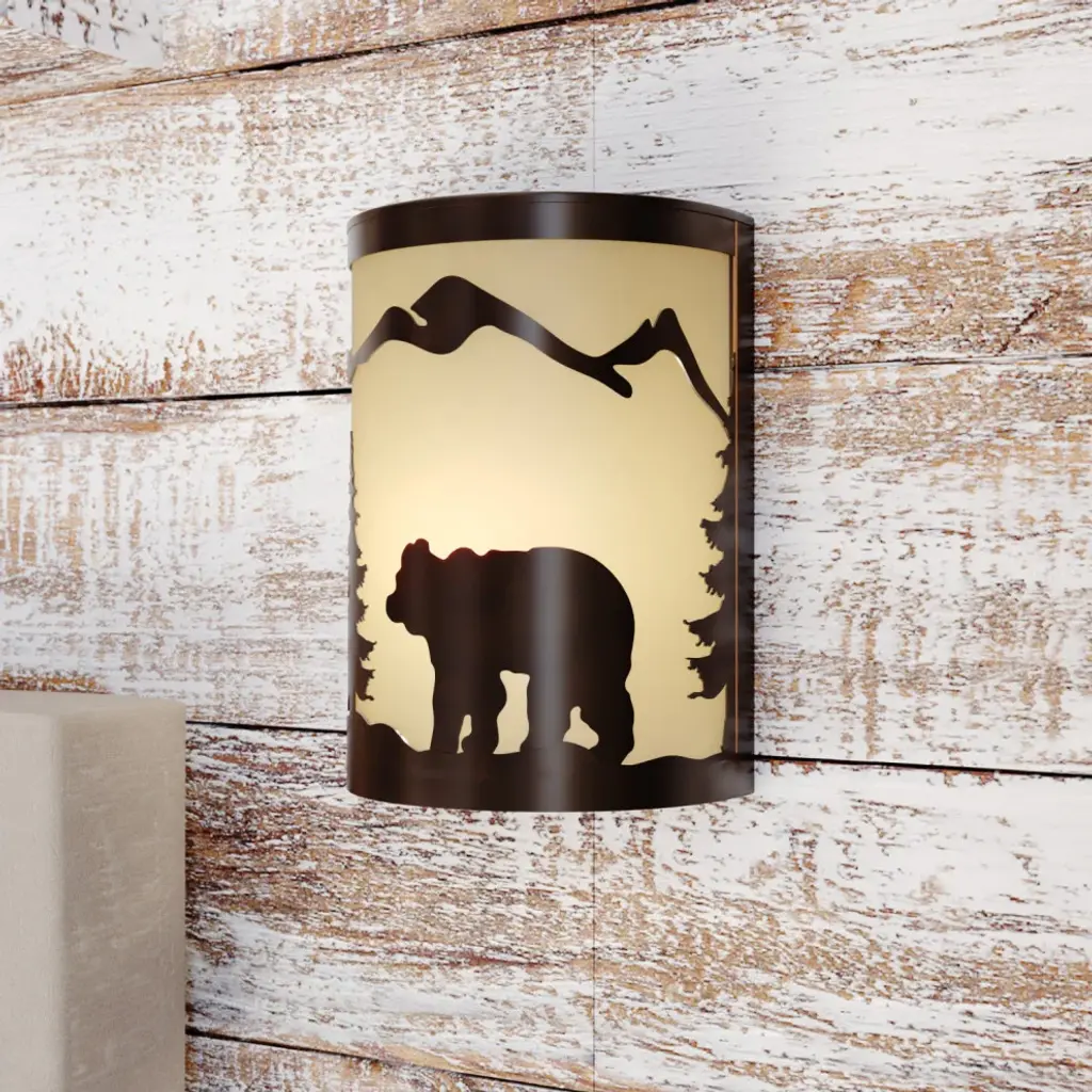 Evoking the spirit of the wilderness, this rustic themed light is clad in a burnished bronze finish and features silhouetted bear imagery atop glowing white tiffany style glass. The classic form of this lamp makes it a great choice for a vacation lodge, cabin or a suburban home - it will complement a variety of home styles: anywhere you want to bring an element of nature. Medium screw base lamping provides maximum light output, and flexibility in bulb choice. This versatile light is outdoor wet rated and can be used indoors as well as outdoors. Mount these lights on your porch, hallway, or entryway and experience this stylish look for yourself.FEATURES:Burnished bronze finish offers a distinctive look and quality steel constructionAmber flake glass provides bright illumination and a rustic feelUses 1 x 100 watt E26 medium base bulb (not included); led compatible8-in W x 11-in H x 5-in DDimmable for desired illumination levels when used with dimmable bulbs and compatible wall switchMounting hardware and instruction manual included for easy installationExterior wet rated; ideal for covered porches, hallways, bathrooms, or any other area of your homeETL, C ETL listing demonstrates this product has met requirements for product safety standards1 Year limited warranty