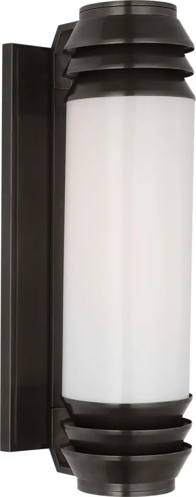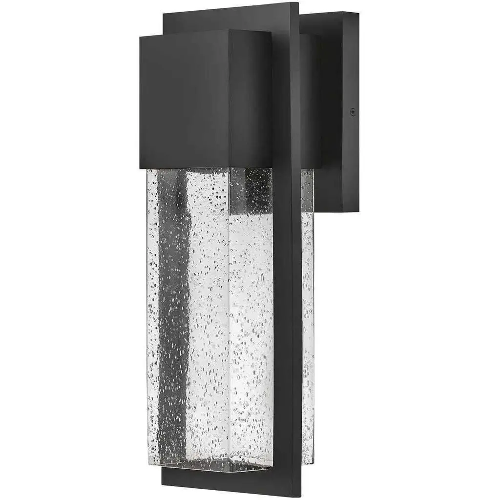 A modern small outdoor LED sconce with an architectural-inspired open linear frame and clear glass diffuser. Finished in Black.