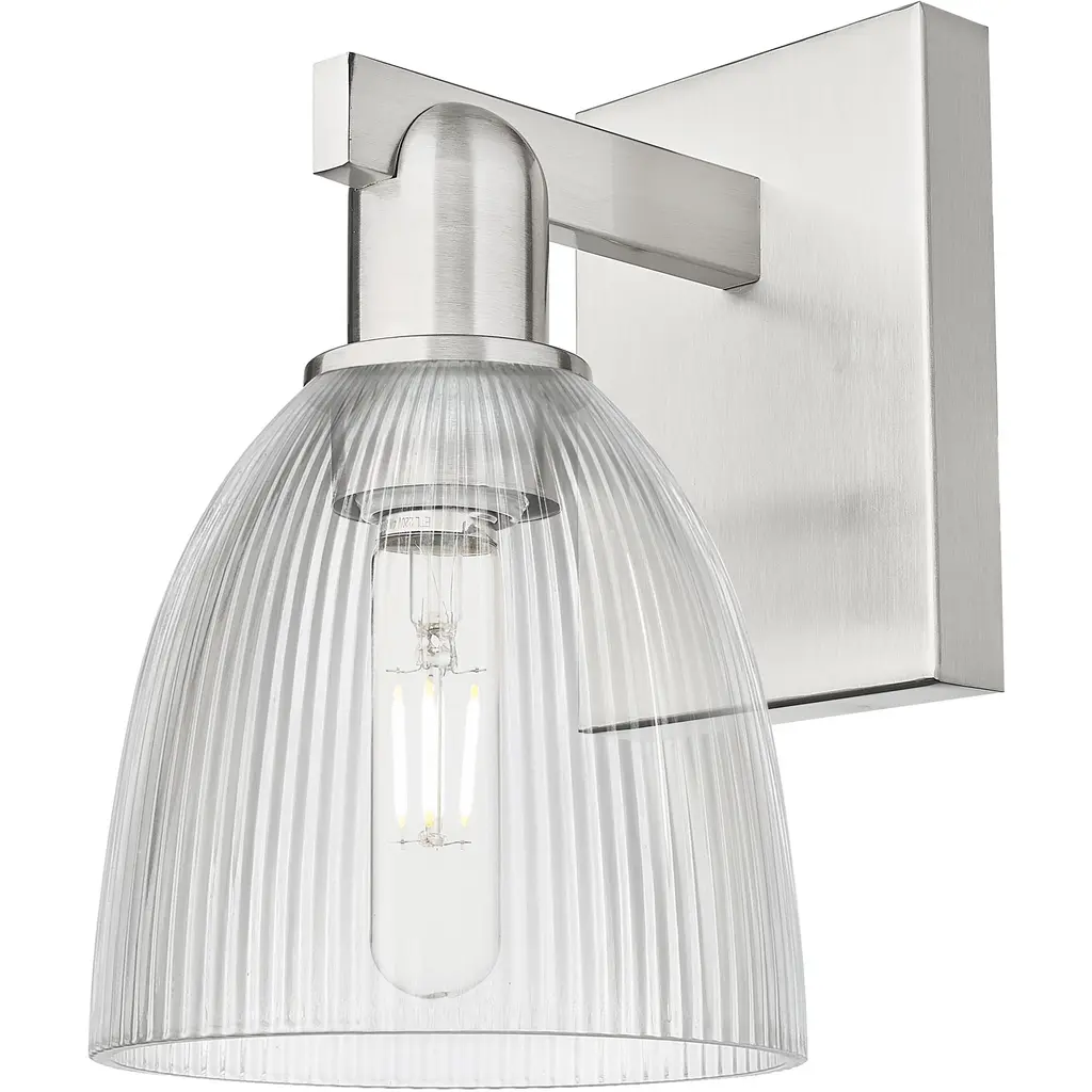 Z-LITE 823-1S-BN 1-Light Wall Sconce, Brushed NickelStyle: Transitional, Classic, Glass, RestorationCollection: LynaFrame Finish: Brushed NickelFrame Material: SteelShade Finish/Color: ClearShade Material: GlassDimension(in): 6.5(L) x 5(W) x 9(H)Backplate Dimension(in): 7.5"(L) x 5"(W)Bulb: (1)100W Medium Base,Dimmable(Not Included)Vanity/Sconce Dual Mount (Up And Down): YesUL Classification: ETLUL Application: Damp.