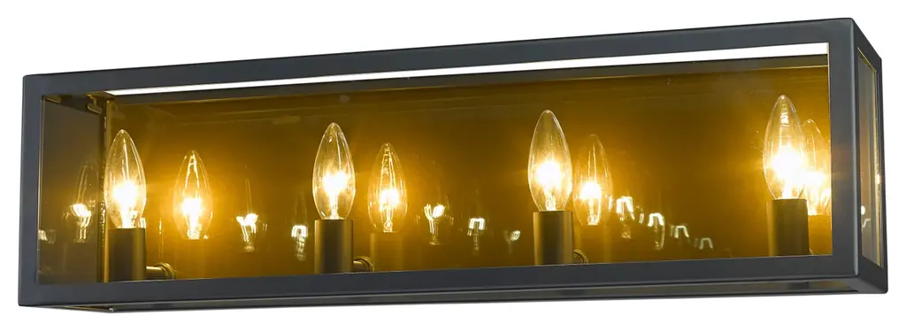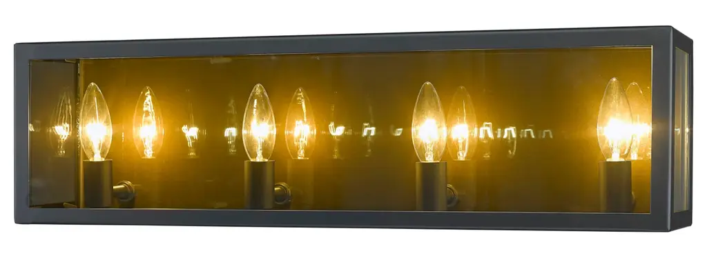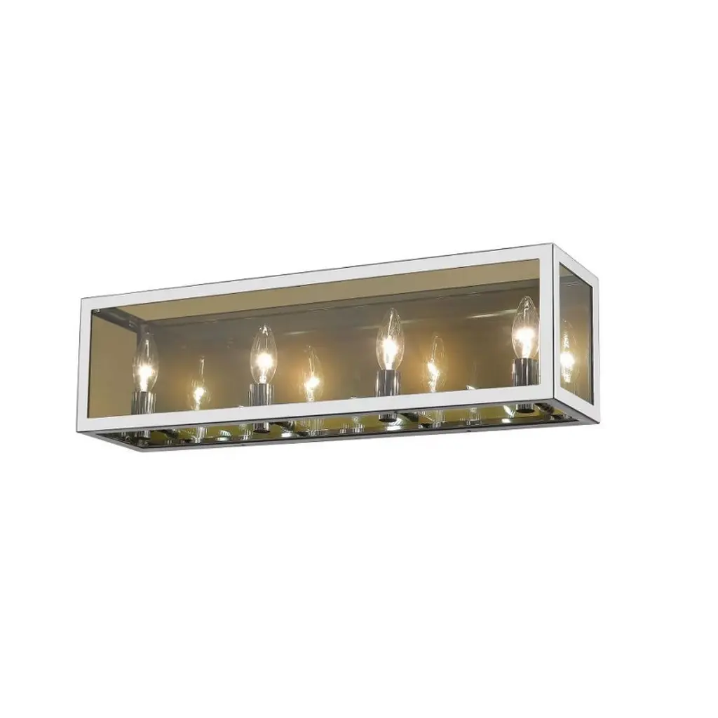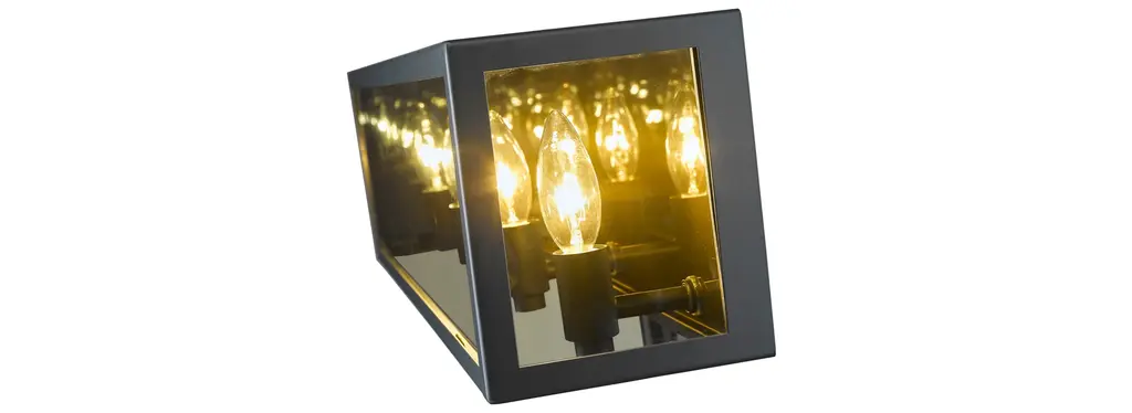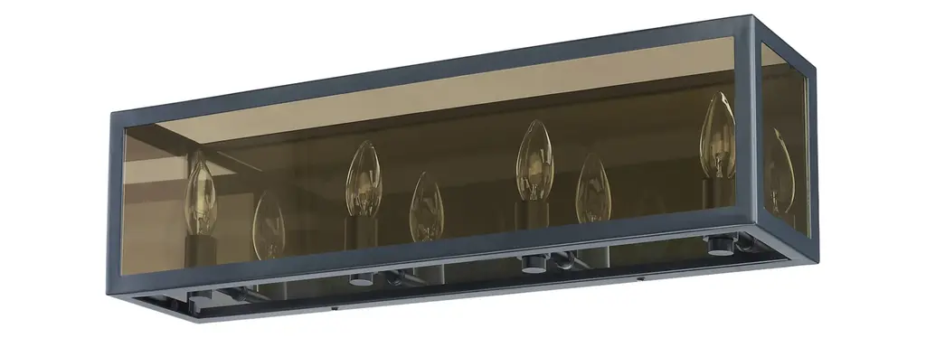 The infinity fixtures illuminate to reveal rows and rows of lights that appear endless. Inspired by the mirrors of the 70s, this collection on will add the perfect drama to any living or dining room. Available in polished chrome or misty charcoal. Features Constructed from steel Includes smoked reflective glass shades (4) 60 watt maximum candelabra (E12) bulbs required Dimmable with compatible dimming bulbs UL, CUL, and ETL rated for damp locations Dimensions Height: 6-3/4" Width: 24" Extension: 5-3/4" Product Weight: 13 lbs Electrical Specifications Number of Bulbs: 4 Max Watts Per Bulb: 60 watts Bulb Base: Candelabra (E12) Bulbs Included: No