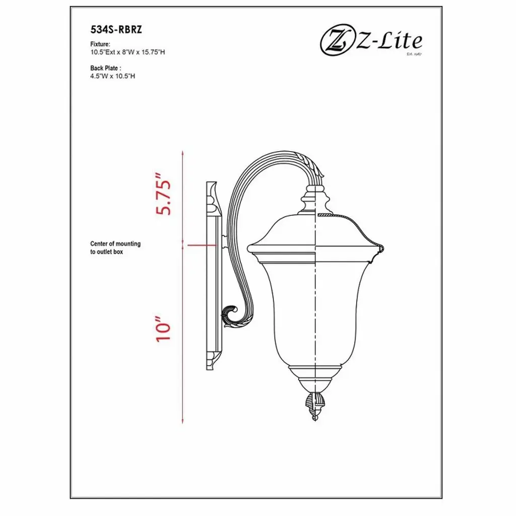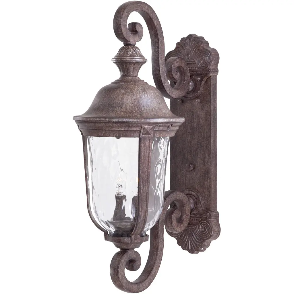 Traditional charm emanates from this small outdoor wall mount fixture, which pairs clear water glass with rubbed bronze hardware for a timeless look. Outdoor Living Shade Included: Yes Dimmable: Yes Material: Aluminum, Finish Color: Bronze, Width: 8", Height: 15.75", Length: 10.375", Depth: 10.38", Backplate Width: 10.5", Backplate Length: 4.5", Lamping Type: Incandescent, Number Of Bulbs: 1, Wattage: 100 Watts, Dimmable: Yes, Moisture Rating: Wet Rated
