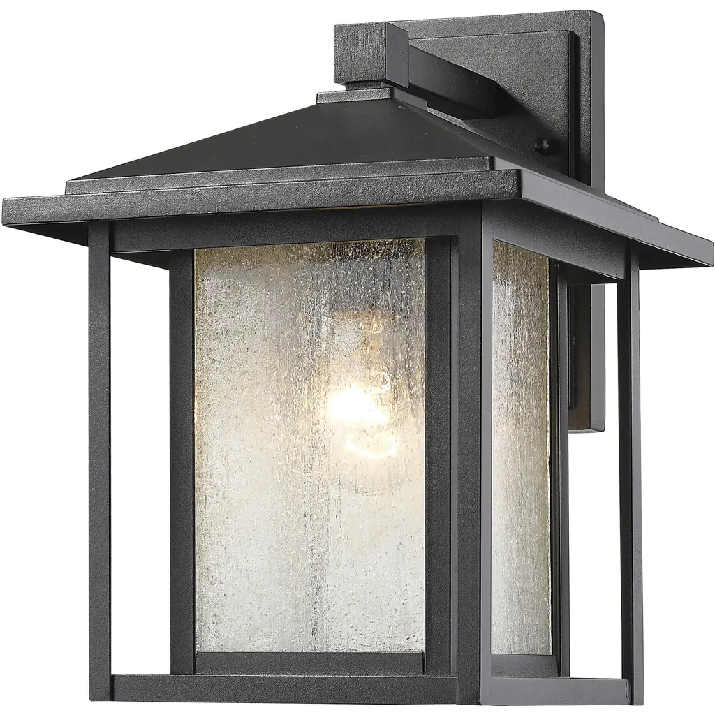 With its sturdy dual frames encasing uniqueseedy glass panels, the Aspen collection exudes a classic craftsmen style that is bold yet charming. Available in Black or Oil Rubbed Bronze, these fixtures will accent any outdoor setting. Outdoor Living/Deck/Patio Shade Included: Yes Dimmable: Yes Material: Aluminum, Finish Color: Black, Width: 9", Height: 13", Length: 10", Depth: 10", Backplate Width: 7.5", Backplate Length: 4.25", Lamping Type: Incandescent, Number Of Bulbs: 1, Wattage: 100 Watts, Dimmable: Yes, Moisture Rating: Wet Rated