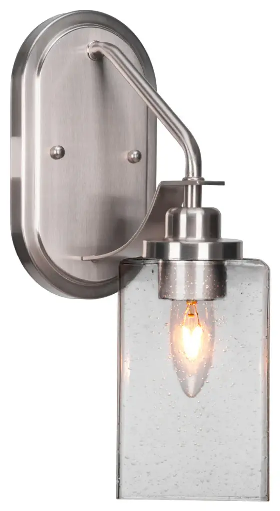 Classic elegance and a beautifully neutral finish create a fixture that expresses design personality in a bath or living space. This brushed nickel steel wall sconce gains soft touches from a romantic clear seedy glass shade and delivers a sophisticated, artistic addition to contemporary or transitional decor. Bathroom/Powder Room/Bedroom/Hallway Mounting Direction: Up/Down Shade Included: Yes Dimmable: Yes