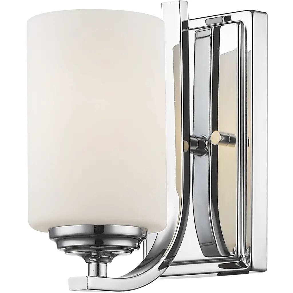 The circular base and the waterfall arms of the Bordeaux family is modernized by the soft matte opal shades which is paired with chrome fittings. Bathroom/Powder Room/Bedroom/Hallway Mounting Direction: Up/Down Shade Included: Yes Dimmable: Yes Material: Glass, Finish Color: Chrome, Width: 4.75", Height: 8.5", Length: 6.5", Depth: 6.5", Backplate Width: 7.25", Backplate Length: 4.75", Lamping Type: Incandescent, Number Of Bulbs: 1, Wattage: 100 Watts, Dimmable: Yes, Moisture Rating: Damp Rated