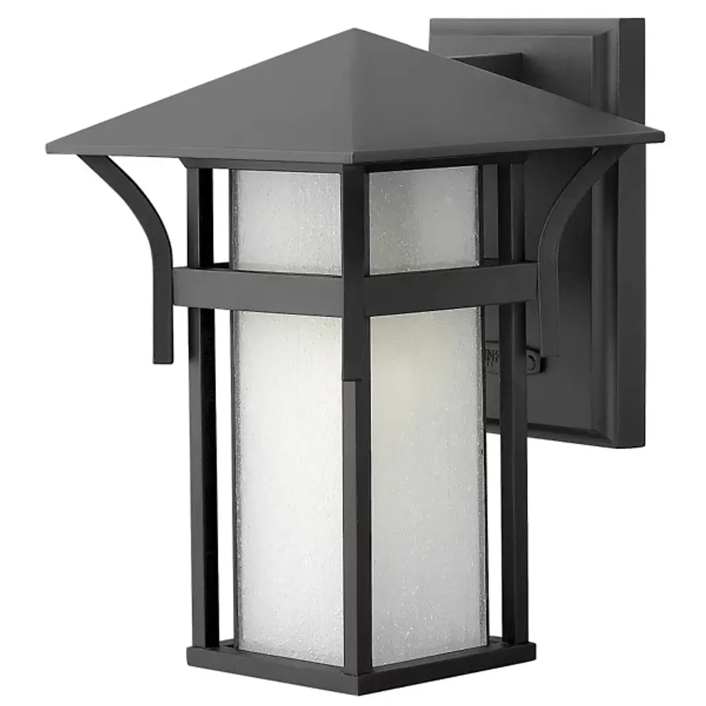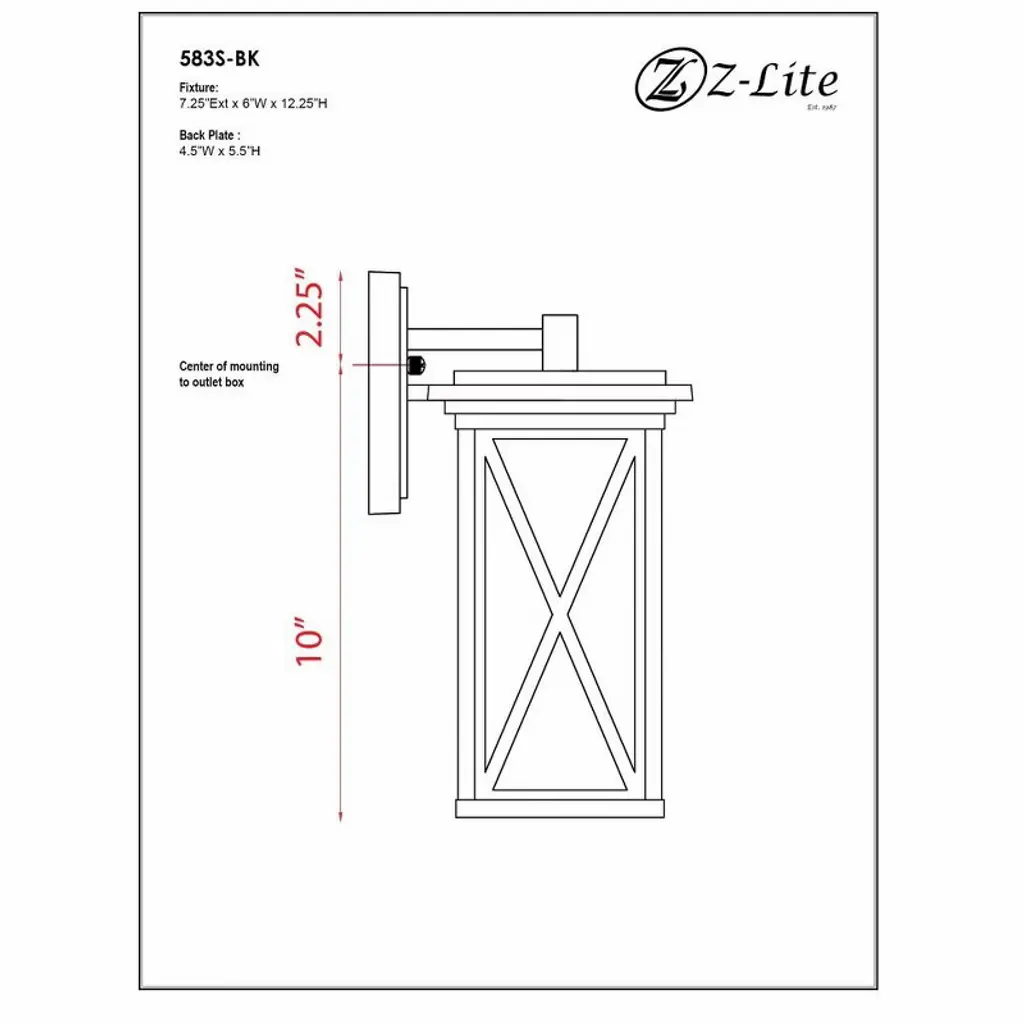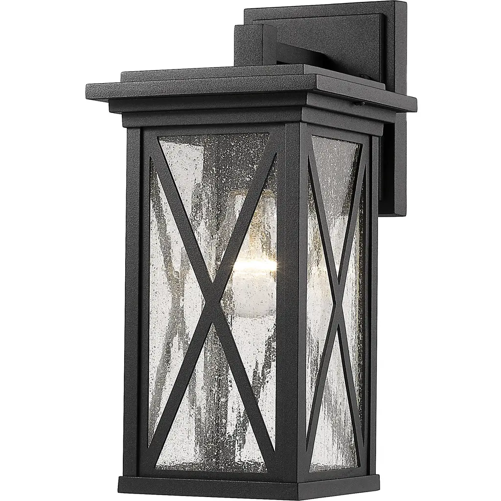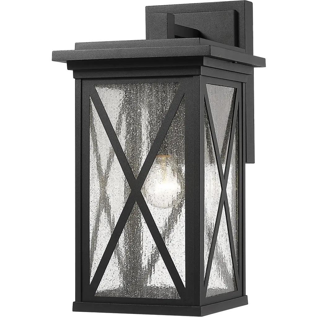This one-light outdoor wall sconce comes in a box-shaped black aluminum cage with a clear seedy glass finish that softly diffuses light to provide a welcoming glow to your front entrance or patio. Compelling X-accents bring dimension and character. Perfect for offering an optimal lighting source targeted for your outdoor needs. Outdoor Living/Deck/Patio Shade Included: Yes Dimmable: Yes