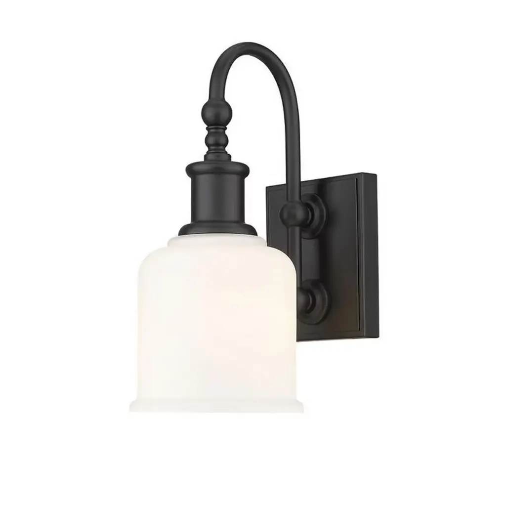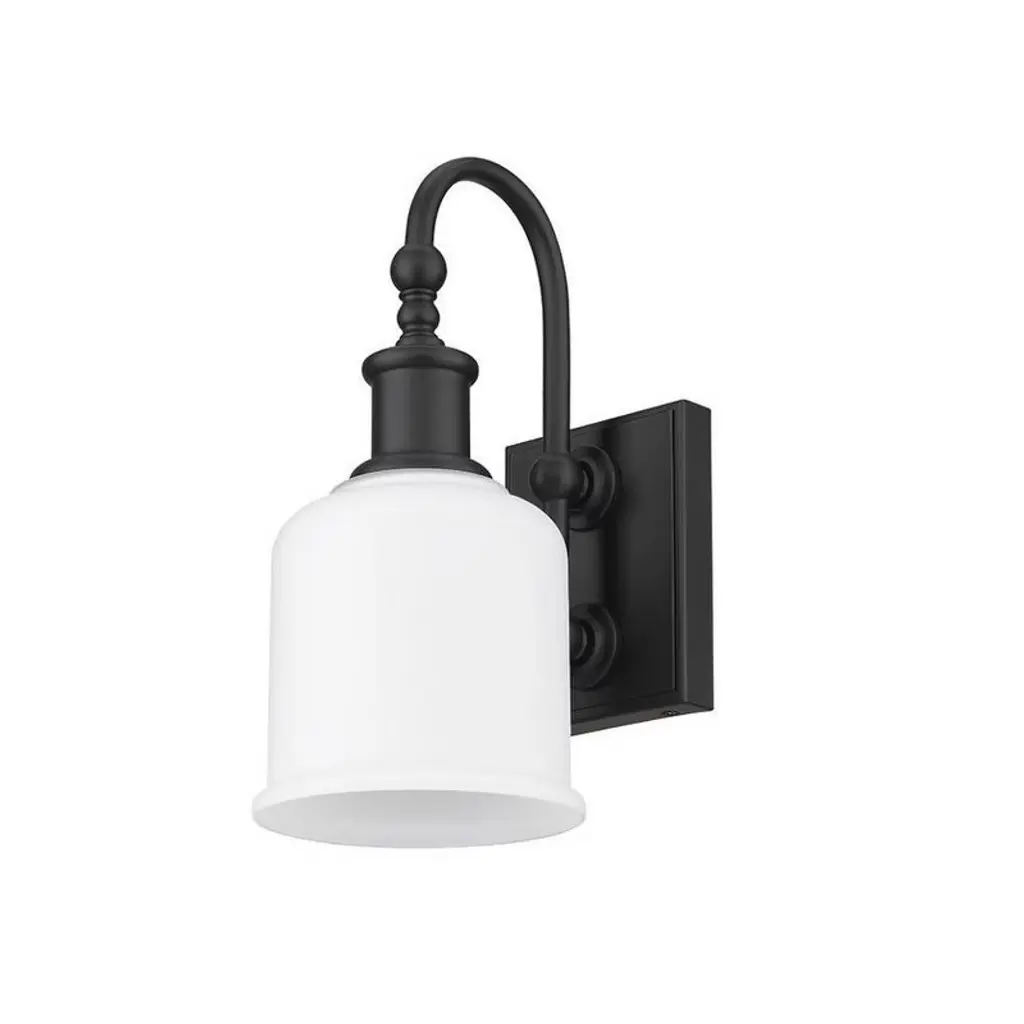Soft nautical vibes bring a nostalgic romantic vibe to the Bryant one-light wall sconce. Create a themed visual with this tasteful fixture crafted of matte black finish steel, blending beautifully with an opal glass shade. A curved arm and lipped shade generate extra charm that stylizes a custom bath space, dining area, or main living room. Dimmable: Yes Shade Included: Yes