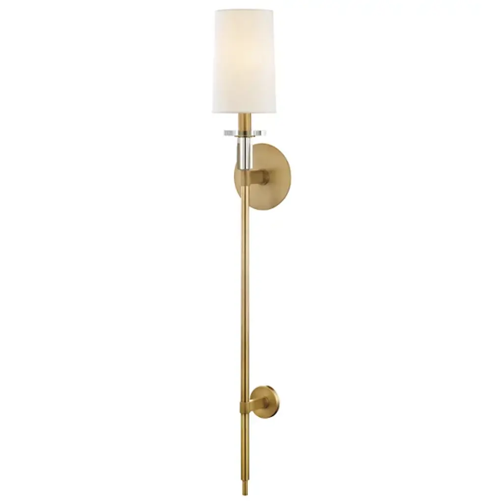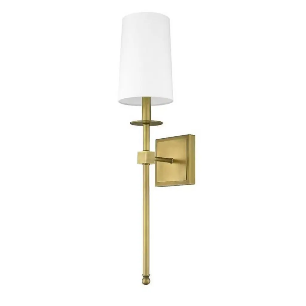 Long lines and an elegantly simple motif lend sophistication to this contemporary rubbed brass finish one-light wall sconce. Mirroring a traditional lamp motif, its steel frame and wall mount join a tall white fabric shade to form a decadent look with versatility for use in a bathroom, bedroom, or hallway. Dimmable: Yes Shade Included: Yes
