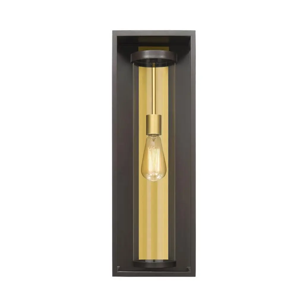 Minimal and understated, this modern outdoor wall sconce from the Dunbroch collection makes a wonderful addition to a patio or deck entertainment area. Its tall box-like aluminum frame features three open sides in a deep bronze and contrasting, warm golden brass finishes. Perfect for mounting in an outdoor veranda, a single drop down light sits inside a clear cylindrical globe, which casts a lovely glow. Outdoor Living/Deck/Patio Shade Included: Yes Dimmable: Yes