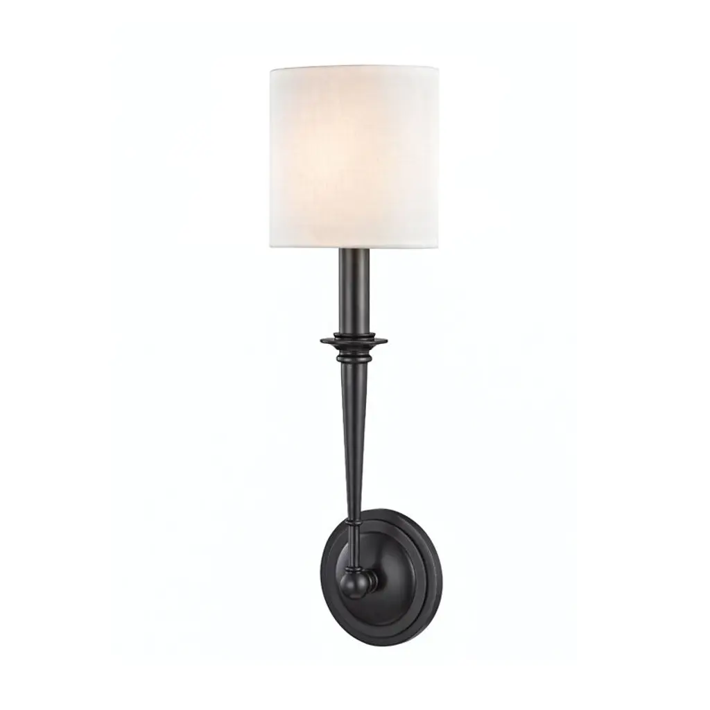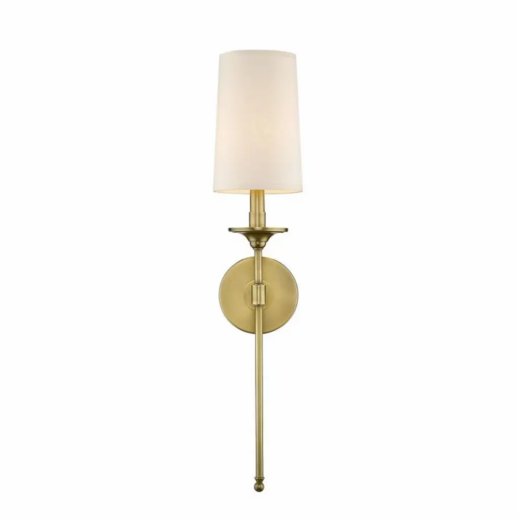 Warm rubbed brass finish steel stands out in the design of this one-light wall sconce, an ideal selection to enhance a modern or transitional bathroom, bedroom, or hallway. Refined detailing pairs a rubbed brass finish wall mount and stem with a fresh white fabric shade, creating a classic look that offers mood-inspiring ambient lighting. Bathroom/Powder Room/Bedroom/Hallway Shade Included: Yes Dimmable: Yes