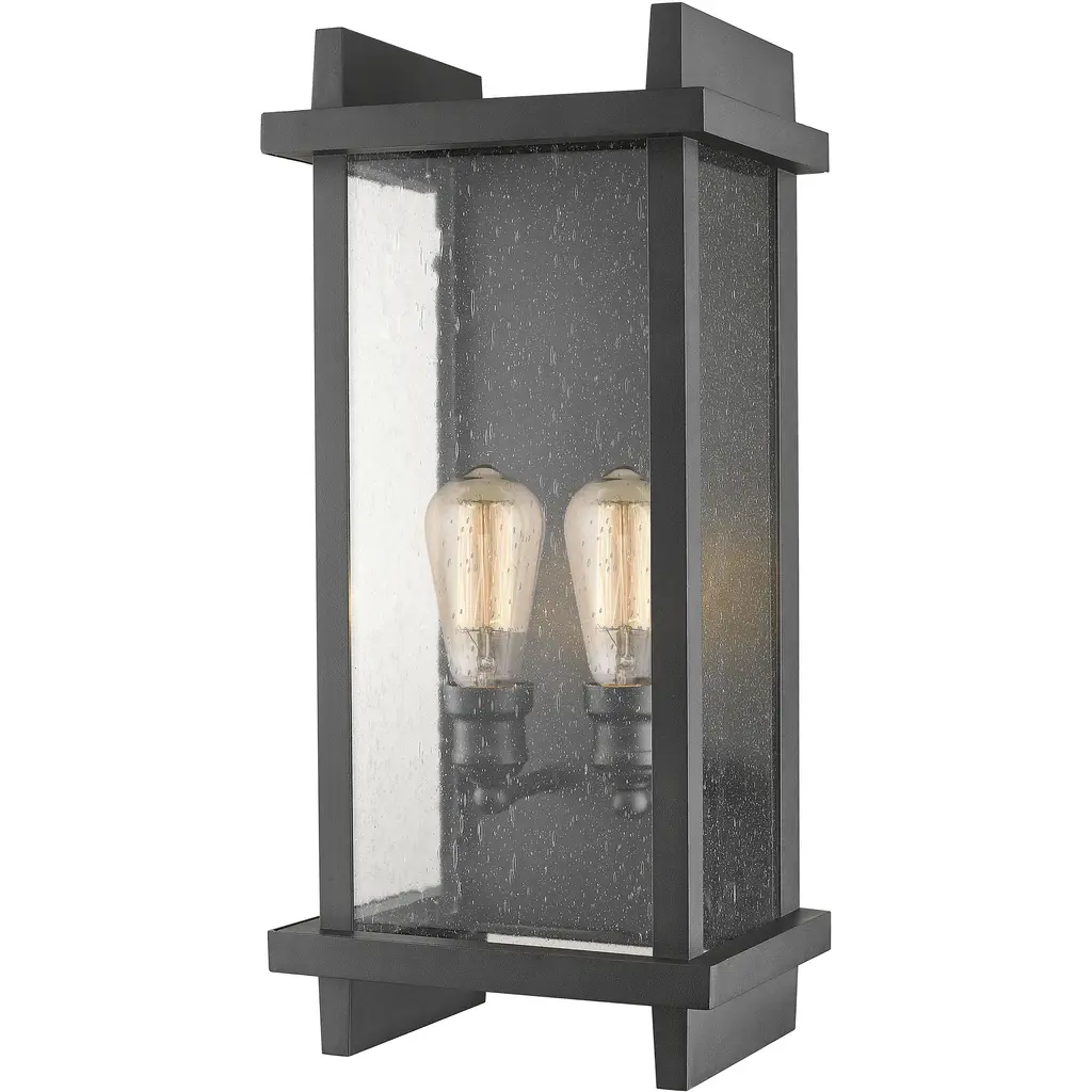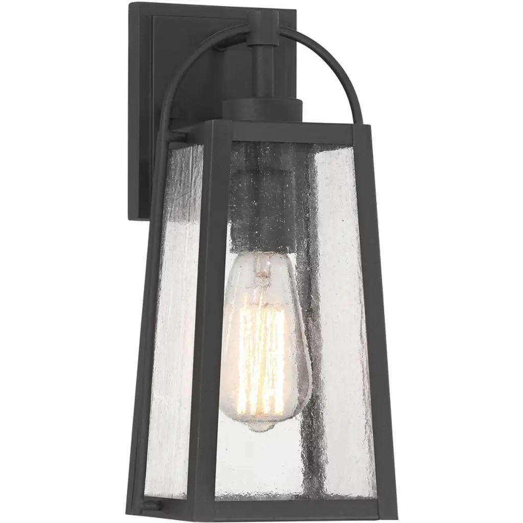 For a touch of ambient lighting, place this black aluminum one-light outdoor wall sconce in a pivotal spot. Beautiful seedy glass panels create a protective shield over a sweet vintage-era bulb, creating a stylish mix of contemporary and traditional. Outdoor Living/Deck/Patio Shade Included: Yes Dimmable: Yes Material: Aluminum, Finish Color: Black, Width: 8", Height: 17.38", Length: 6", Depth: 6", Backplate Width: 14.25", Backplate Length: 7.75", Lamping Type: Incandescent, Number Of Bulbs: 1, Wattage: 100 Watts, Dimmable: Yes, Moisture Rating: Wet Rated
