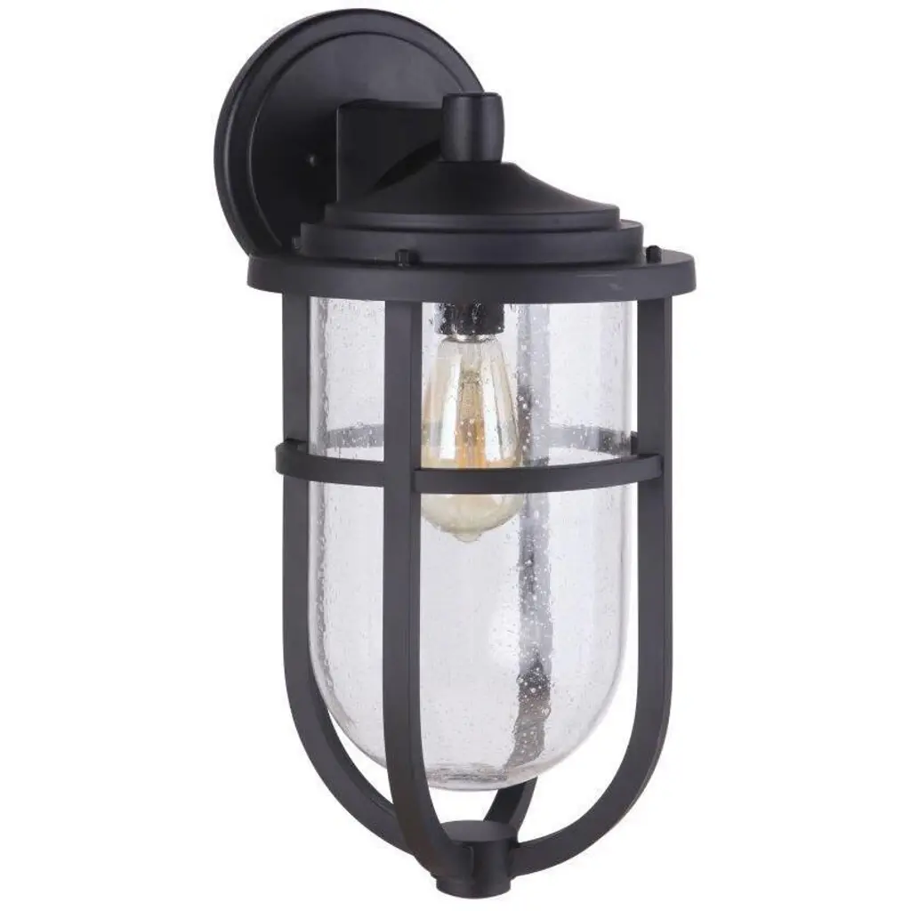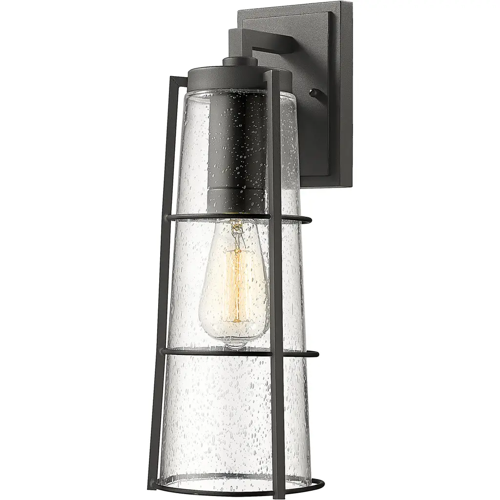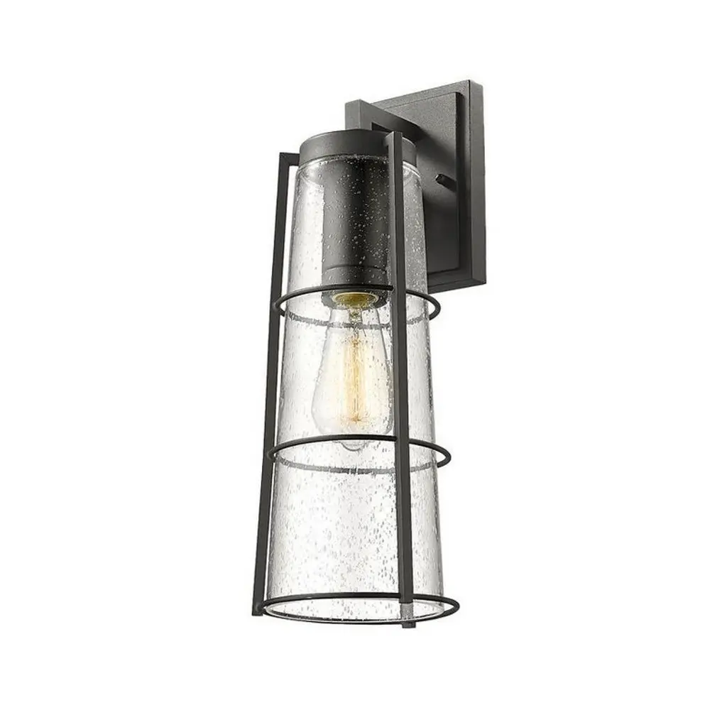 Moving vintage in a modern direction, this single-light outdoor wall sconce features a village-inspired look with nautical flavor. Embrace a hand-worked black finish aluminum frame that holds a conical clear seeded glass shade and adds linear accents showcasing a lantern effect. This light from the Helix collection borrows from industrial influenced aesthetics and supplies plenty of personality. Dimmable: Yes Shade Included: Yes