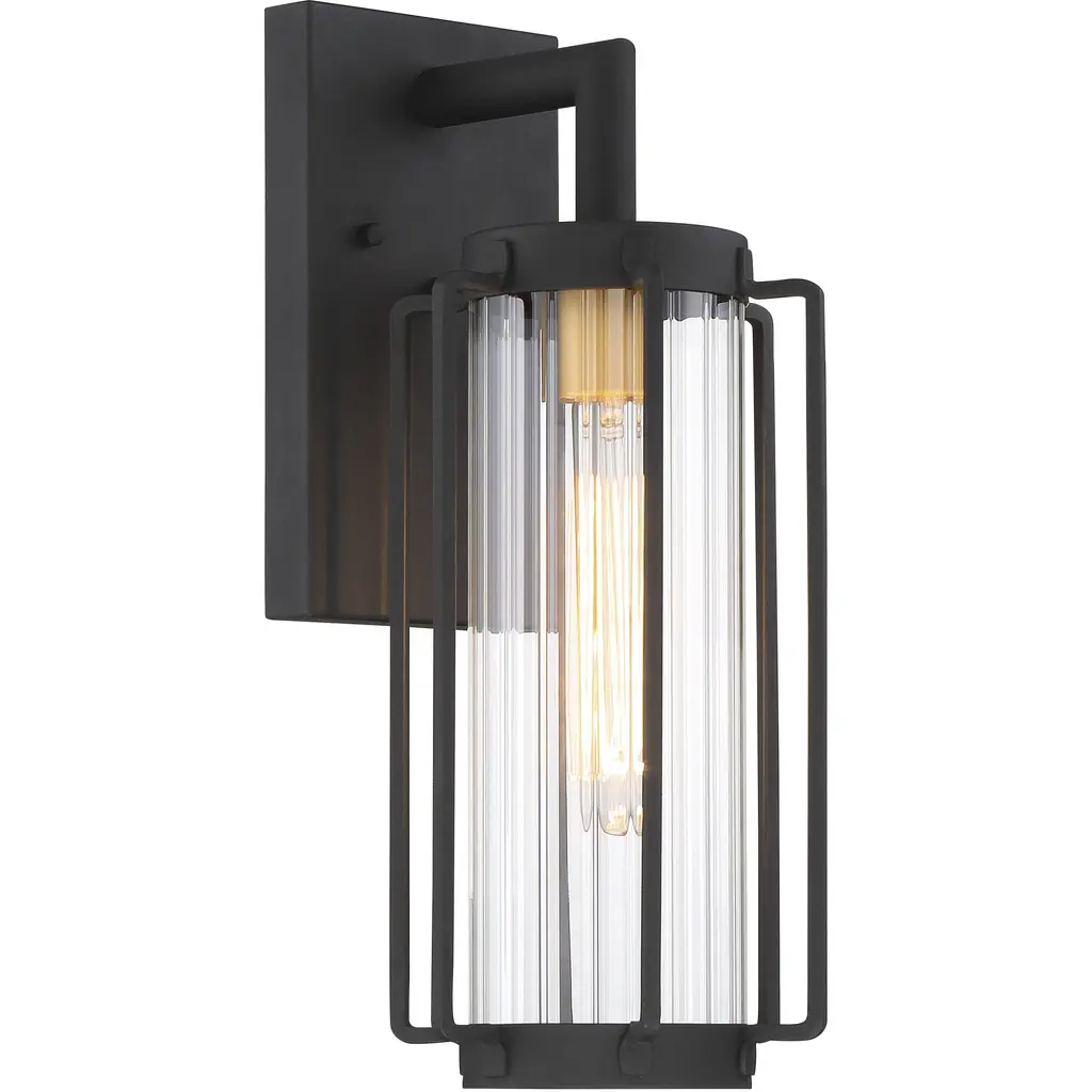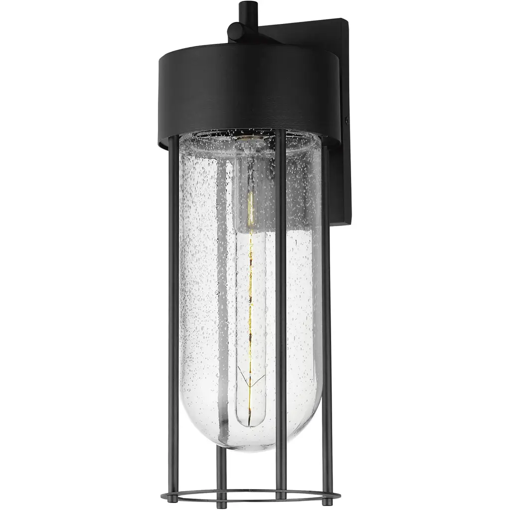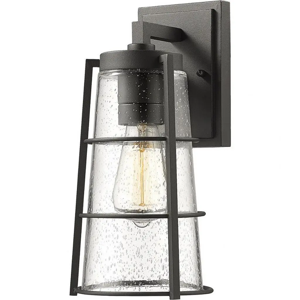 Moving vintage in a modern direction, this single-light outdoor wall sconce features a village-inspired look with nautical flavor. Embrace a hand-worked black finish aluminum frame that holds a conical clear seeded glass shade and adds linear accents showcasing a lantern effect. This light from the Helix collection borrows from industrial influenced aesthetics and supplies plenty of personality. Dimmable: Yes Shade Included: Yes