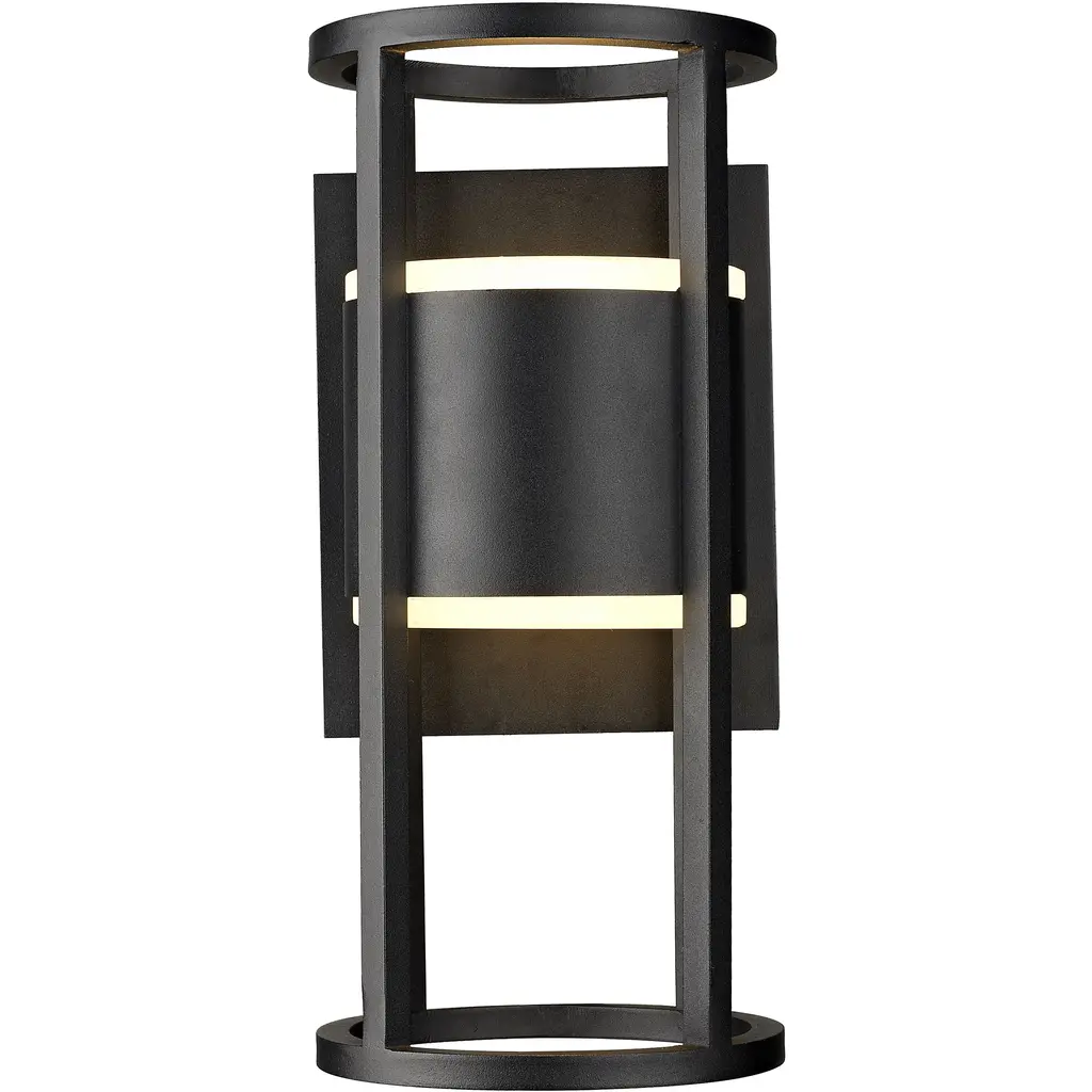 An eye-catching design blueprint brings energy and industrial style to complement a chic exterior space. This two-light outdoor wall sconce from the Luca series offers an openwork cylinder frame and wall plate featuring black aluminum with an etched glass diffuser. LED lighting offers energy efficiency to embellish its value. Material: Aluminum, Finish Color: Black, Width: 5.75", Height: 12", Length: 6.25", Backplate Width: 5.75", Backplate Length: 7", Lamping Type: LED, Number Of Bulbs: 2, Wattage: 6 Watts, Cri: 90, Color Temperature: 2700 Kelvin, Lumens: 400, Dimmable: Yes, Moisture Rating: Wet Rated