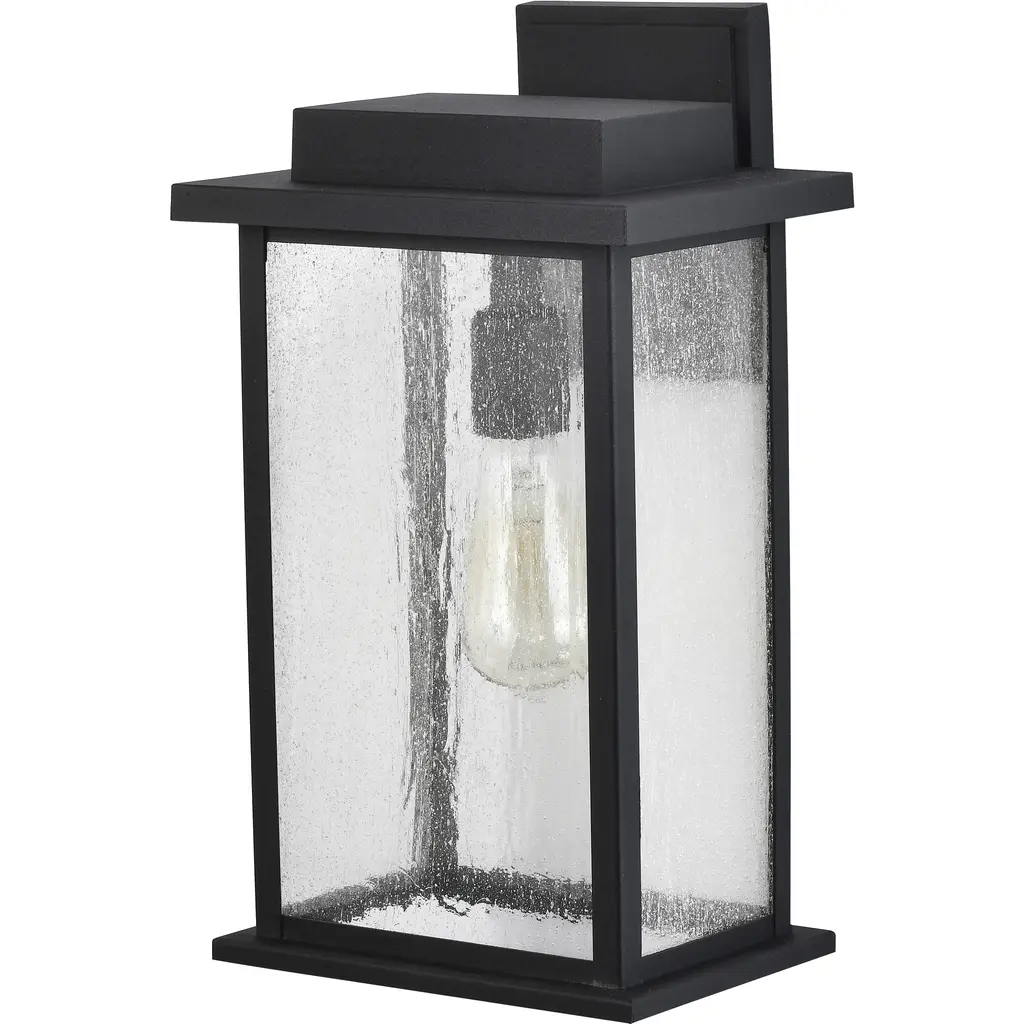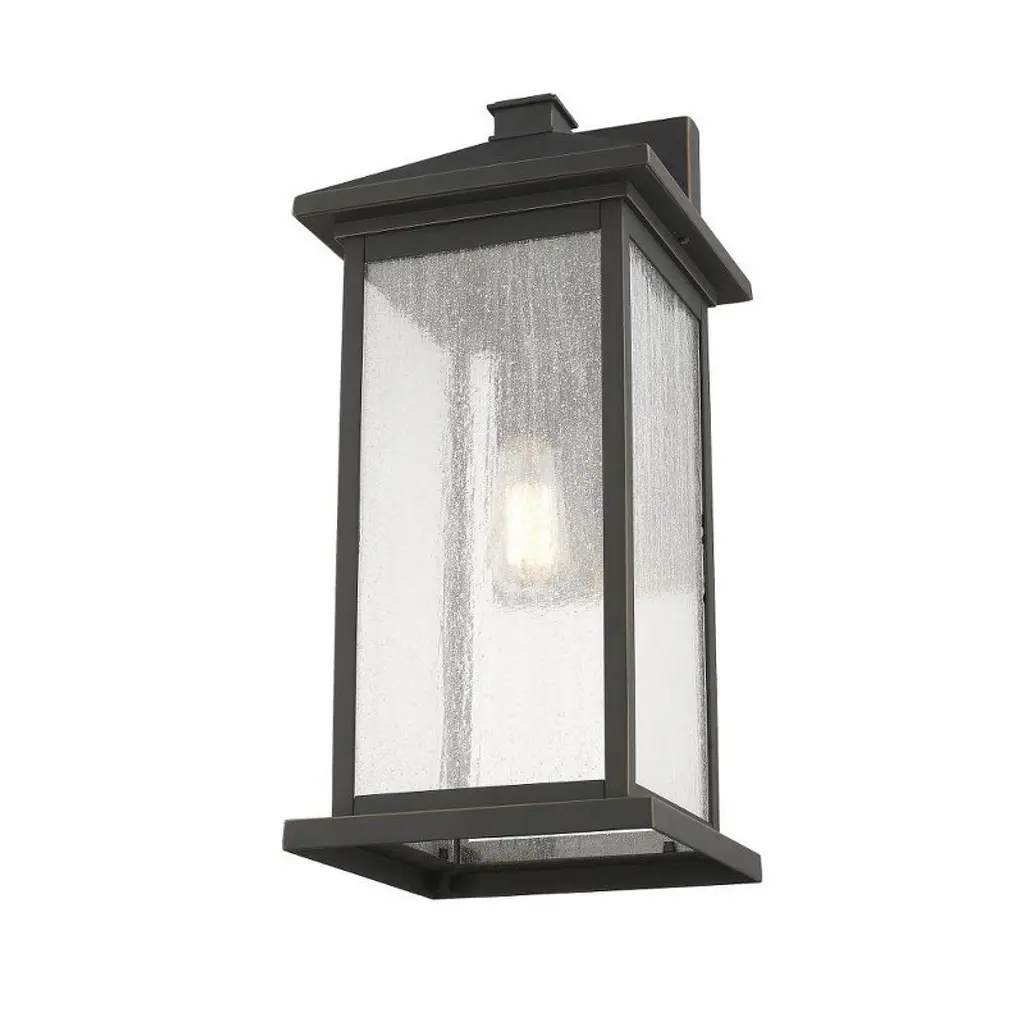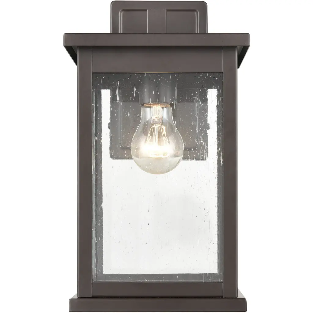 Sophisticated elements from this one-light wall lantern looks great in a streamlined garden. Cast a bright glow from the clear seeded glass shade, elevated with an outdoor rubbed bronze finish. Outdoor Living Shade Included: Yes Dimmable: Yes Material: Glass, Finish Color: Black, Width: 9.5", Height: 22", Length: 10.75", Depth: 10.75", Backplate Width: 14", Backplate Length: 6", Lamping Type: Incandescent, Number Of Bulbs: 1, Wattage: 100 Watts, Dimmable: Yes, Moisture Rating: Wet Rated