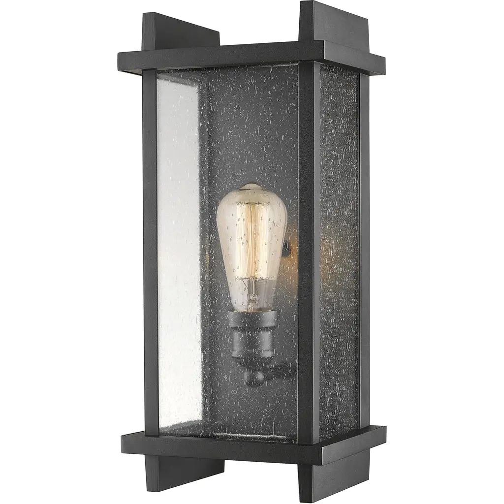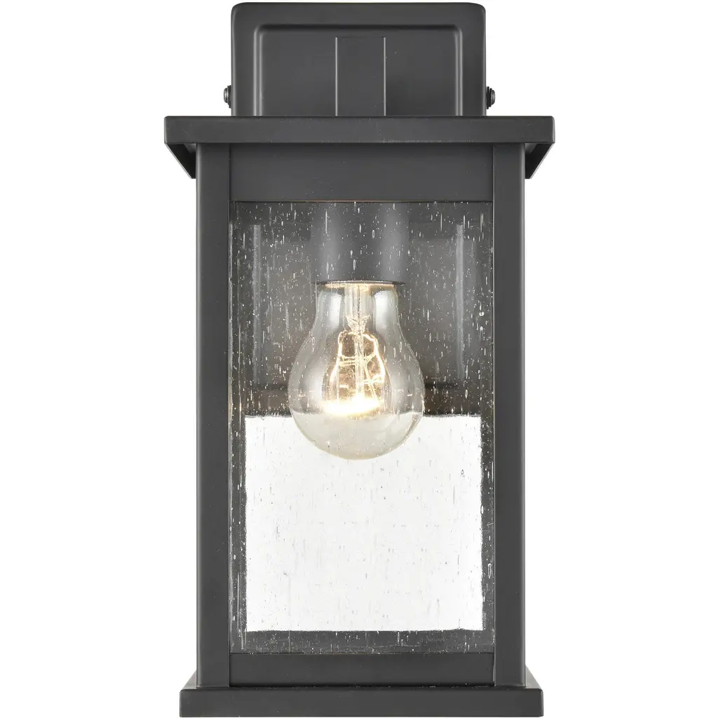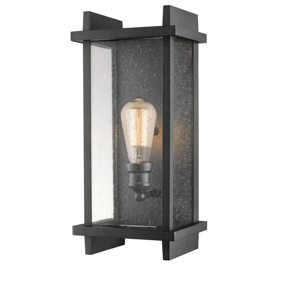 Sophisticated elements from this one-light wall lantern looks great in a streamlined garden. Cast a bright glow from the clear seeded glass shade, elevated with an outdoor rubbed bronze finish. Outdoor Living Shade Included: Yes Dimmable: Yes Material: Glass, Finish Color: Black, Width: 9.5", Height: 22", Length: 10.75", Depth: 10.75", Backplate Width: 14", Backplate Length: 6", Lamping Type: Incandescent, Number Of Bulbs: 1, Wattage: 100 Watts, Dimmable: Yes, Moisture Rating: Wet Rated