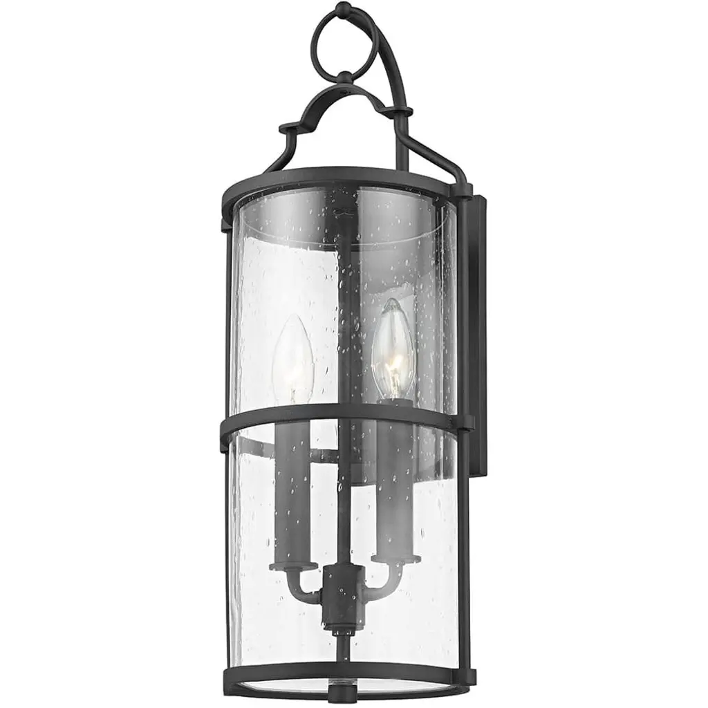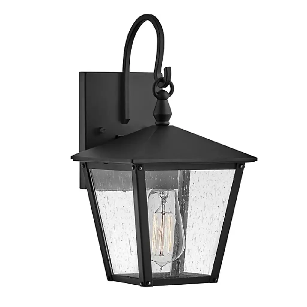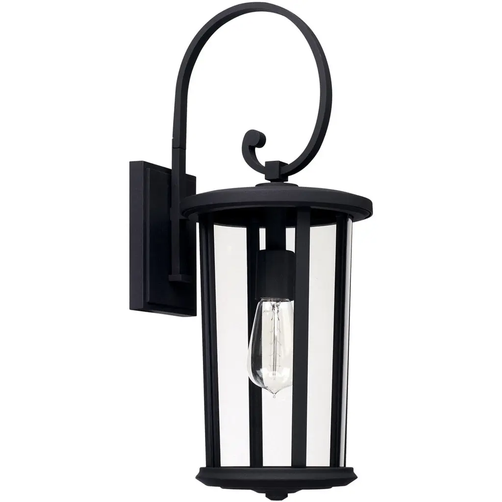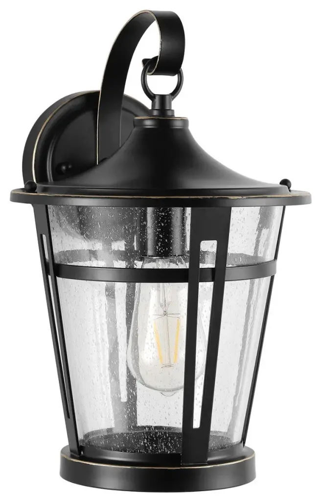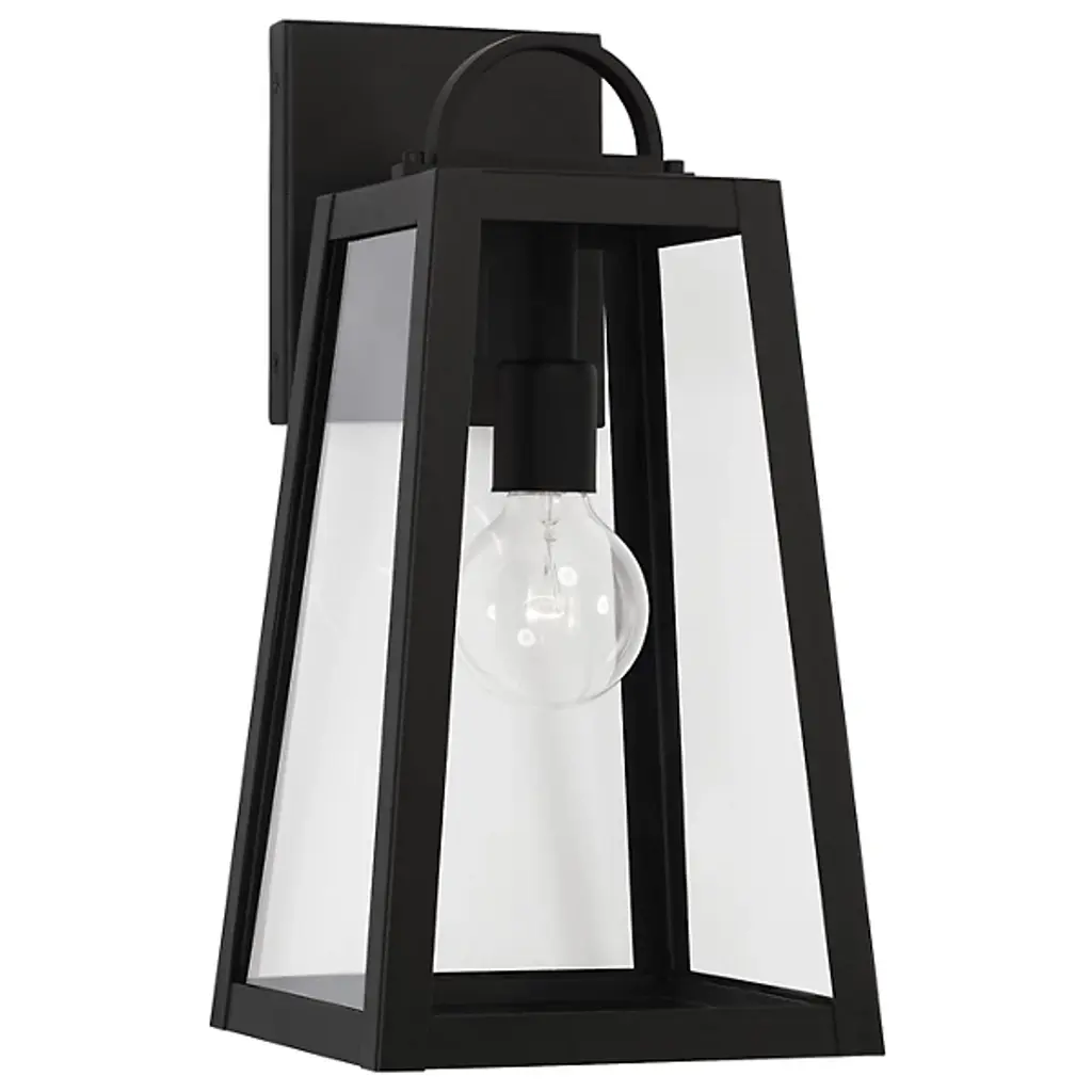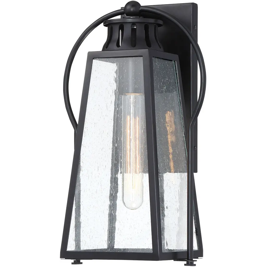 This one-light outdoor wall sconce can revitalize the look of your porch, deck or patio space with its lantern-like appearance and strikingly modern silhouette. Black aluminum creates a bold accent, capping the top and bottom of a cylindrical shade that's finished with clear seedy glass. The LED bulb effectively illuminates your space, making this a clear choice for sleek, energy-efficient exterior lighting. Outdoor Living/Deck/Patio Shade Included: Yes Dimmable: Yes