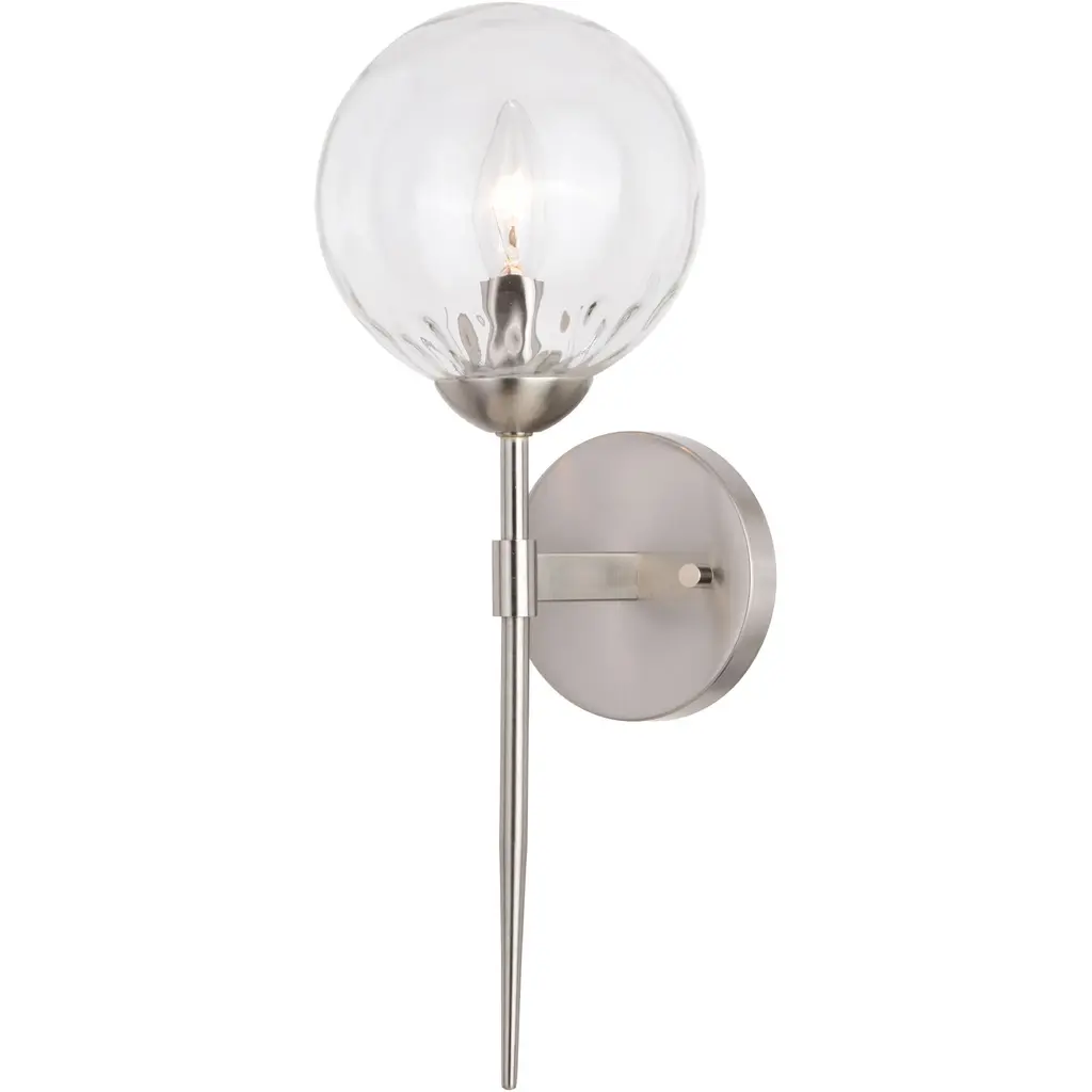 Graceful curves create the perfect circle design elements that define this contemporary one-light wall sconce. Its familiar, torch-inspired silhouette is adorned with a brushed gold finish for warm, glamorous flair in an entry or living room. An open-edged, clear glass globe shade adds precision to a fixture that can be mounted either up or down to best suit your space and preference.