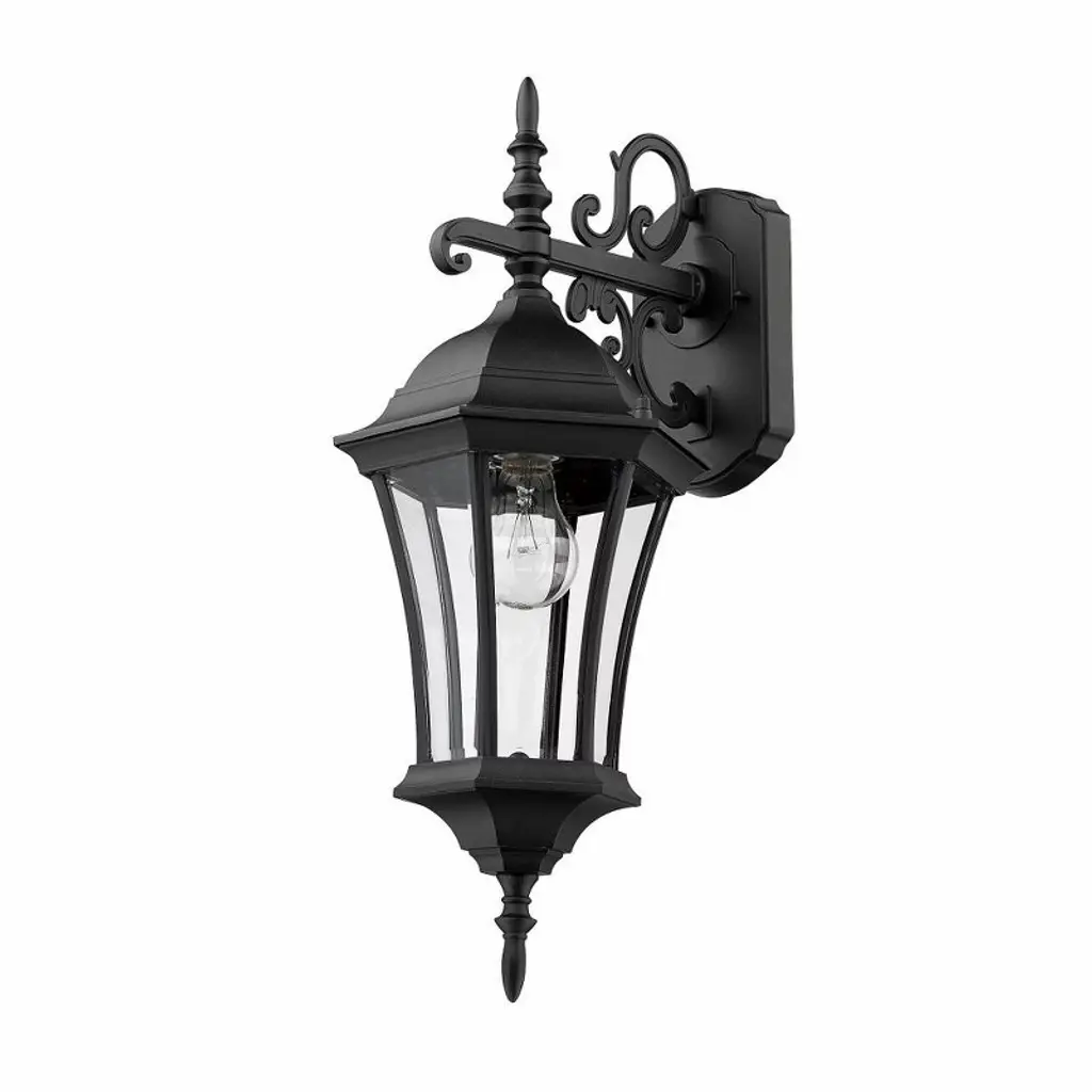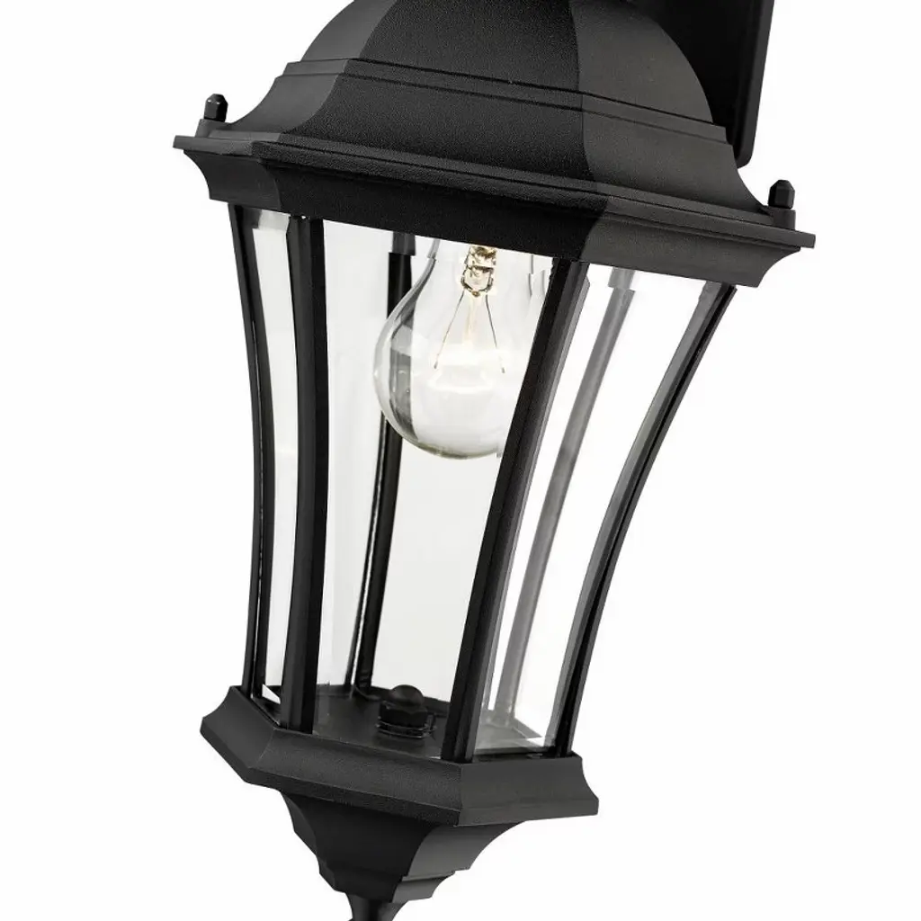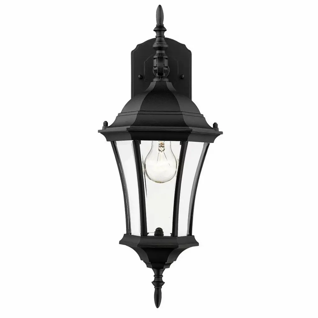 For a bold look, this small wall mount is sure to please. Using bold detailing finished in black, and clear beveled glass for a bright spill of light, this fixture is sure to create a unique statement. These fixtures are made of aluminum for years of durability Outdoor Living Shade Included: Yes Dimmable: Yes