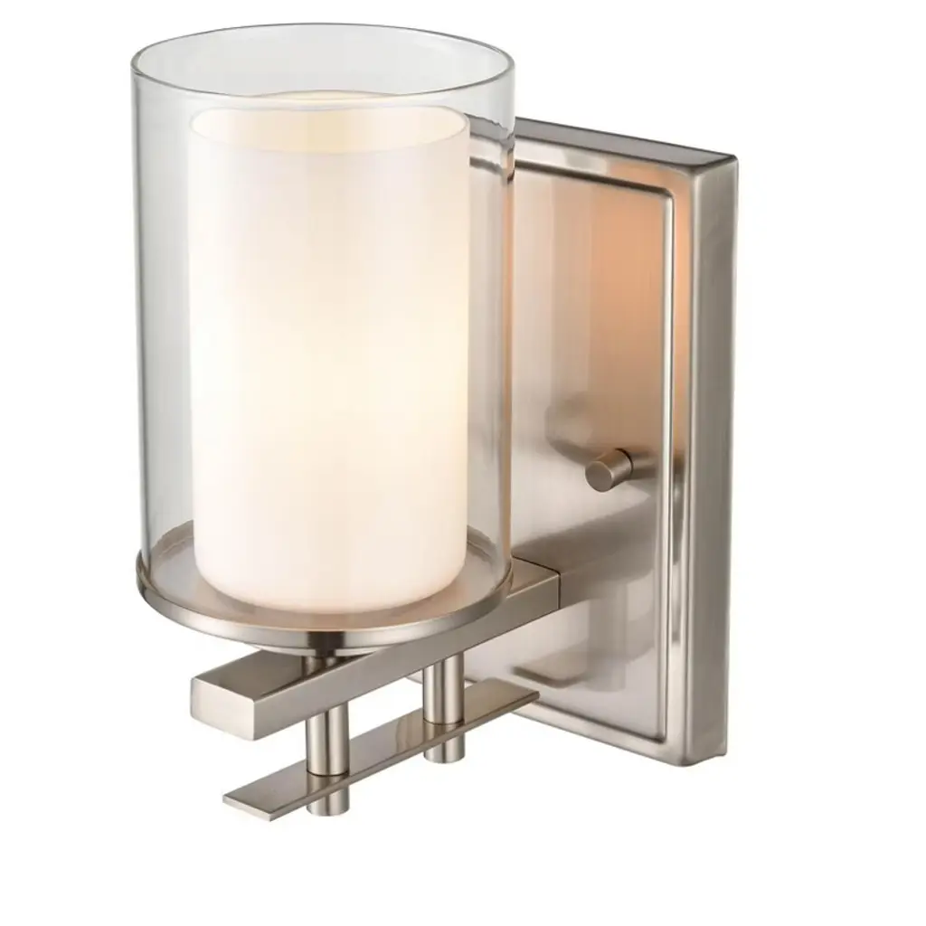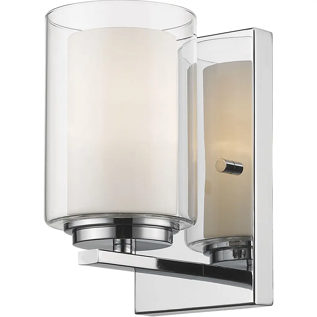 Clean, graceful lines of the arms + glass shades define the Willow family. Chrome fixtures and inner matte opal with clear outer glass shades create clean and unique designs. Bathroom/Powder Room/Bedroom/Hallway Mounting Direction: Up/Down Shade Included: Yes Dimmable: Yes Material: Steel, Finish Color: Chrome, Width: 4.5", Height: 8", Length: 6", Depth: 6", Backplate Width: 8", Backplate Length: 4.5", Lamping Type: Incandescent, Number Of Bulbs: 1, Wattage: 100 Watts, Dimmable: Yes, Moisture Rating: Damp Rated