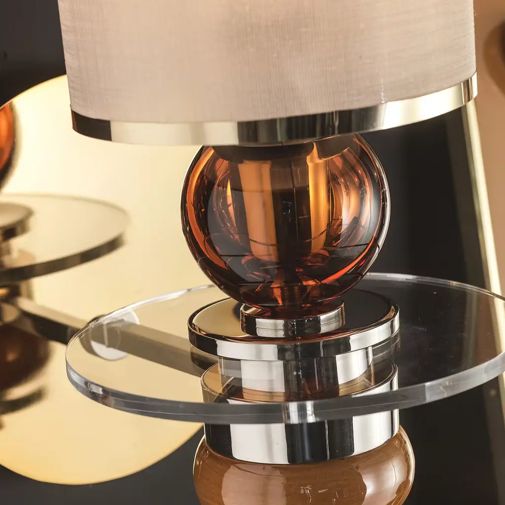 The reflective, shiny surface of this lamp's gold-plated brass wall mount stands in stands in stark contrast to the soft, muted illumination emanating from within its gold laminate shade. The style is completed by details in plexiglass, along with amber-colored crystal and majolica pottery.