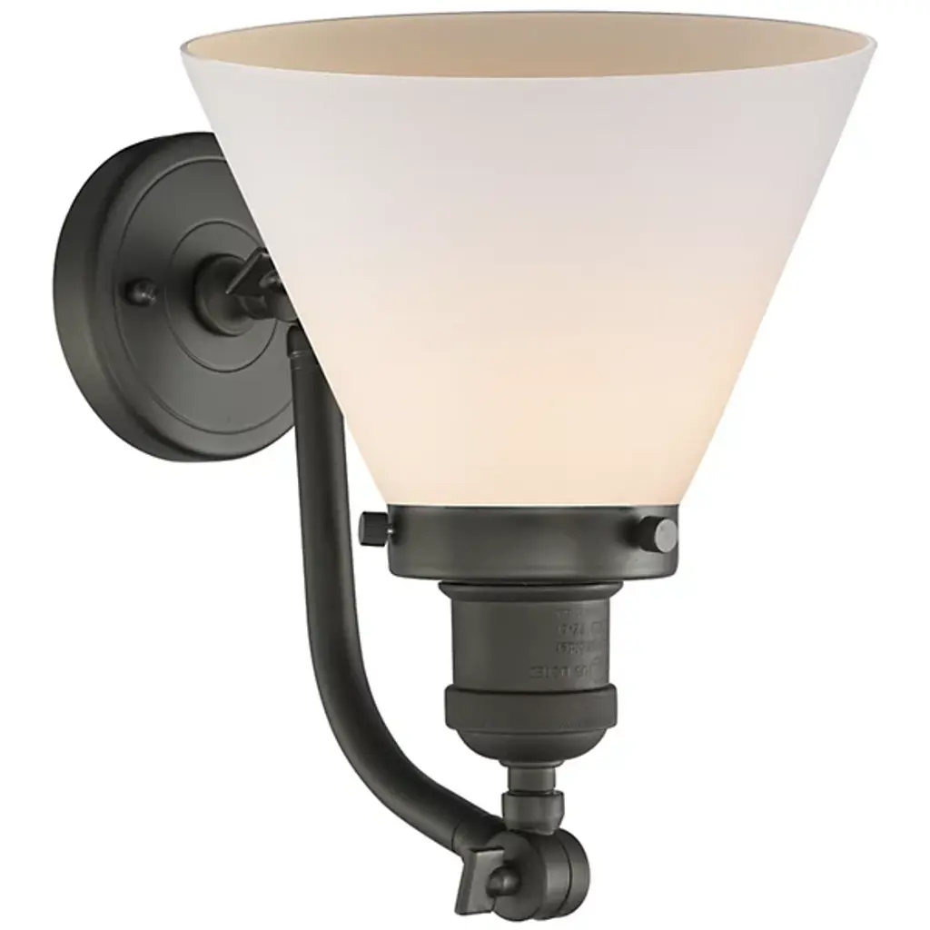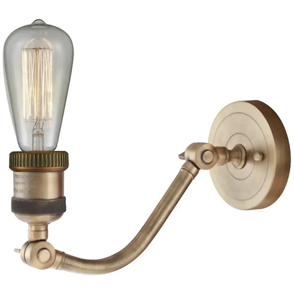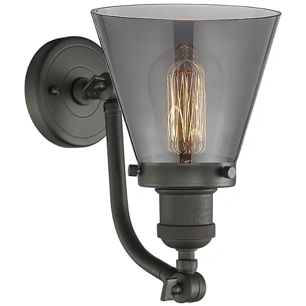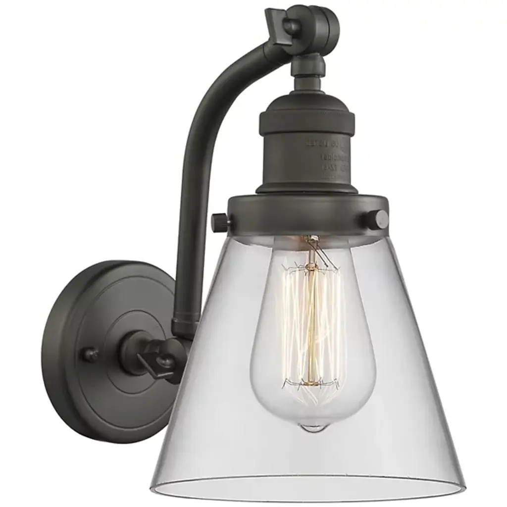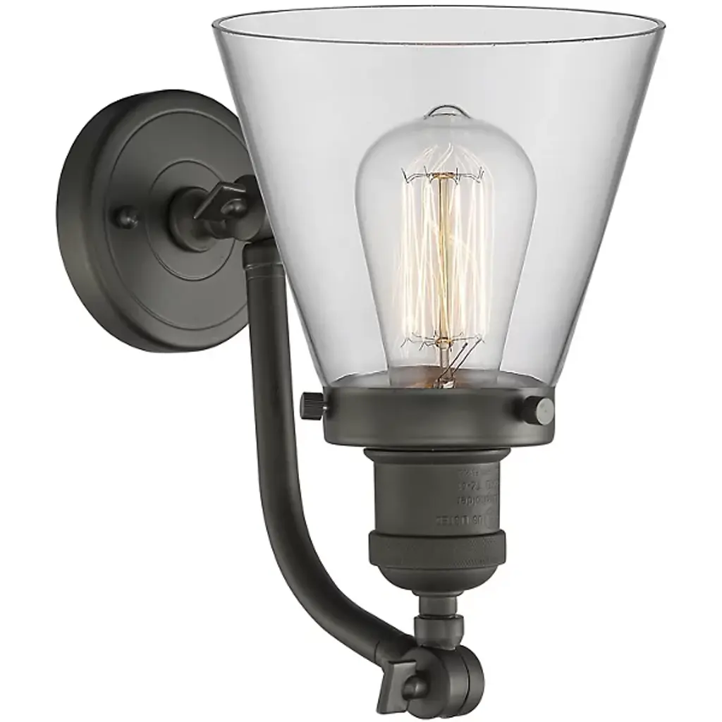 The Zachary Glass Curved Arm Wall Sconce by Alder & Ore brings vintage industrial charm to home or office lighting. A Bruno Marashlian design, this versatile steel and cast brass wall light features a curved arm with lockable swivels on each end. This allows for the light depth and lamp configuration to change as needed. Showcasing glass cone shades, this indoor wall sconce shines as decorative lighting in a living room, dining room, foyer, or hallway.