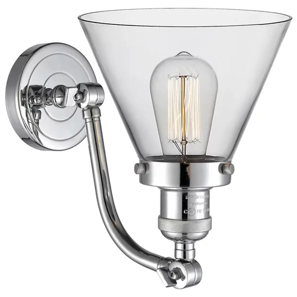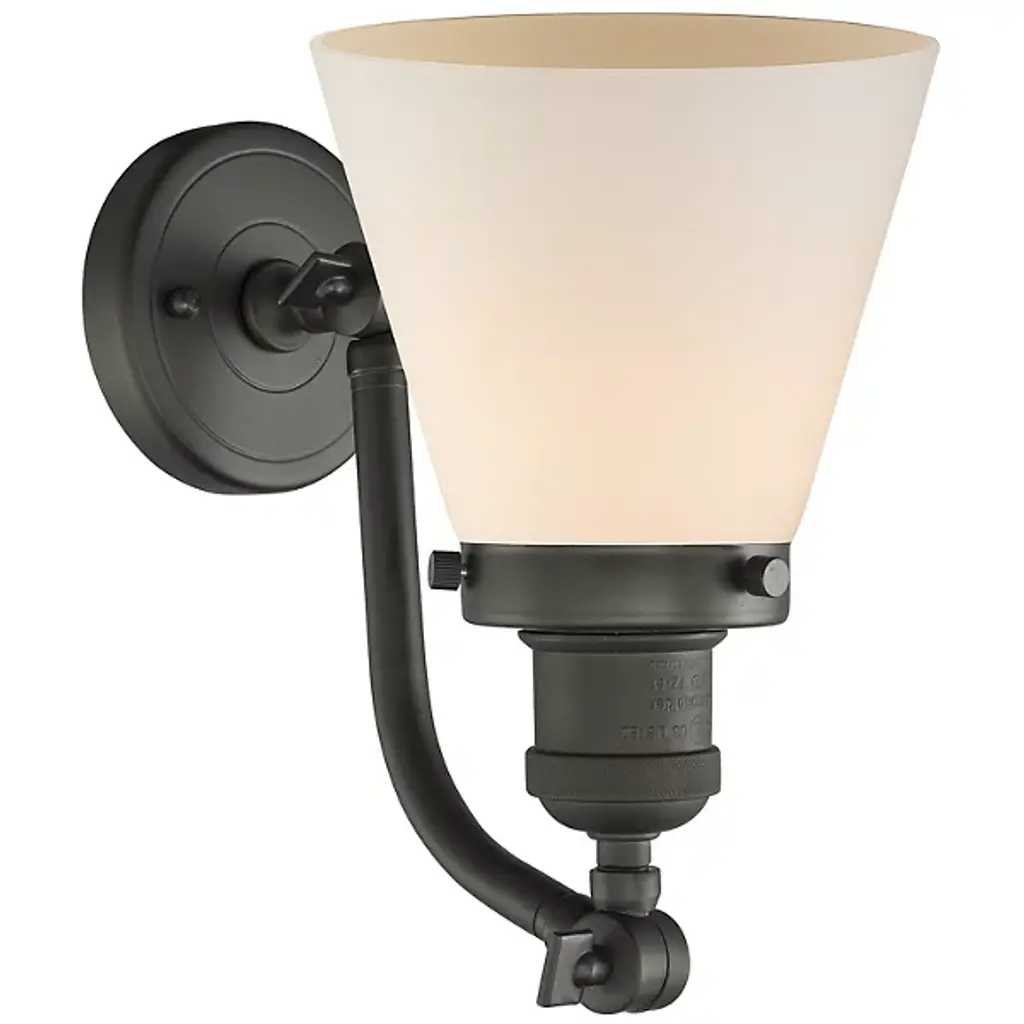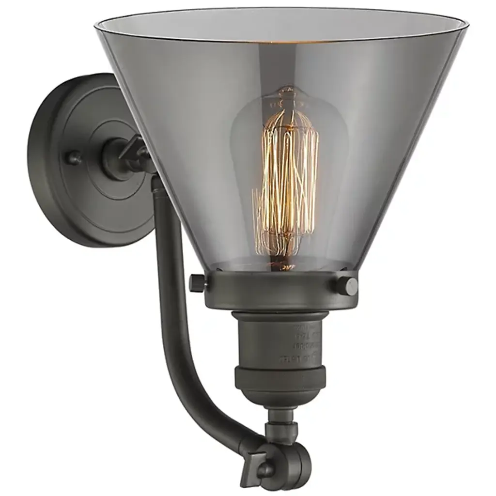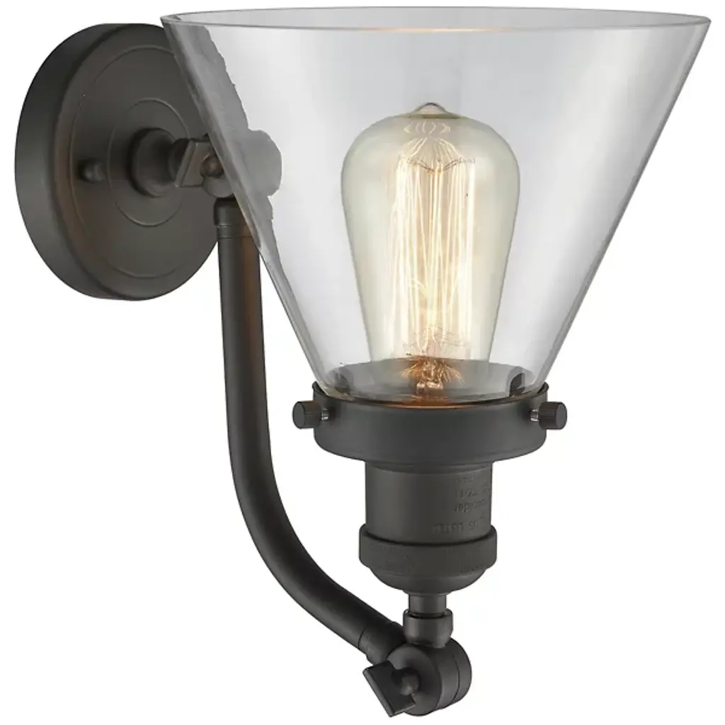 The Zachary Glass Curved Arm Wall Sconce by Alder & Ore brings vintage industrial charm to home or office lighting. A Bruno Marashlian design, this versatile steel and cast brass wall light features a curved arm with lockable swivels on each end. This allows for the light depth and lamp configuration to change as needed. Showcasing glass cone shades, this indoor wall sconce shines as decorative lighting in a living room, dining room, foyer, or hallway.