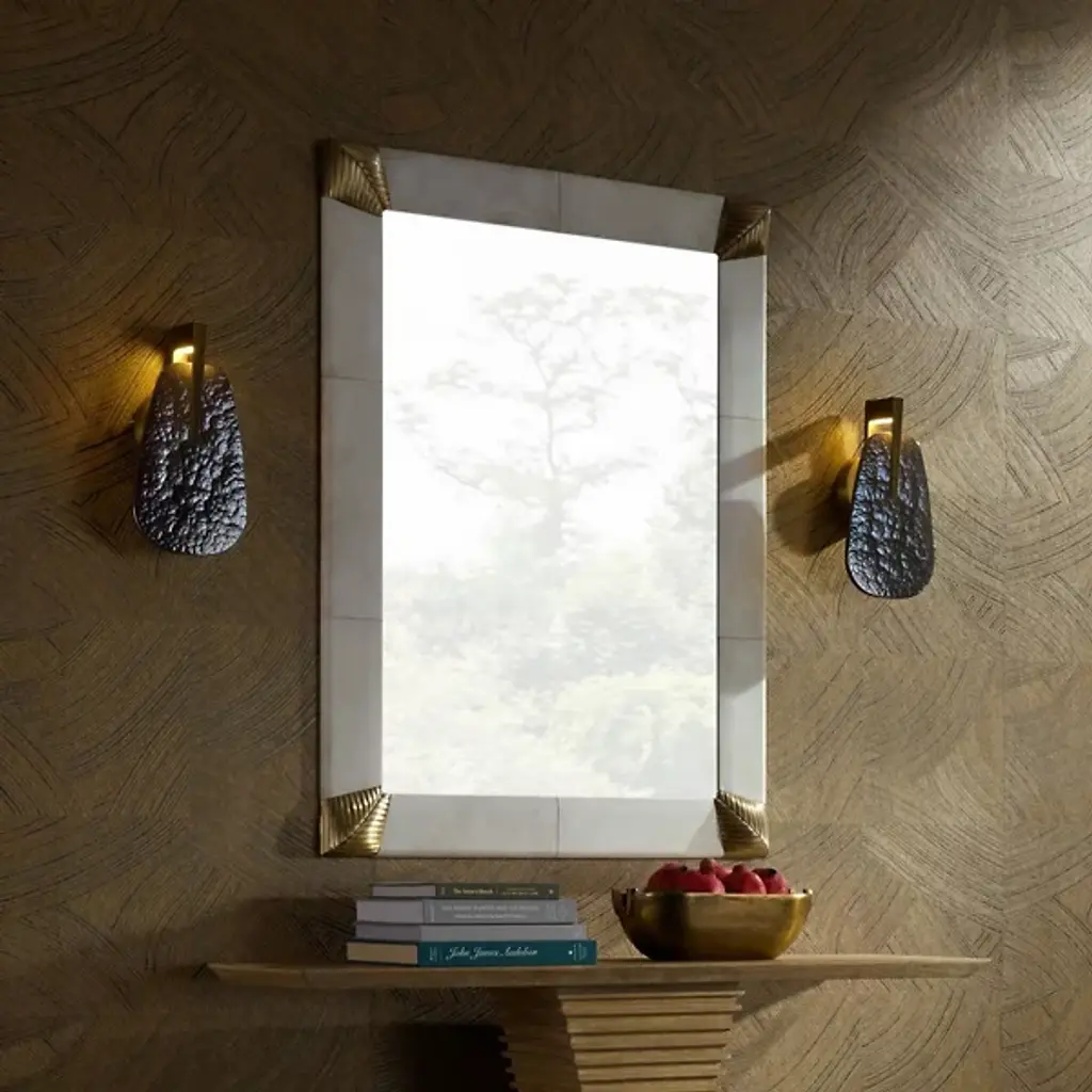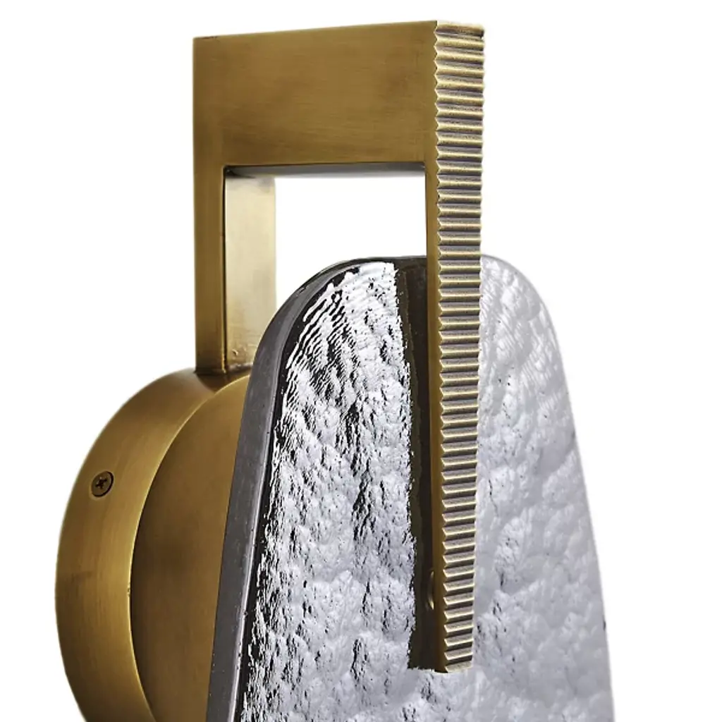 Zelda LED Wall Sconce by Arteriors exudes an Art Deco-inspired allure, channeling the bold geometry and opulent details found in Art Deco jewelry. The layered, elegant shape features an integrated LED concealed behind a slump glass shade, complemented by an elegant antique brass iron hardware detail. ADA-compliant and Damp-rated, its versatile design suits retro styles and is tough enough to survive exposure in limited covered outdoor conditions. With iron as the primary material holding the shade in place, the contoured arm contrasts with the fluid glass, which transforms light from within, offering a sophisticated lighting solution with a touch of vintage glamour.